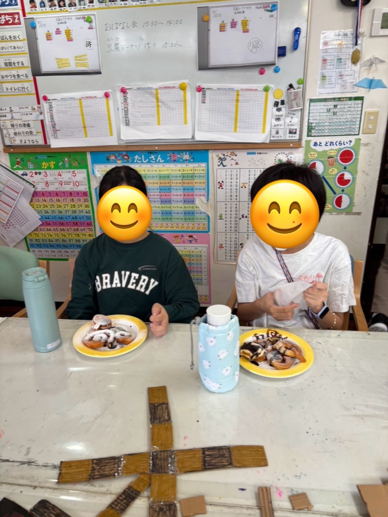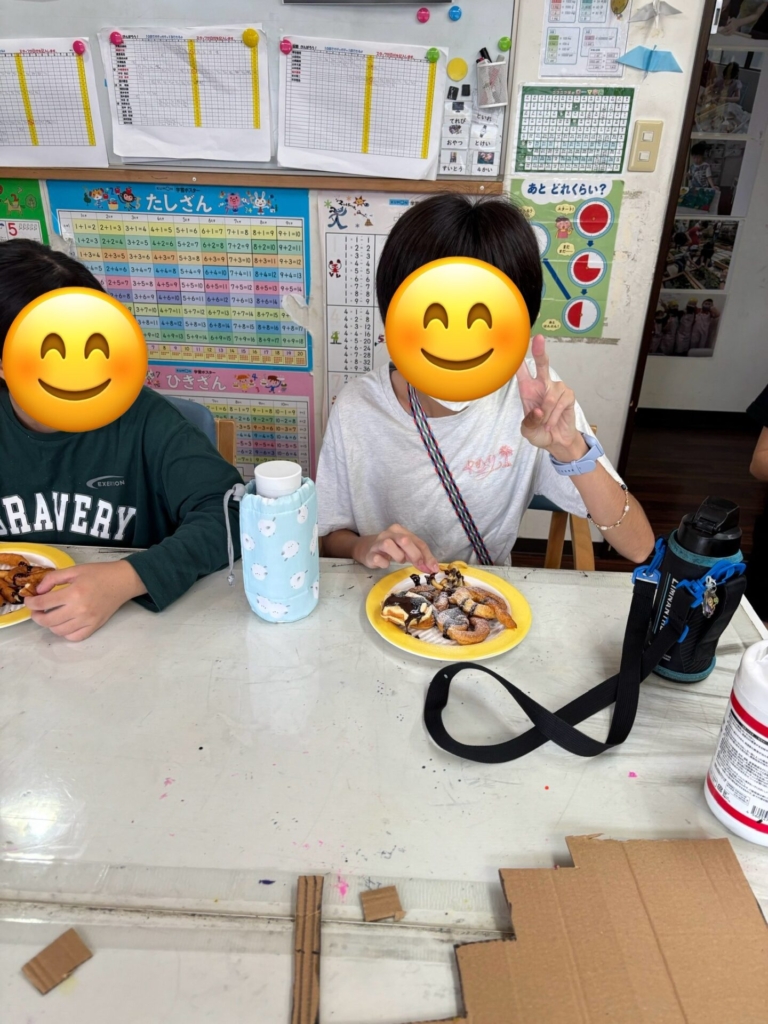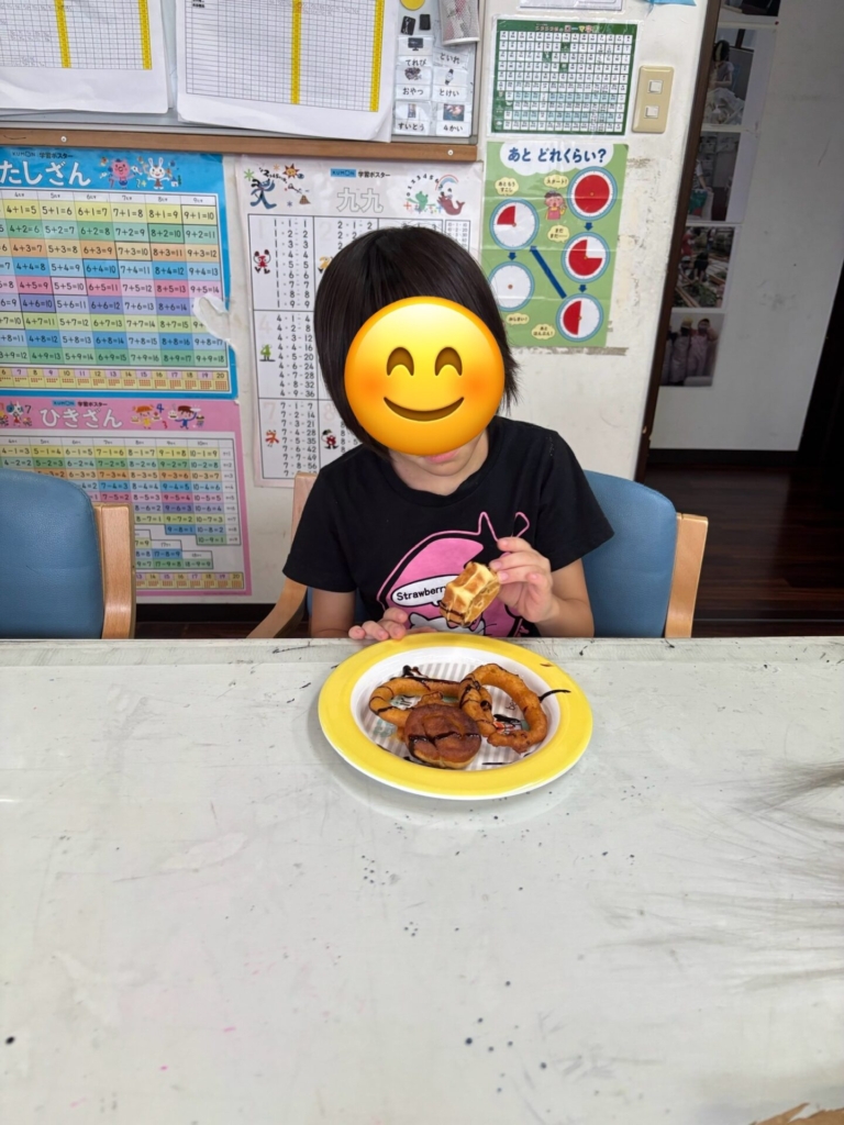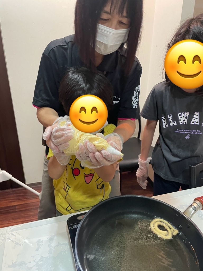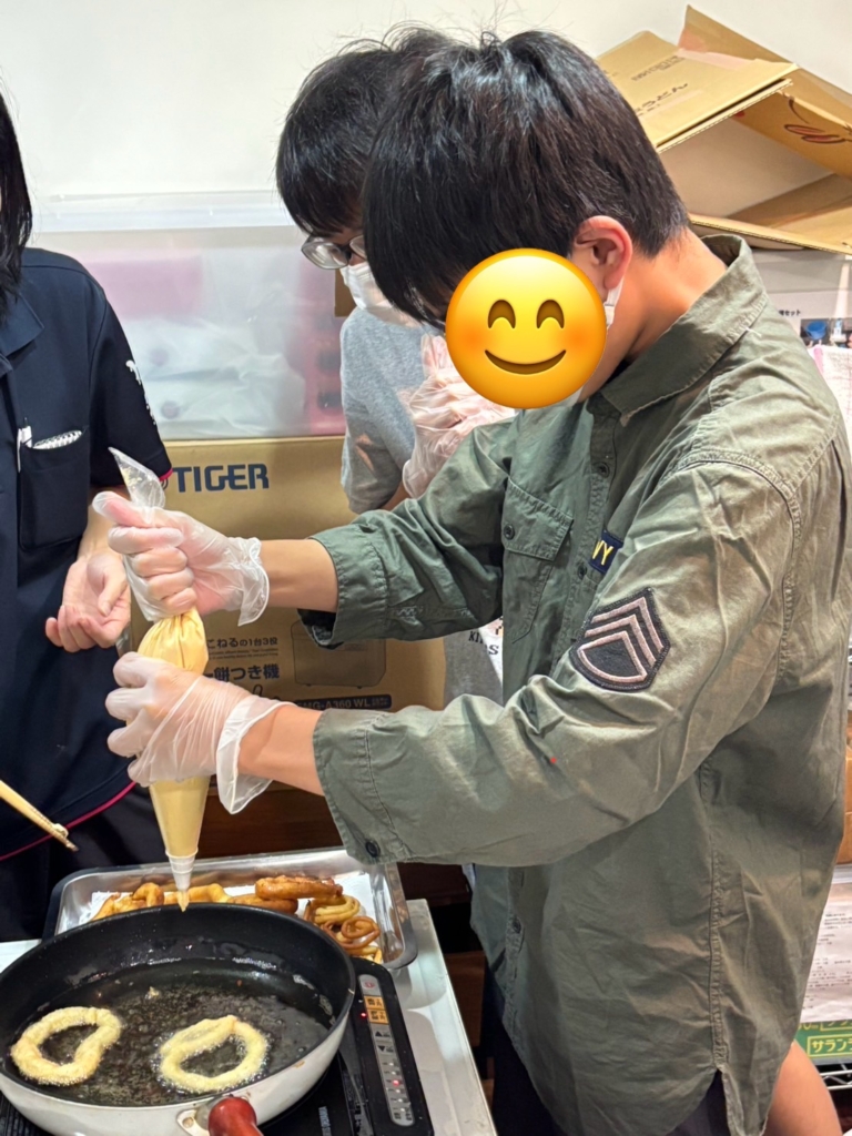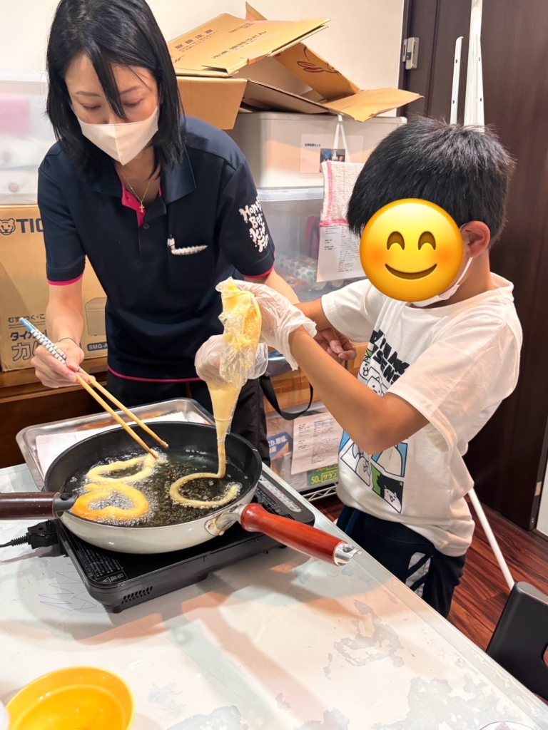 油で揚げた瞬間に広がる香ばしい香りに包まれ、揚げ色がつくと「かわいい!」「おいしそう!」と笑顔があふれました。完成後はみんなで味わいました。