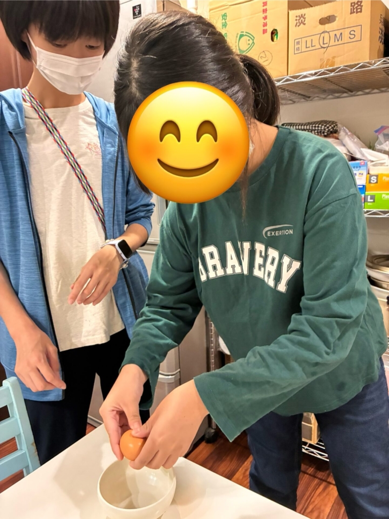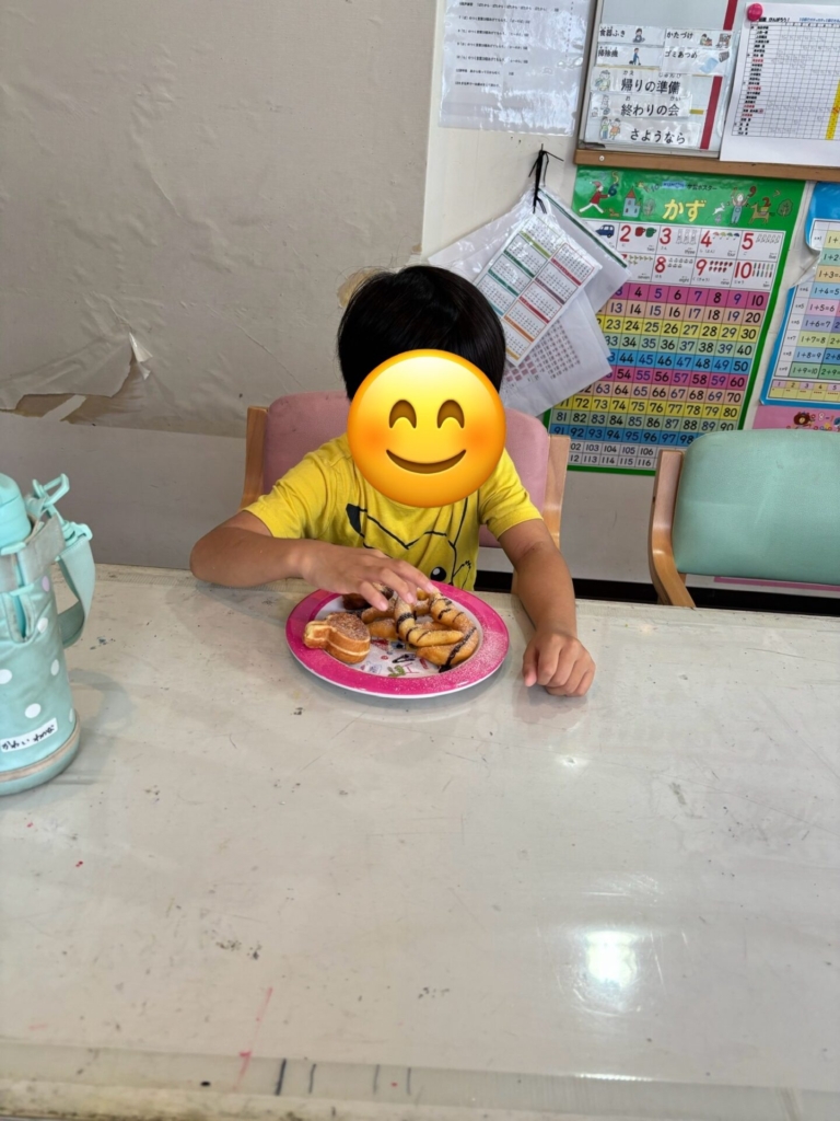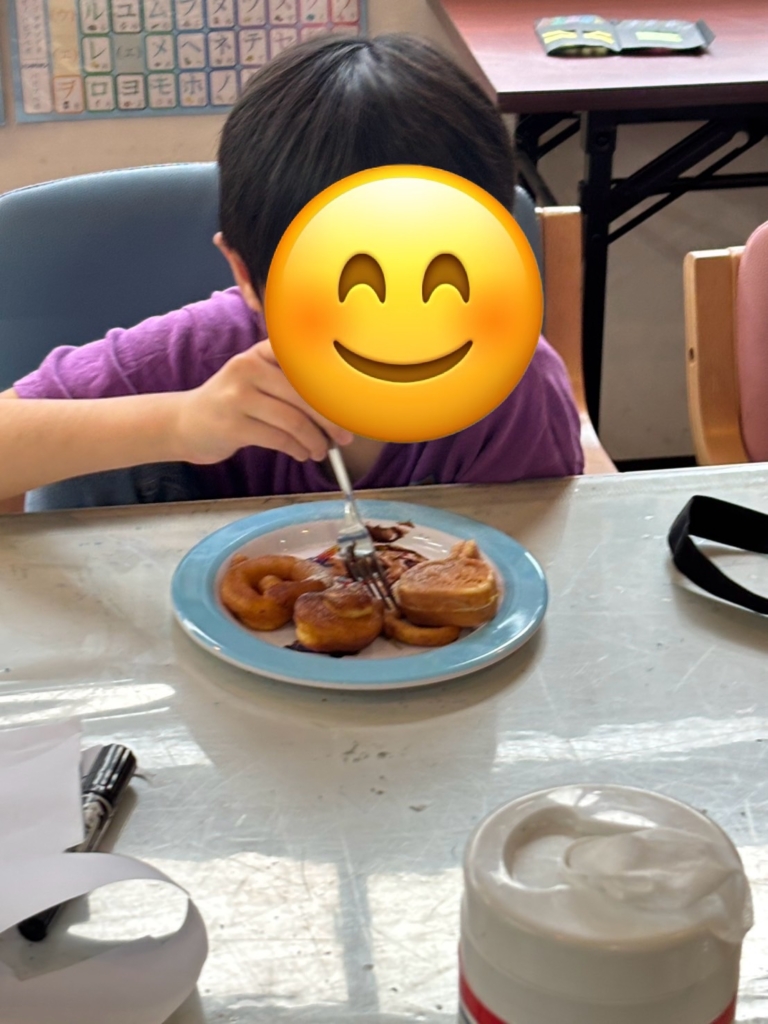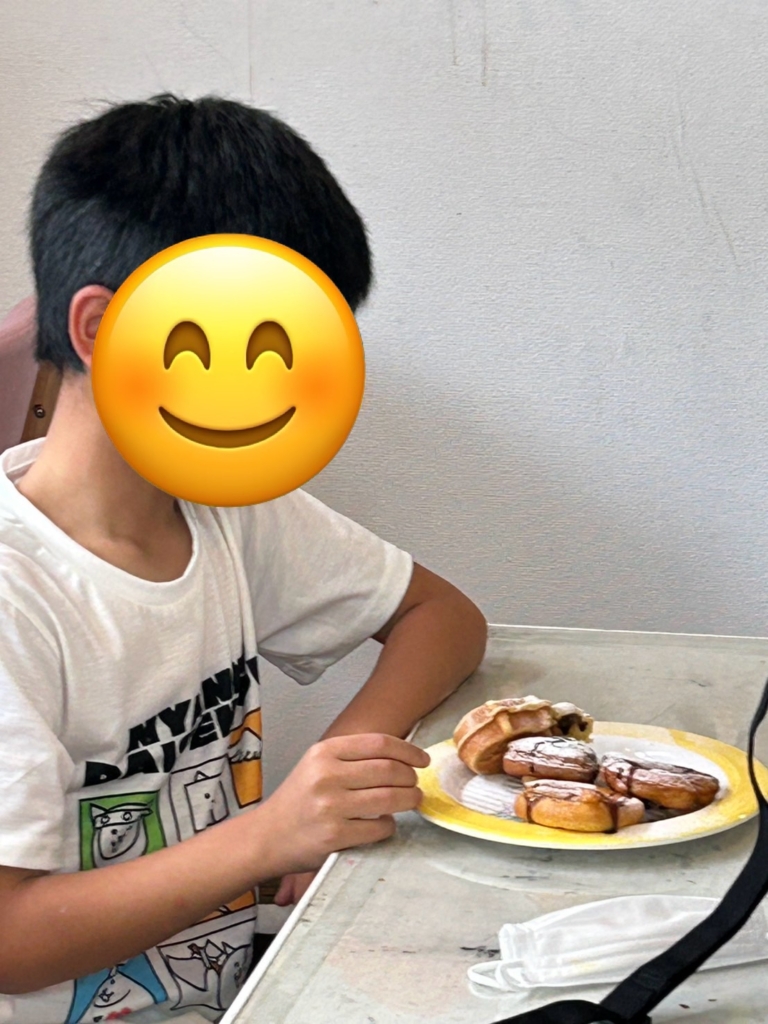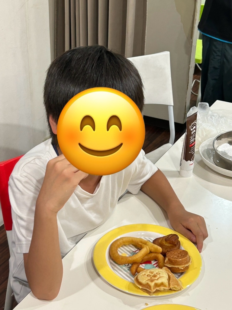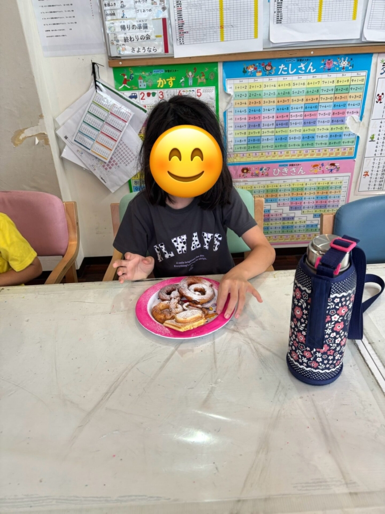 油で揚げた瞬間に広がる香ばしい香りに包まれ、揚げ色がつくと「かわいい!」「おいしそう!」と笑顔があふれました。完成後はみんなで味わいました。