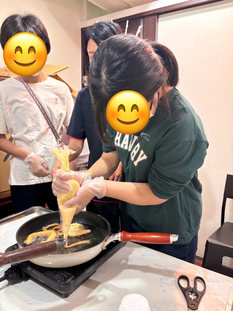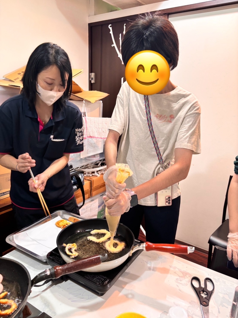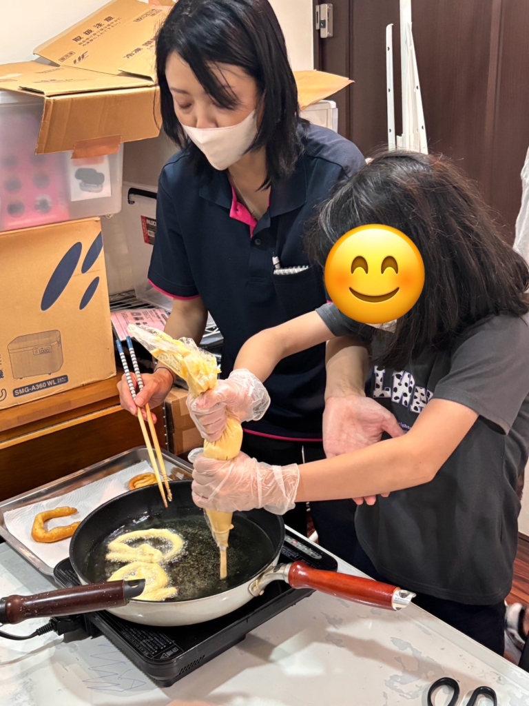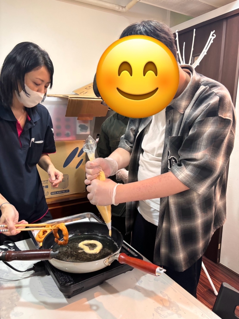 材料の計量や豆腐をつぶす作業、絞り袋を使って丸やハートに油であげる工程まで、スタッフの先生とともに一つひとつの手順を丁寧にこなしていきました。
