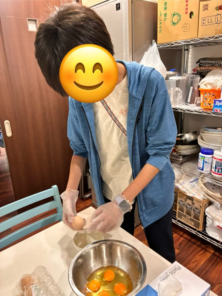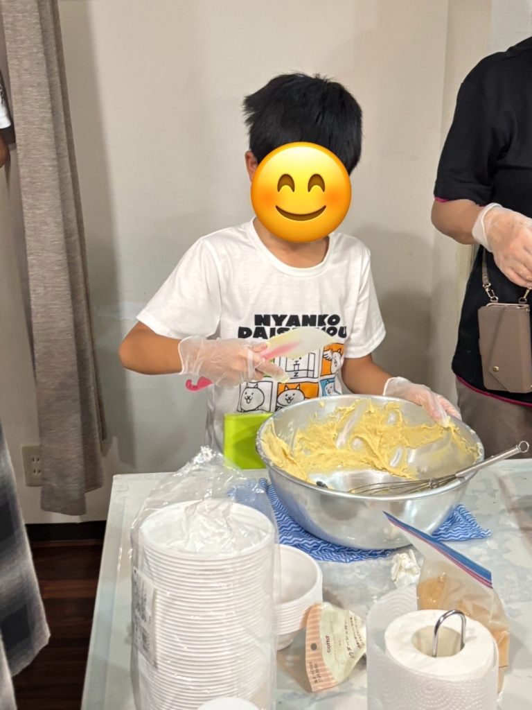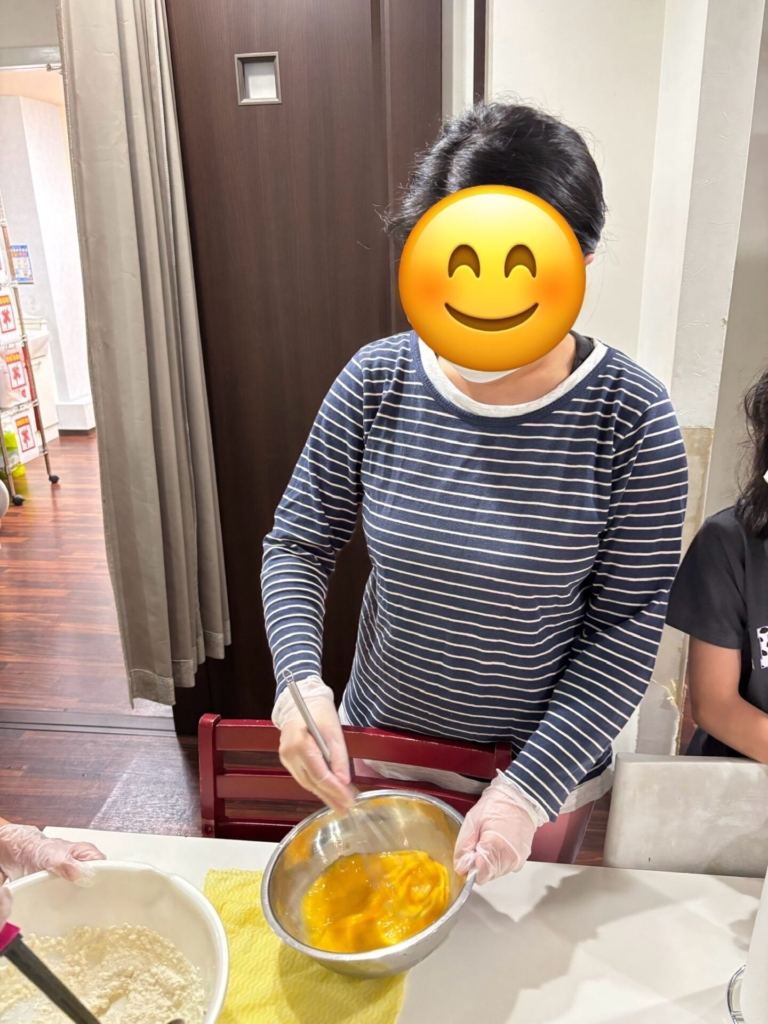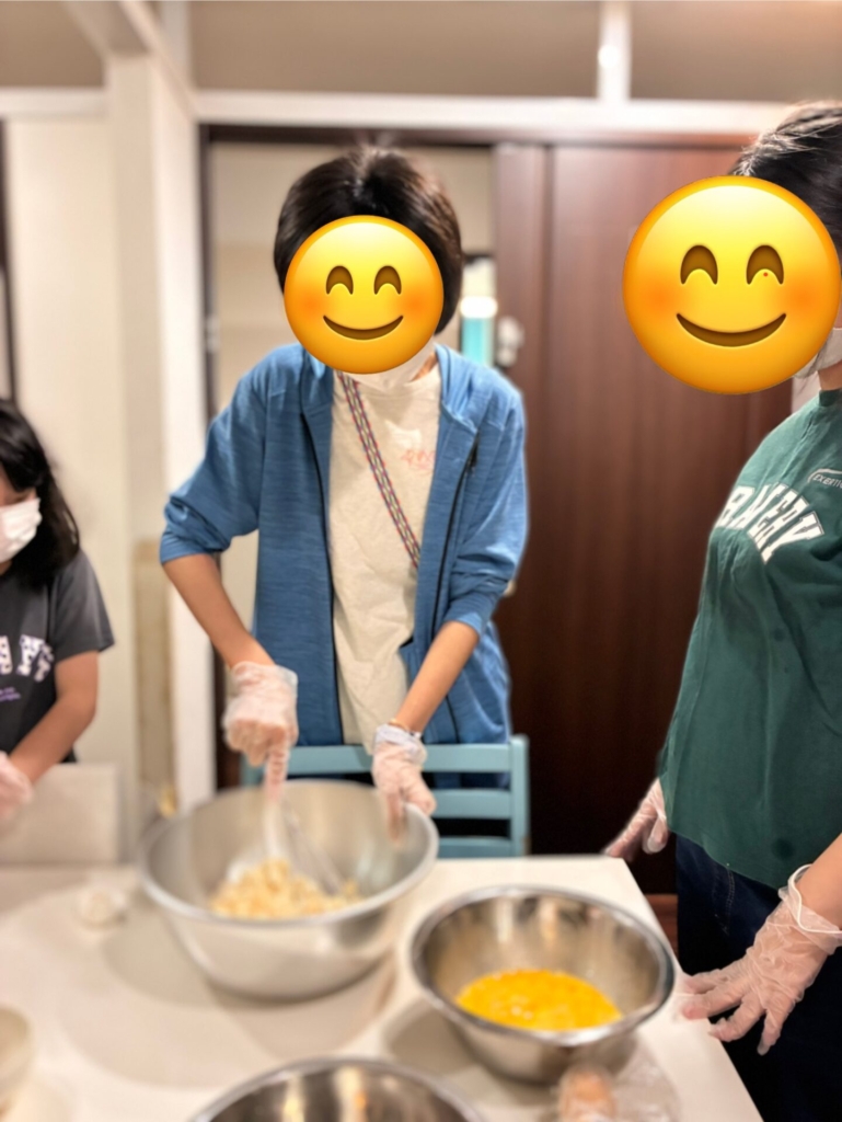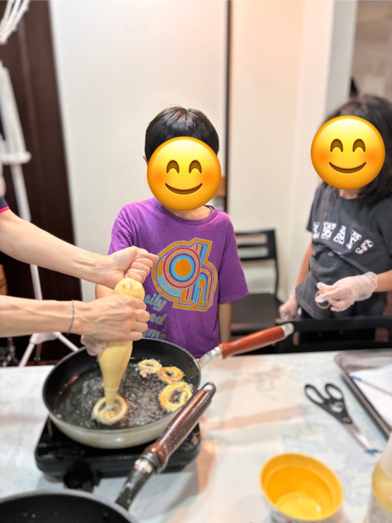 材料の計量や豆腐をつぶす作業、絞り袋を使って丸やハートに油であげる工程まで、スタッフの先生とともに一つひとつの手順を丁寧にこなしていきました。