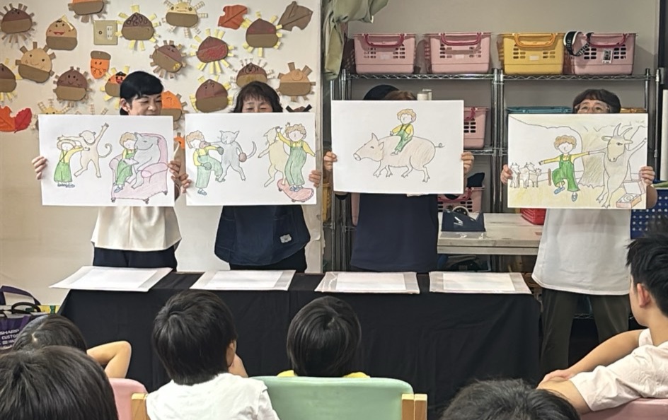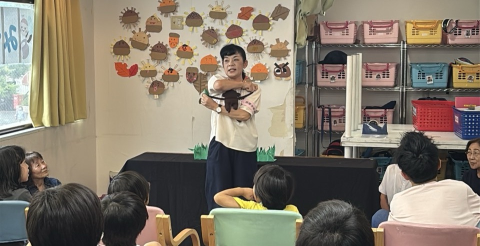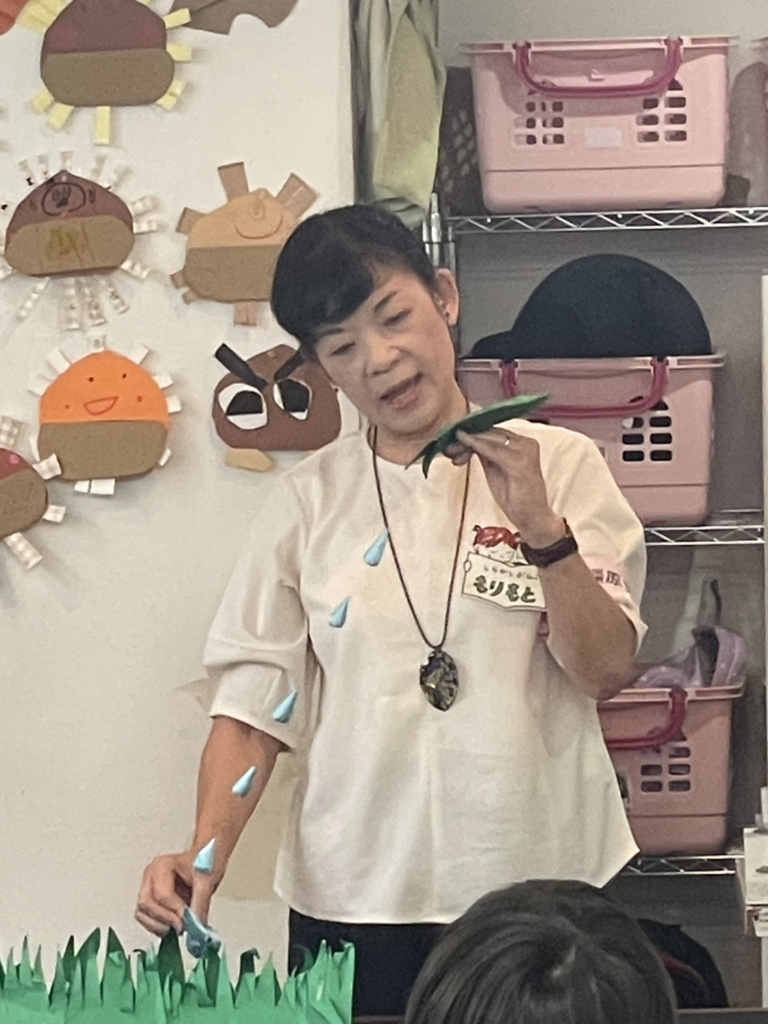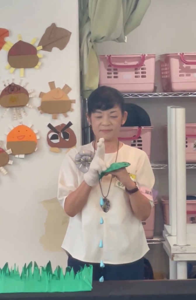 子どもたちは、「次はなんだろう?」「あれは何かな?」と目を皿のようにして舞台に集中!フェルトの動物たちが動き出すたびに、小さなどよめきや歓声が起こり、会場全体が期待とワクワク感で満たされていました。動物たちがニョロニョロ、ひょこひょこと動くたびに、子どもたちの瞳はキラキラと輝き、お話の世界に引き込まれている様子が手に取るように分かりました!