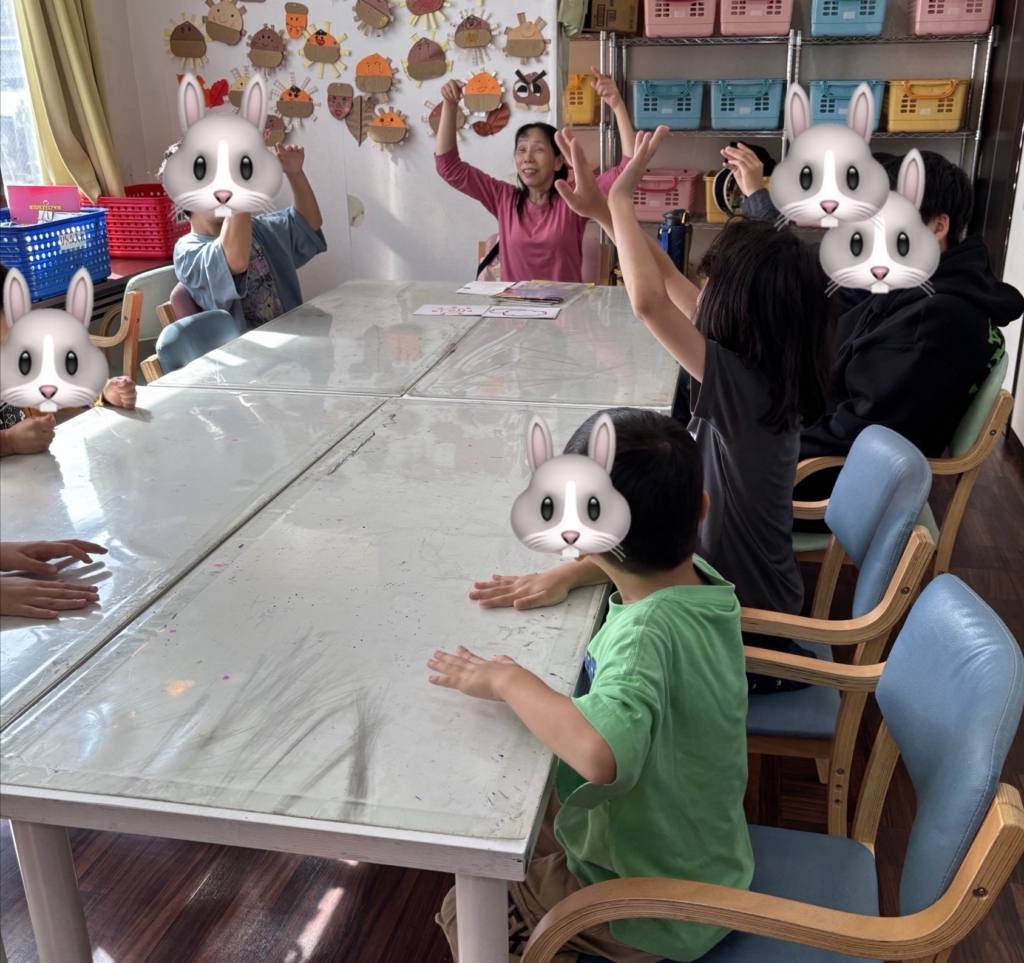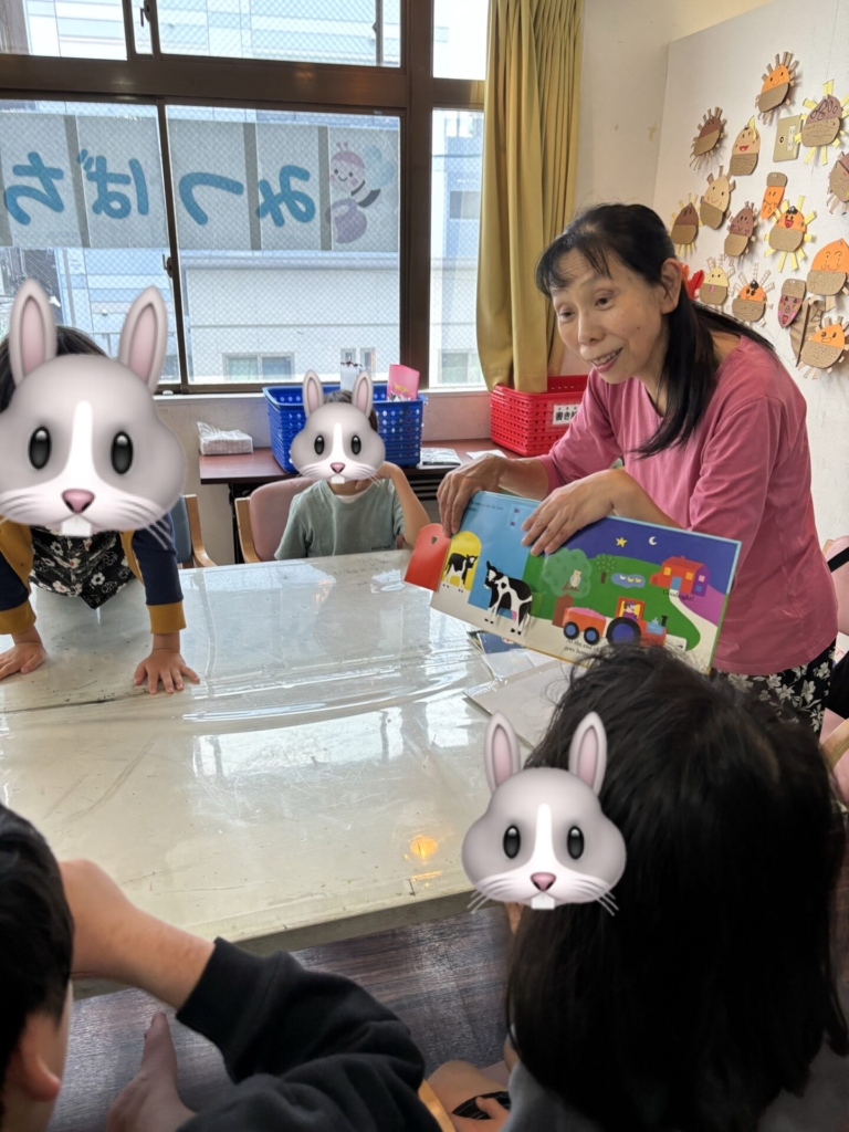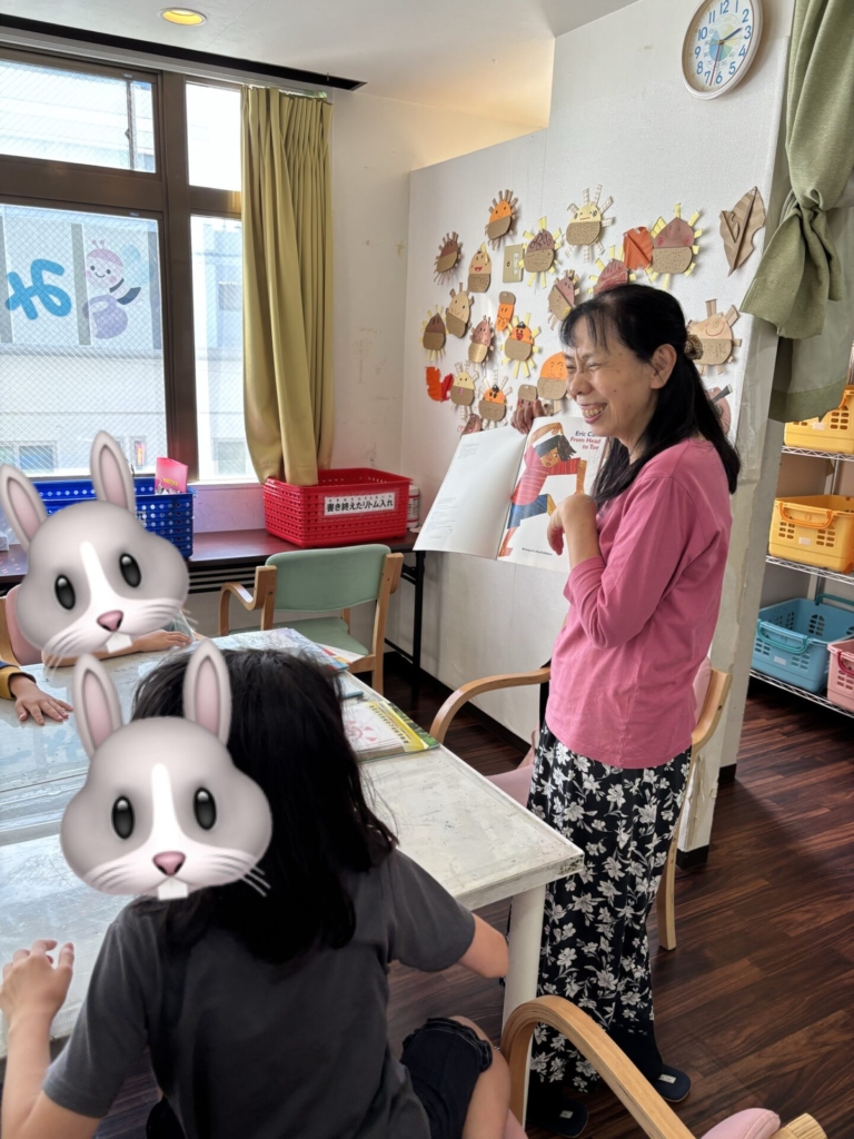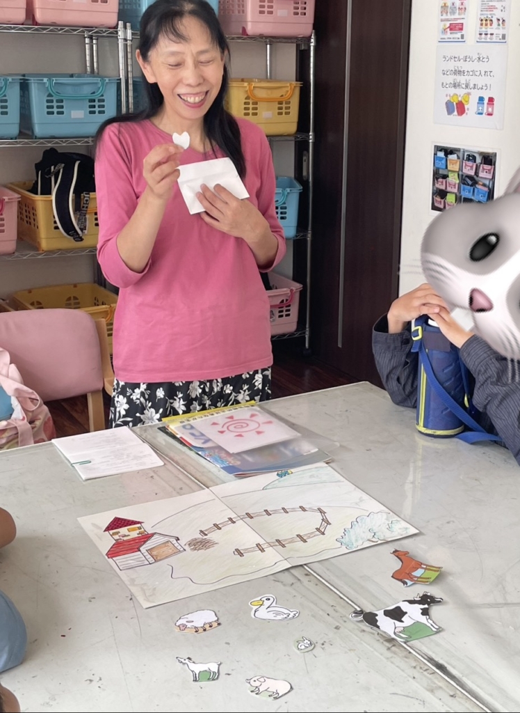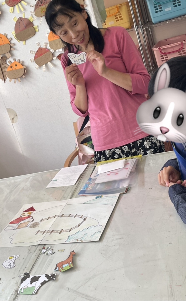 秋の季節に合わせて、栗(chestnut)やスイートポテト(sweet potato)といった秋ならではの言葉や、牛・豚・アヒル・羊・馬・うさぎ・鶏・ひよこ・犬・トンボ・りす・蝶々などの動物の名前を英語で覚えました。さらに、日本とは違う英語での鳴き声(例:duck → quack, dog → woof)も一緒に学び、言葉の違いに気づく体験もできました。