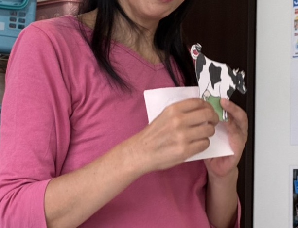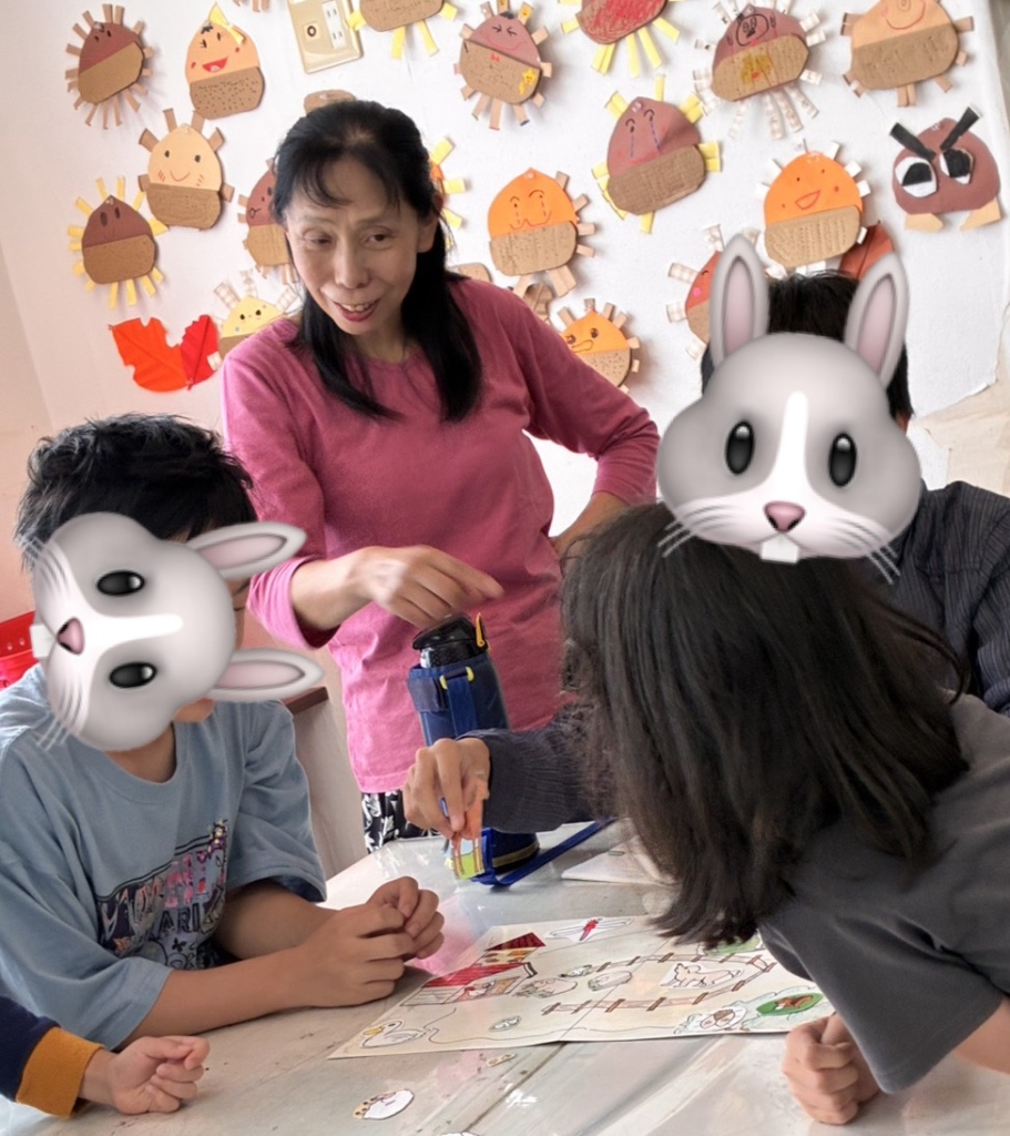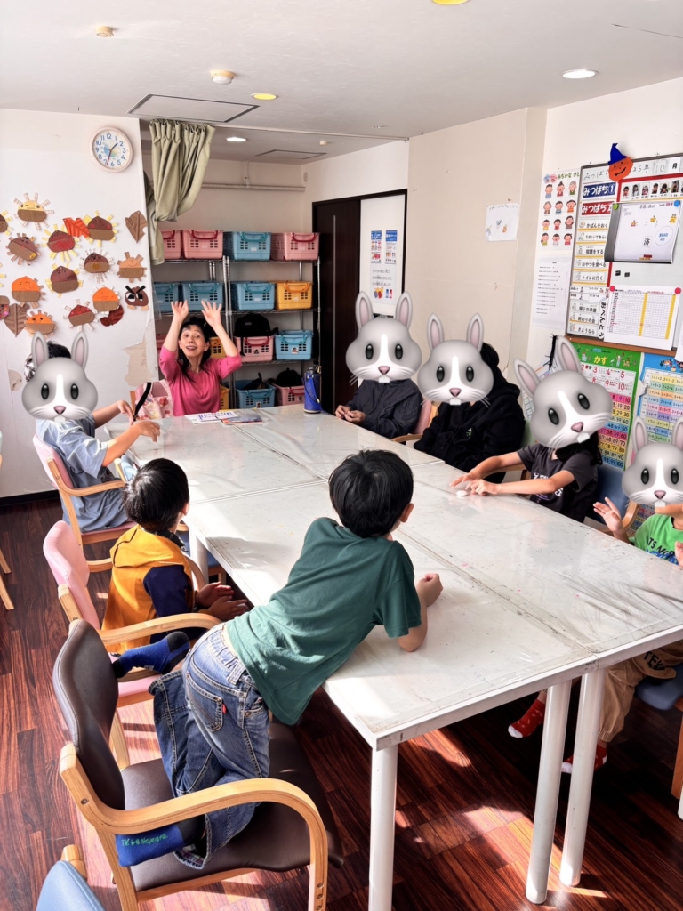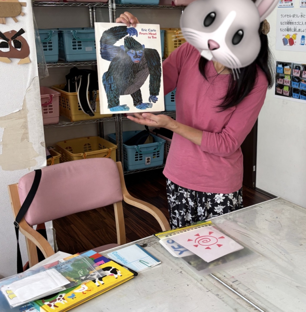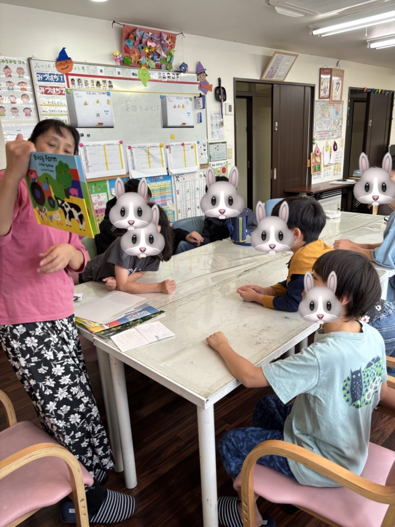 秋の季節に合わせて、栗(chestnut)やスイートポテト(sweet potato)といった秋ならではの言葉や、牛・豚・アヒル・羊・馬・うさぎ・鶏・ひよこ・犬・トンボ・りす・蝶々などの動物の名前を英語で覚えました。さらに、日本とは違う英語での鳴き声(例:duck → quack, dog → woof)も一緒に学び、言葉の違いに気づく体験もできました。
