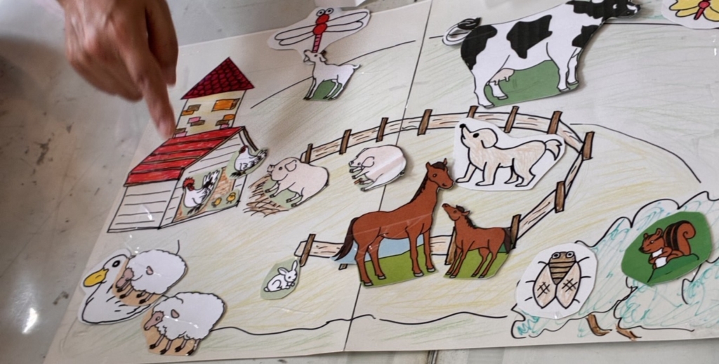 学んだことを遊びに組み込んだ、「鳴き声を聞いて英語で答える早取りゲーム」を行い、耳で聞いて瞬時に判断する力や記憶力の向上を目的にやってみました。次に、「どの動物がいなくなったでしょうゲーム」をして、記憶力や観察力を使いながら英語で答える練習をしました。