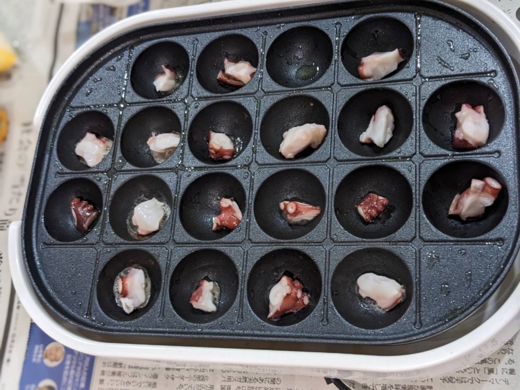 たこ焼き器に、まずは主役のタコ、そして筋肉、ちくわ、こんにゃく、ネギといったたくさんの具材を投入。
