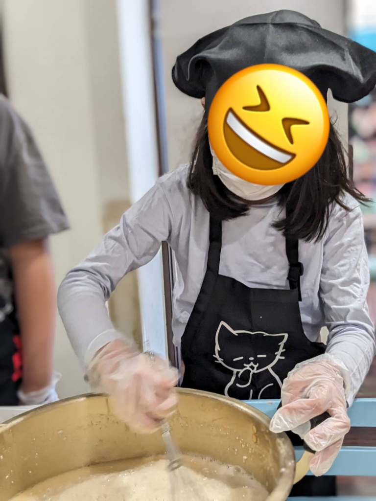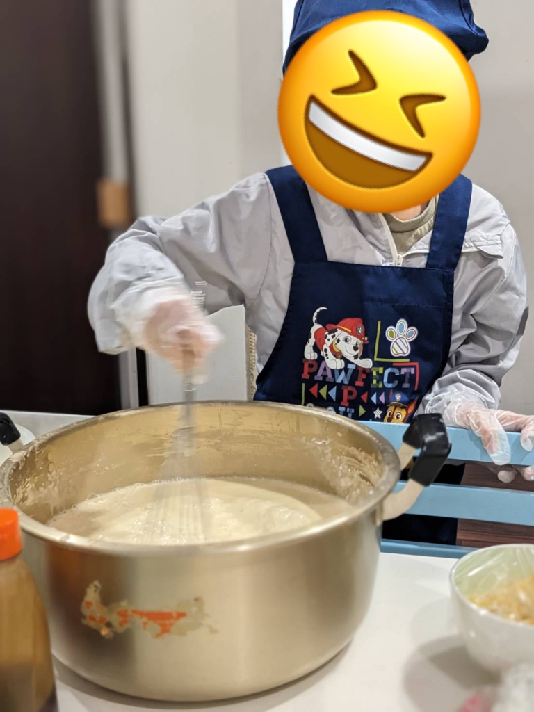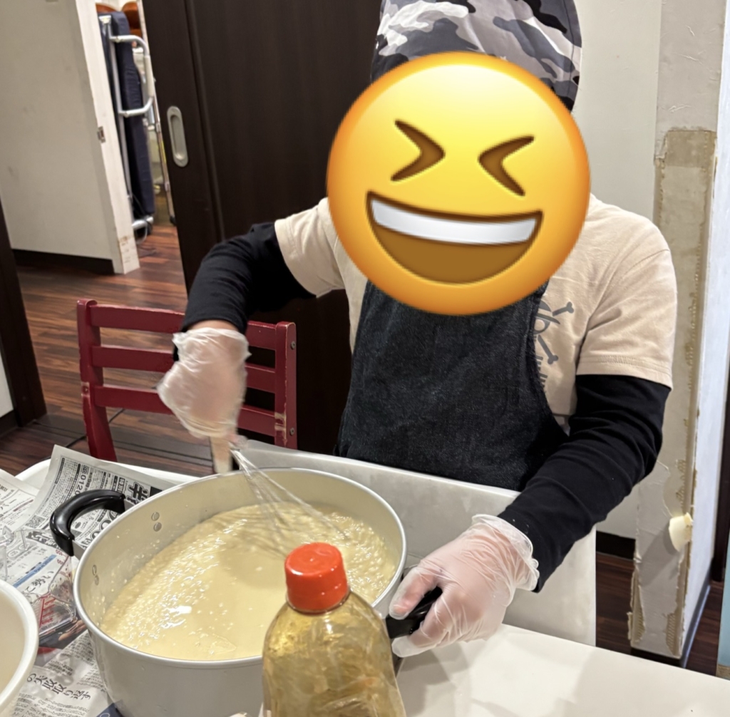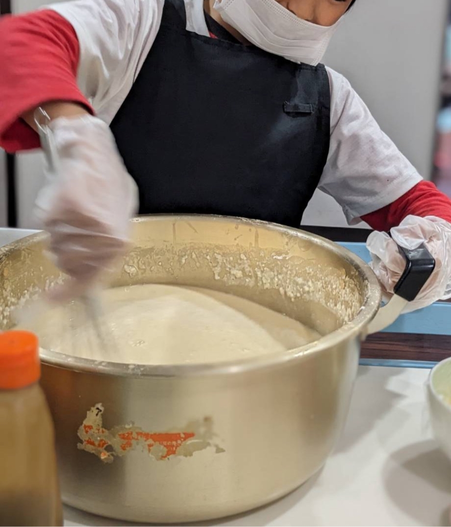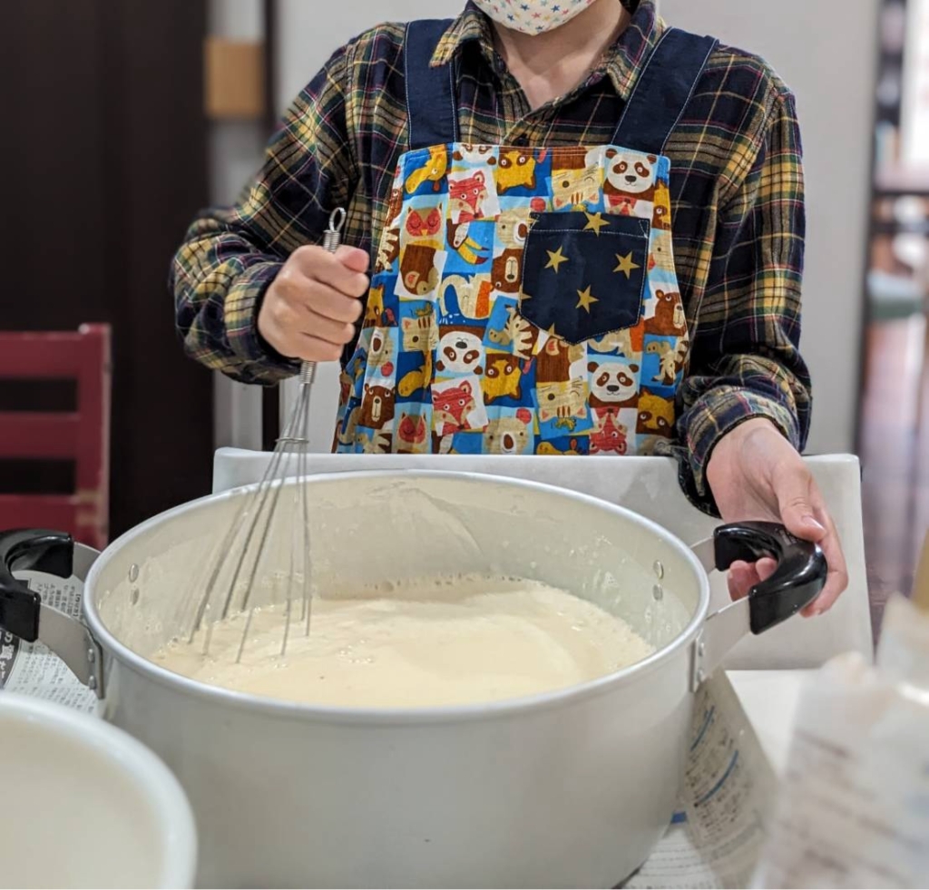 大きな鍋で、みんなで協力して生地を混ぜる様子は真剣そのもの。