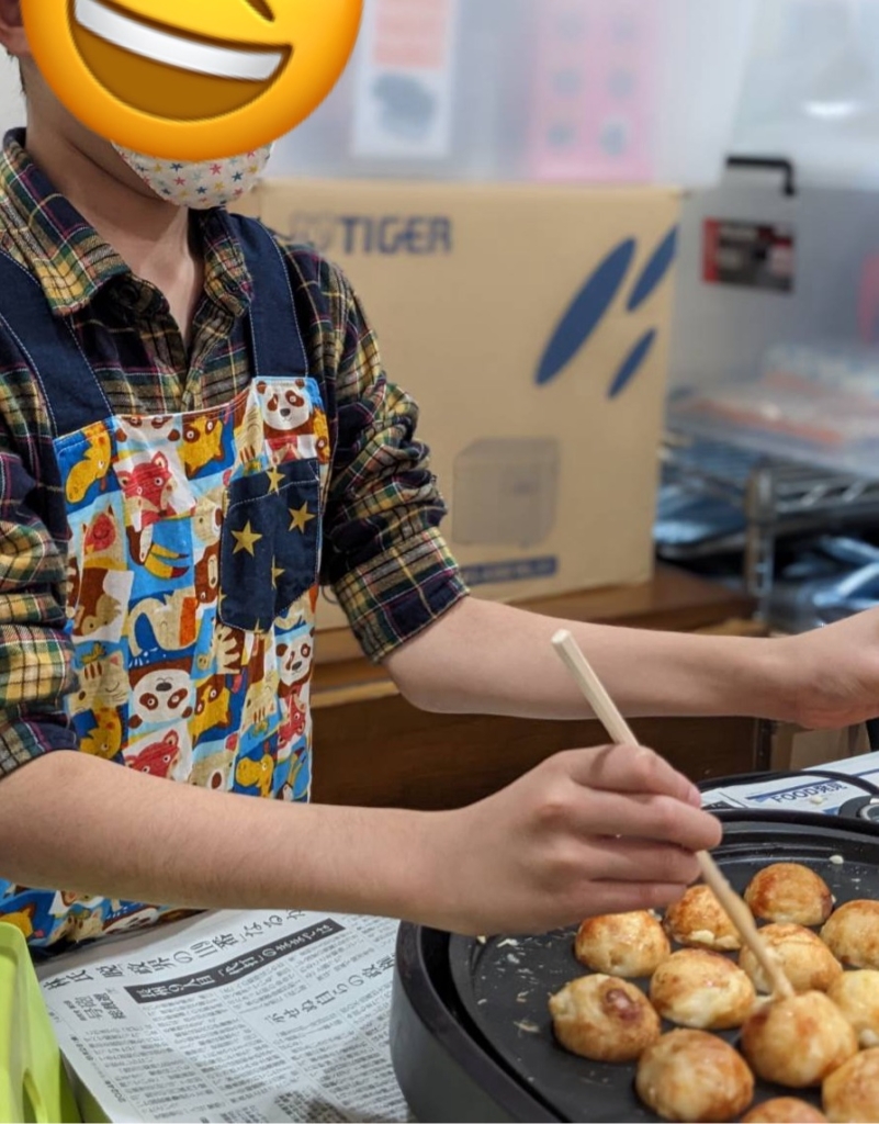 先生に教わりながら、だんだんと丸く、美味しそうな色に焼き上がっていくたこ焼きを見て、思わず笑顔がこぼれます。