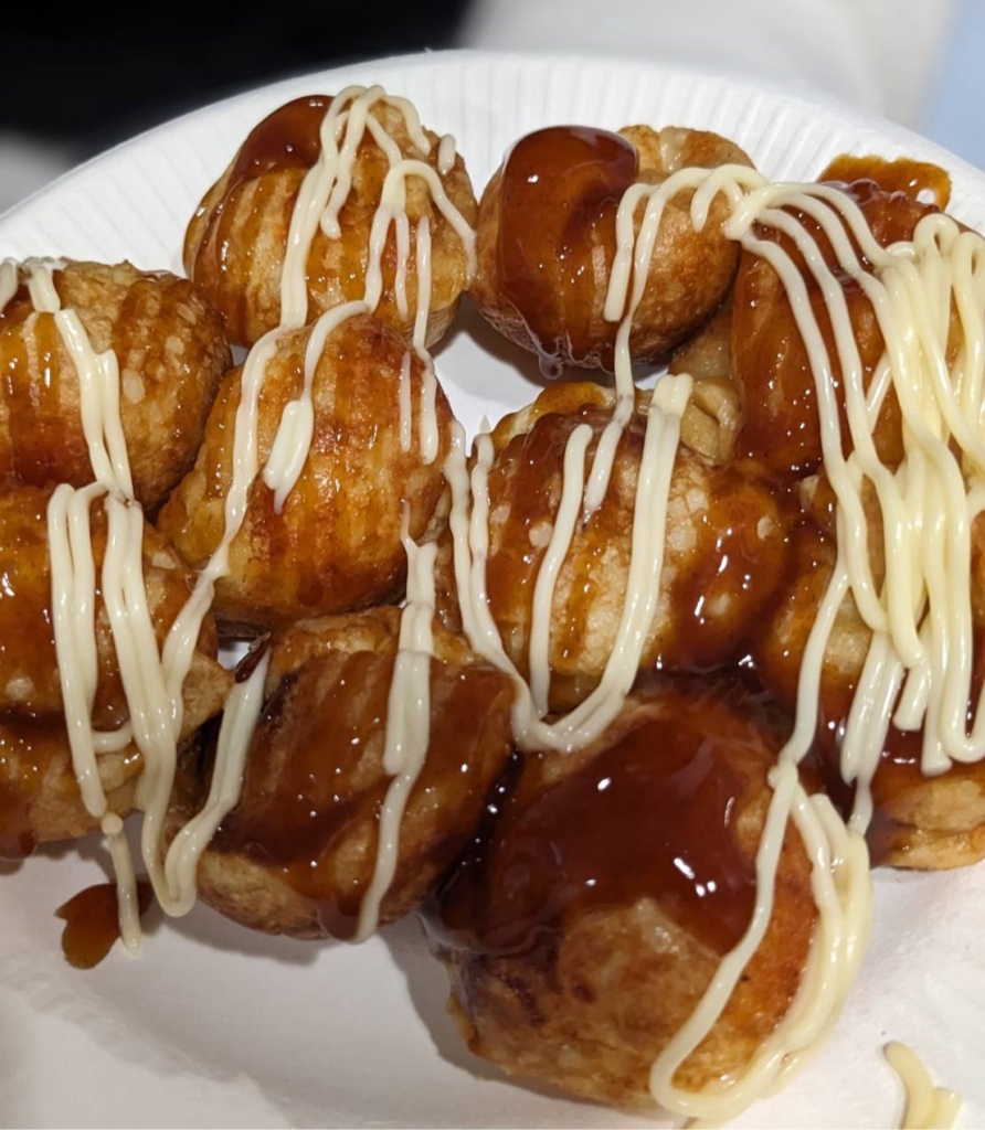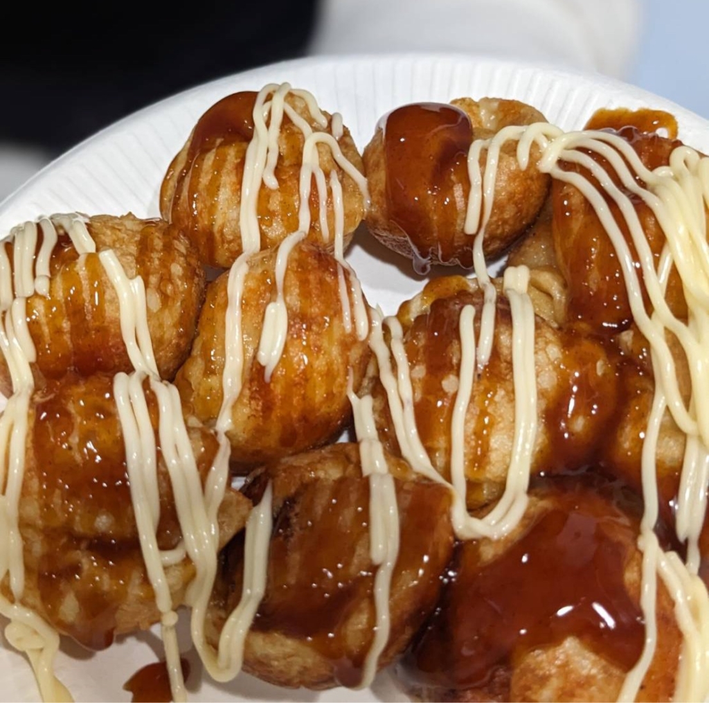 たっぷりとかけられたソースとマヨネーズが、たこ焼きの美味しさをさらに引き立てます。