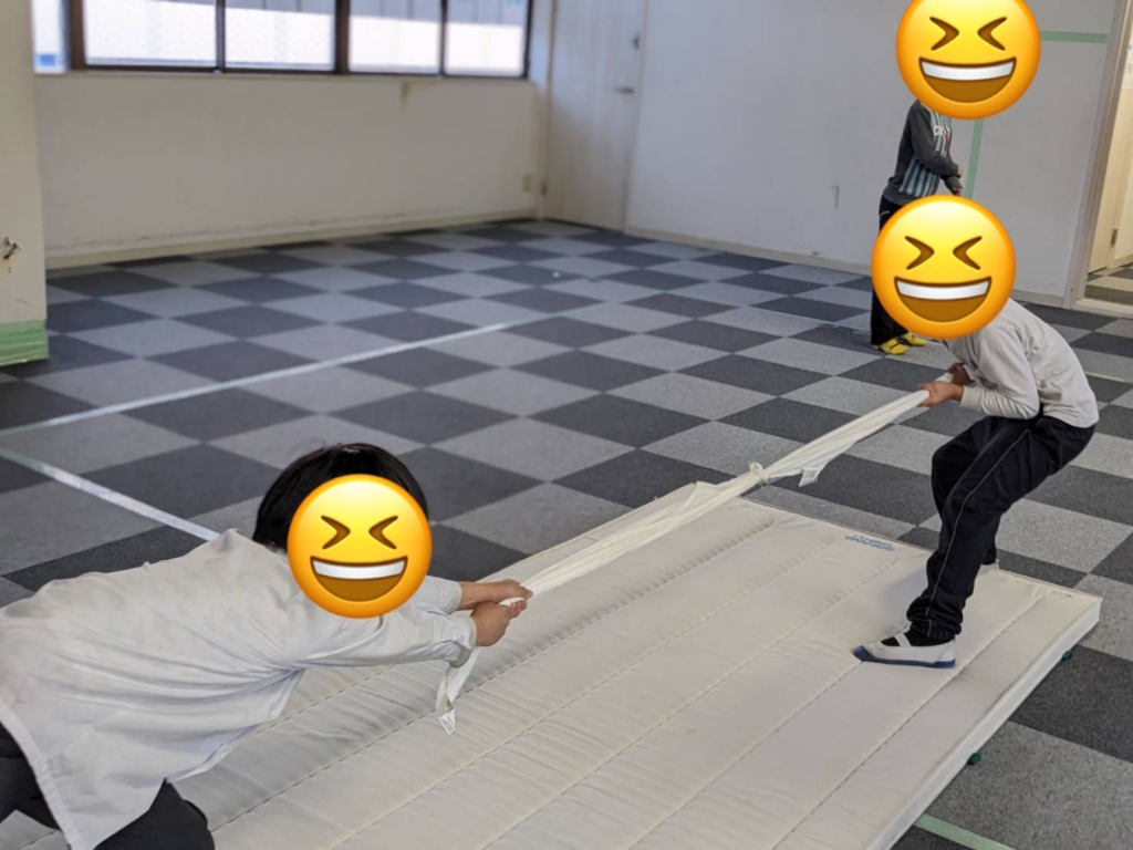 マットの上で行うことで転んでも痛くなく、安全に思いっきり力を出すことができます。日常生活ではなかなか出せない「全力の力」を出し切ることで、ストレス発散や情緒の安定にもつながります。