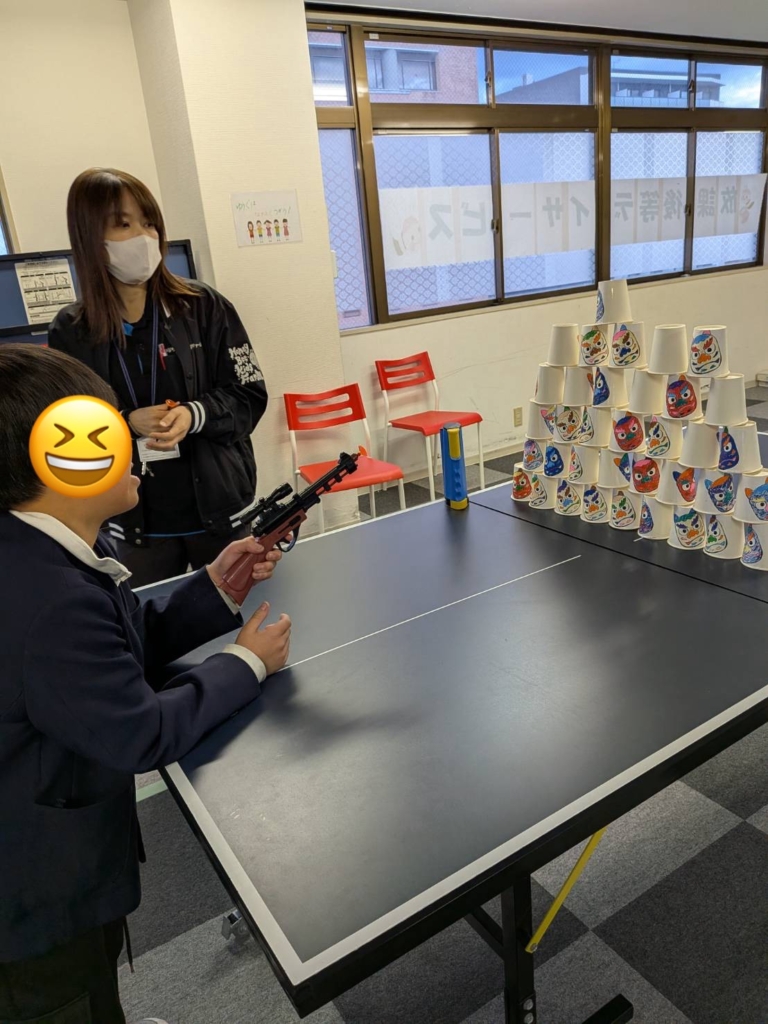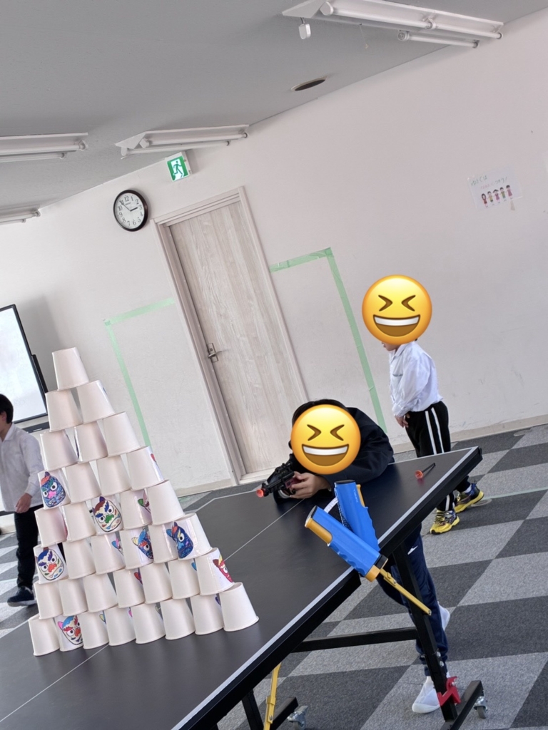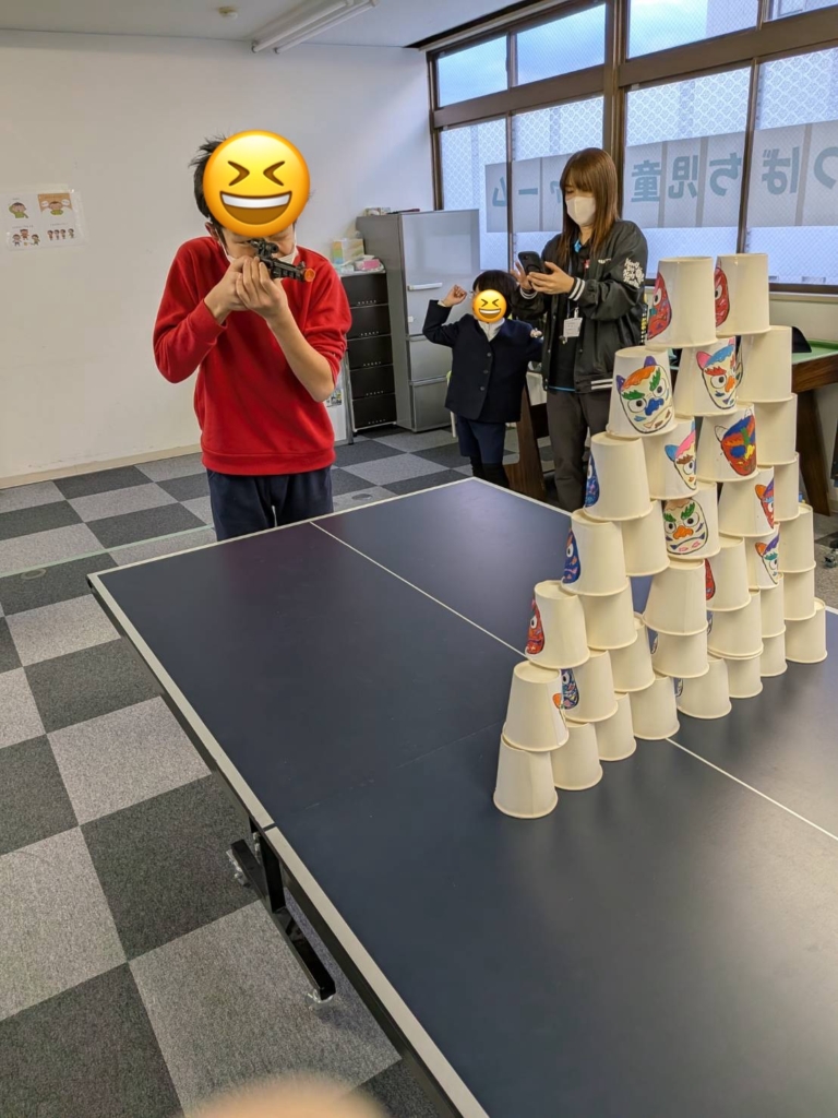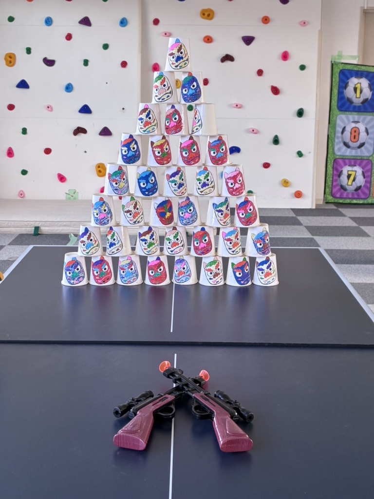 先日までは動く的に命中させる射的を楽しんでいましたが、今回は手作り紙コップを積み重ねたピラミッド(円錐形)を的にした射的を行いました。