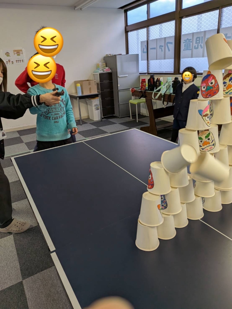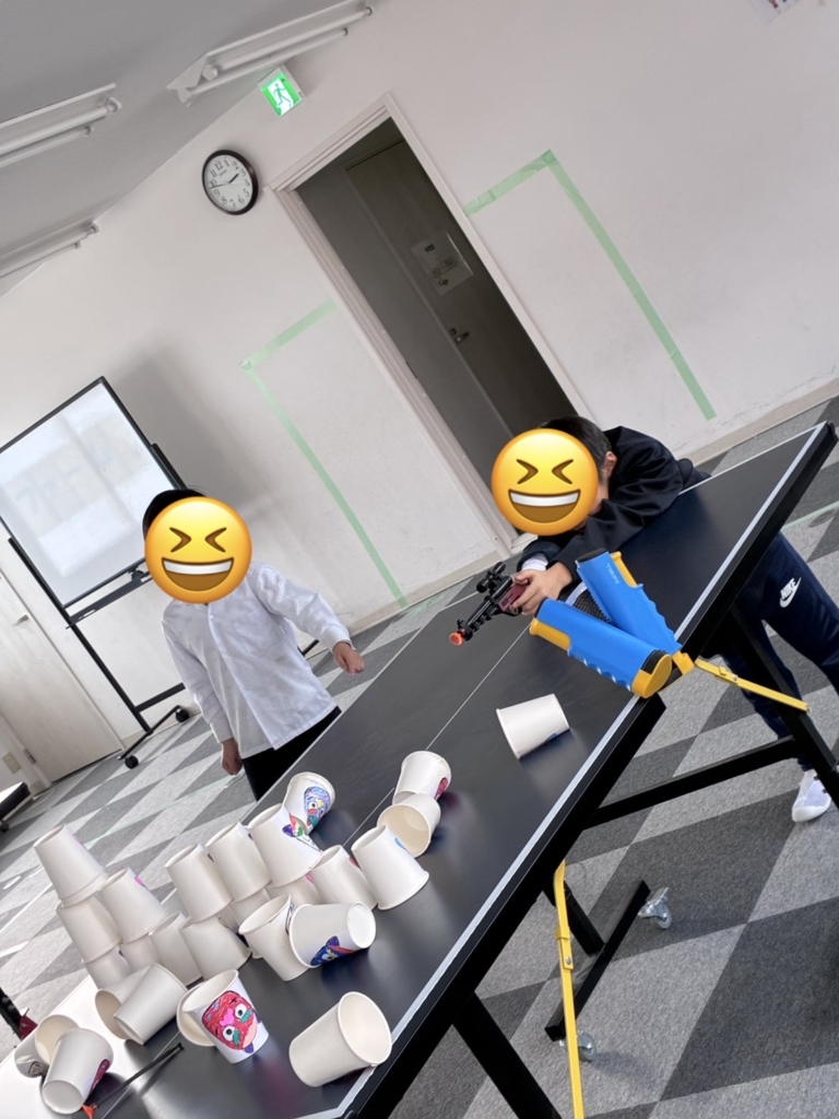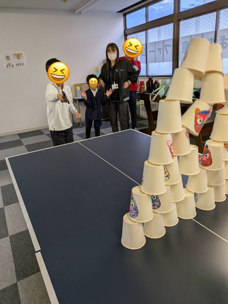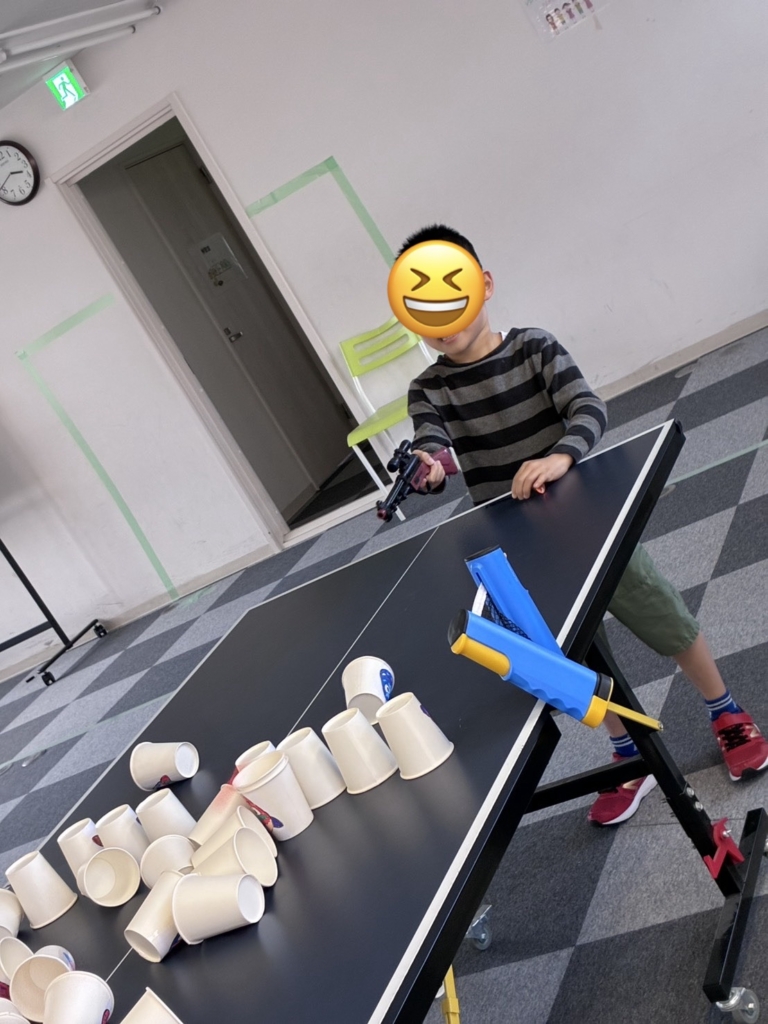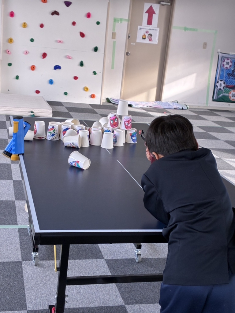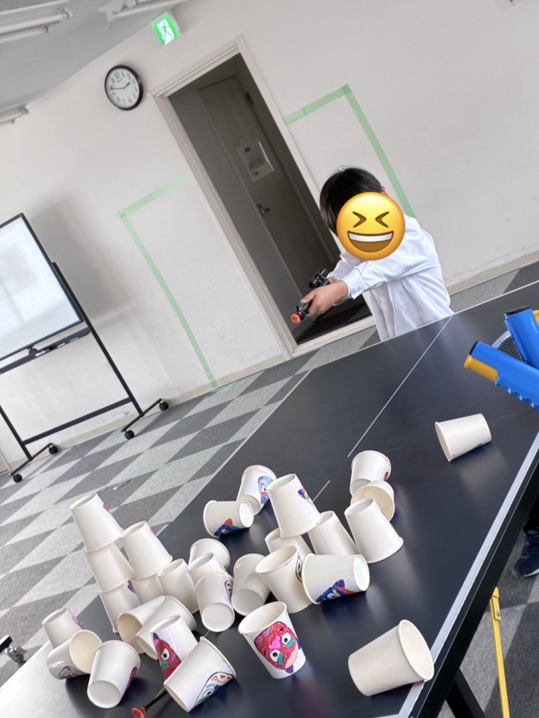 子どもたちは、崩れ方の連鎖を想像しながら、紙コップの山を熱心に狙っていました。戦略と集中力で、新しいチャレンジを、みんなで取り組み、盛り上がげていました。!