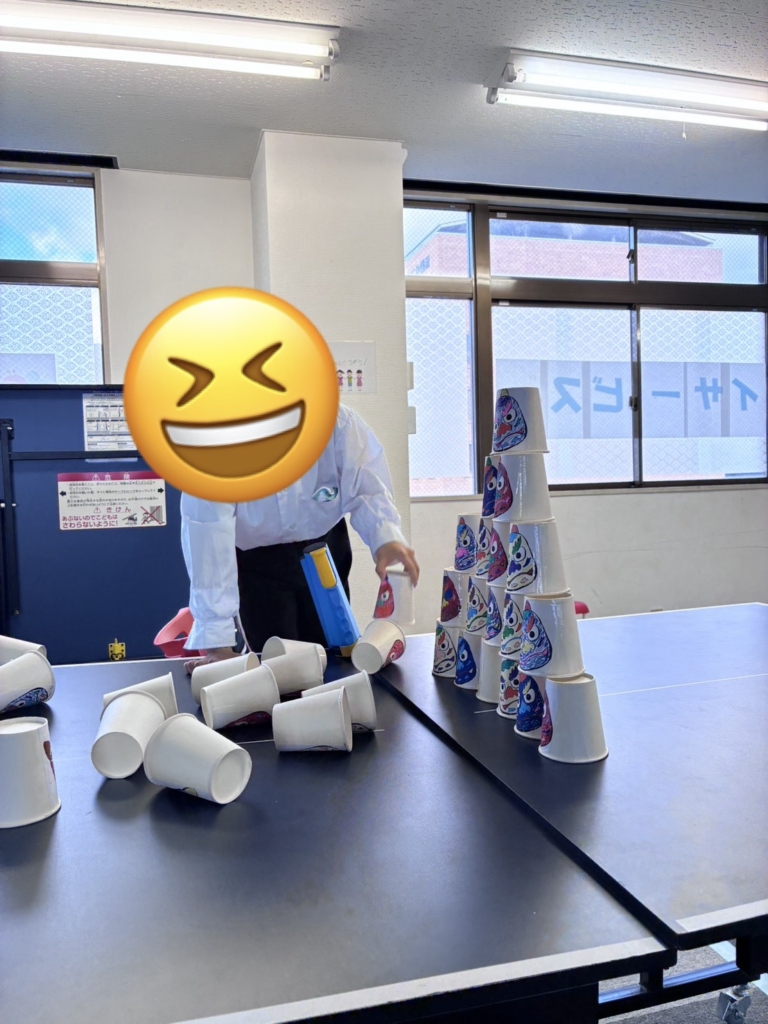「ここを狙えば全部いけるんじゃない?」とスタッフが声を上げると、紙コップのどの部分が“弱点”なのか、角度や高さに見入っていました。「下の真ん中かな?」「いや、ちょっとずらした方がいいかも!」と試行錯誤が続きます。コップの山が予想とは違う方向に崩れることもあり、そのたびに「あー!」「すごい!」と声援が上がります。