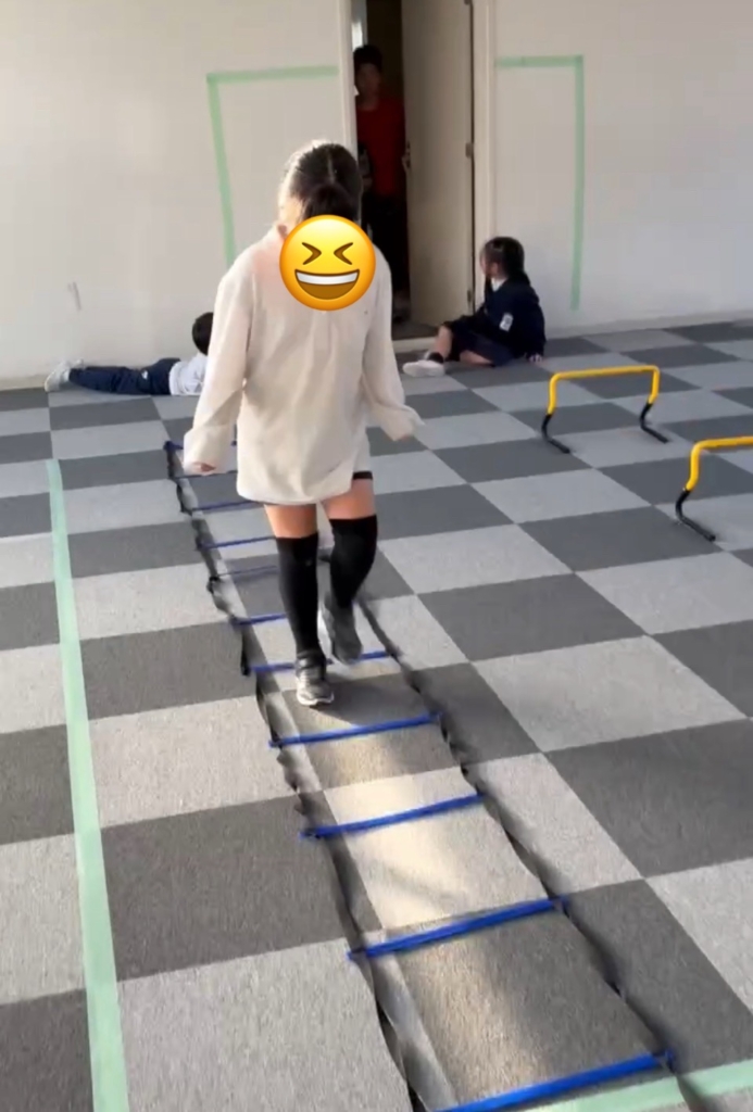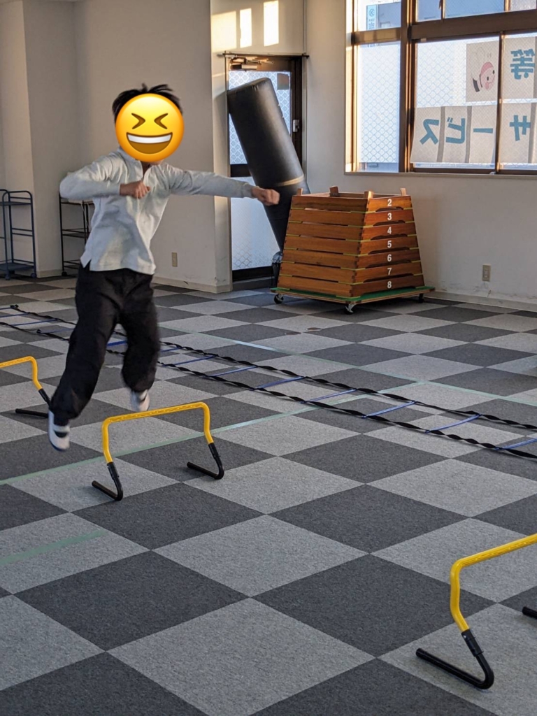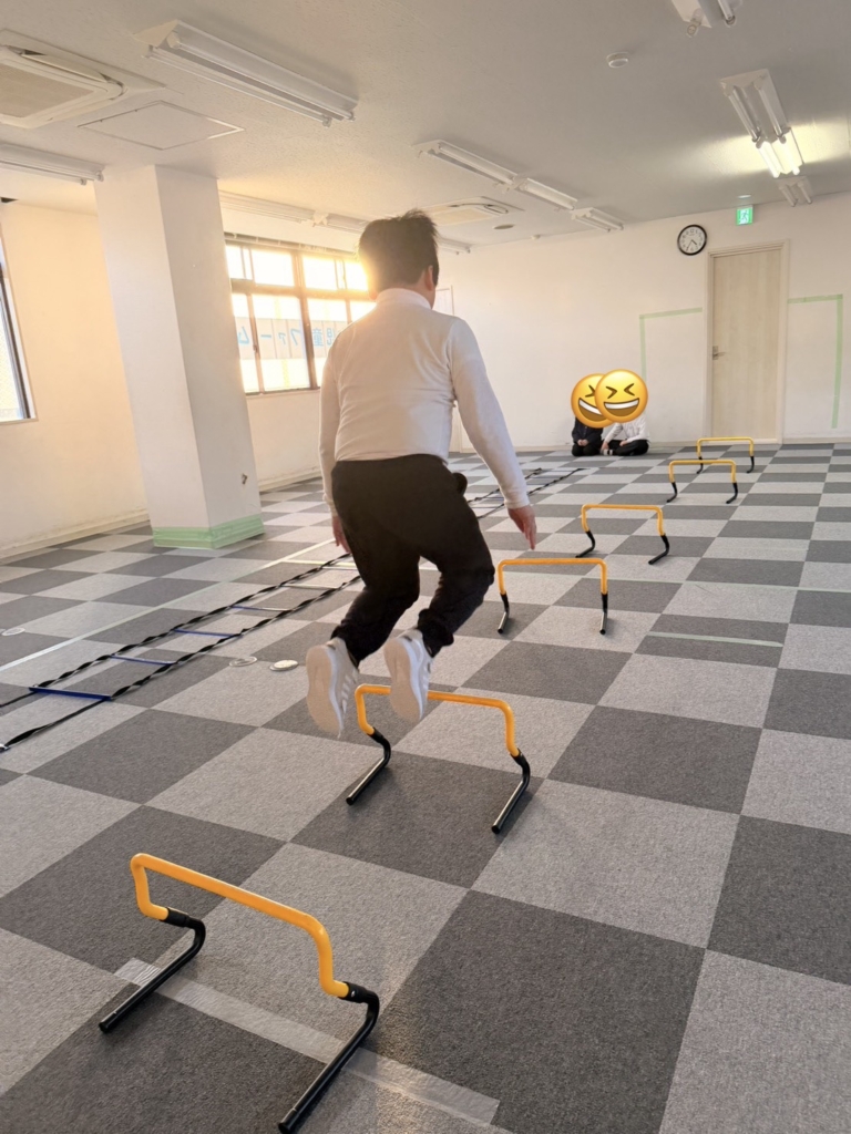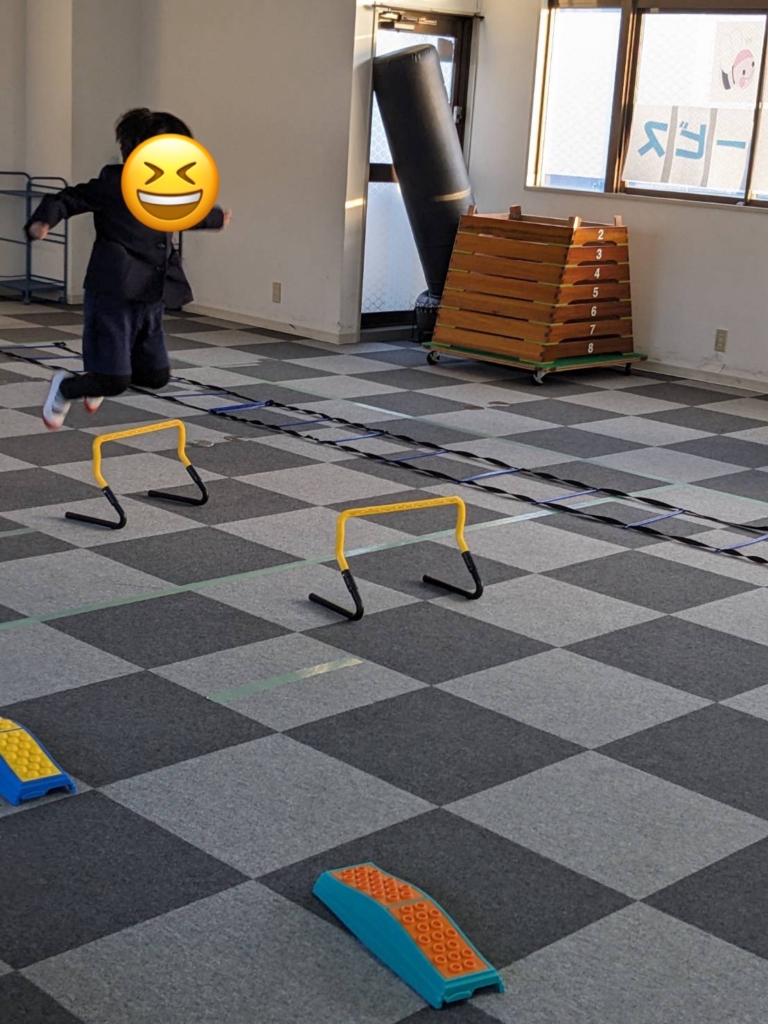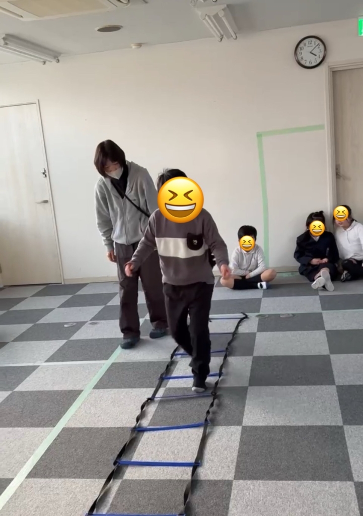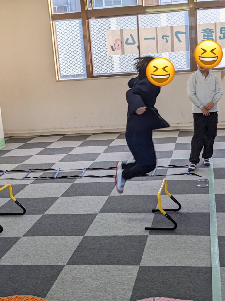 運動施設では、子どもたちの身体能力と集中力を高めるため、ラダー、ハードル、平均台、マット、トンネルを使った「サーキット・トレーニング」をしました。