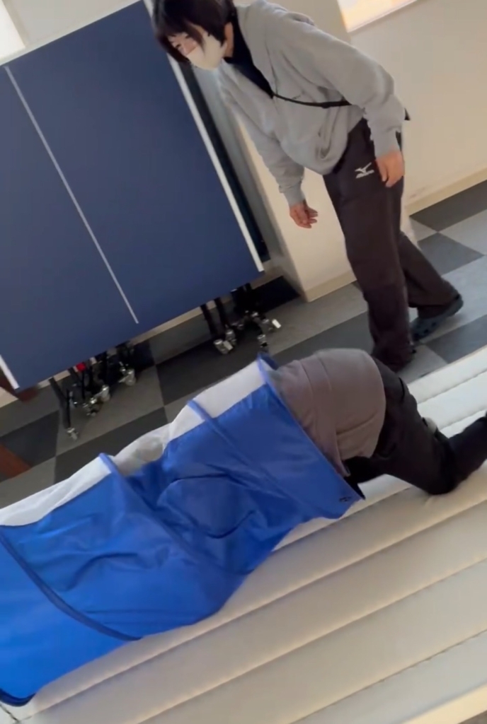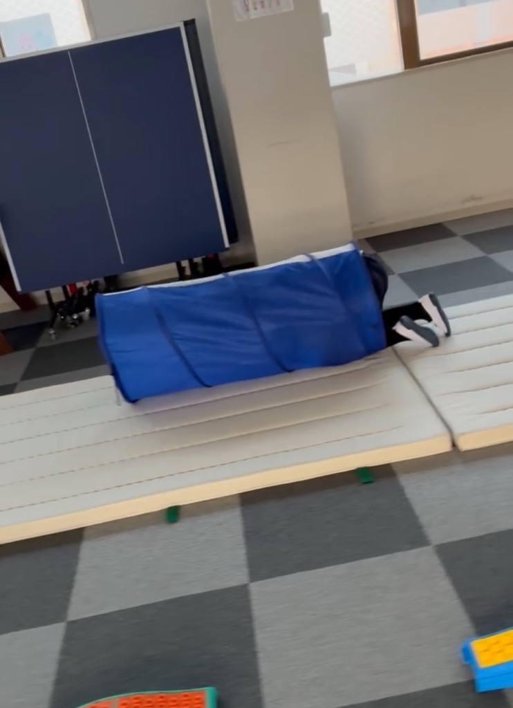 最後は全身運動です。マットの山を力強く乗り越え、狭い網のトンネルをスルスルとくぐり抜けます。