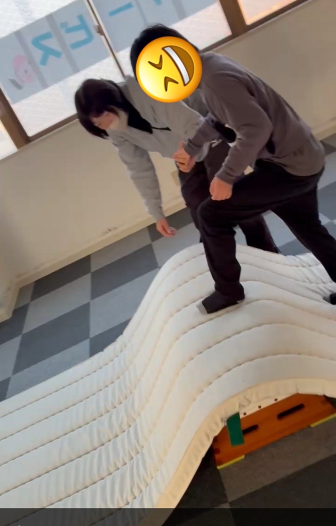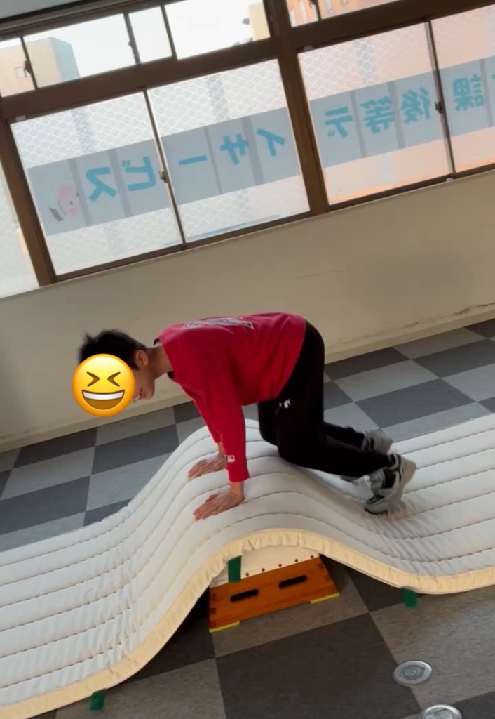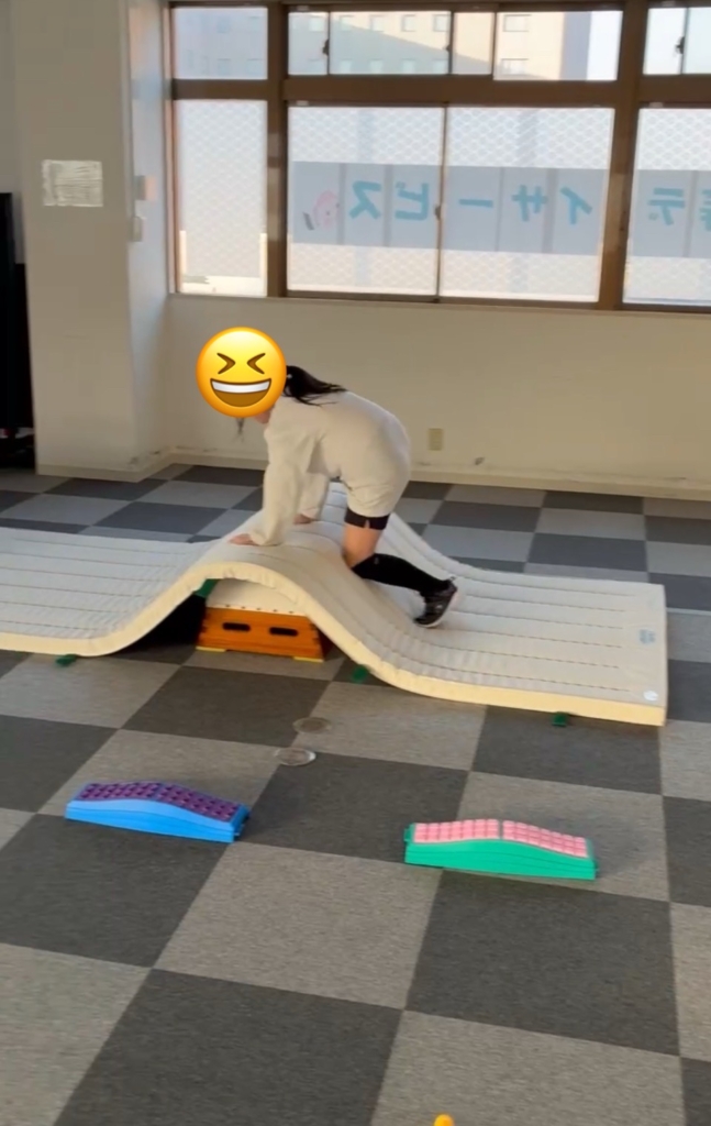 次は、凹凸になった平均台を慎重に渡ります。慌ててバランスを崩しても大丈夫。もう一度途中からやり直し、最後まで渡りきる粘り強さを見せてくれました。