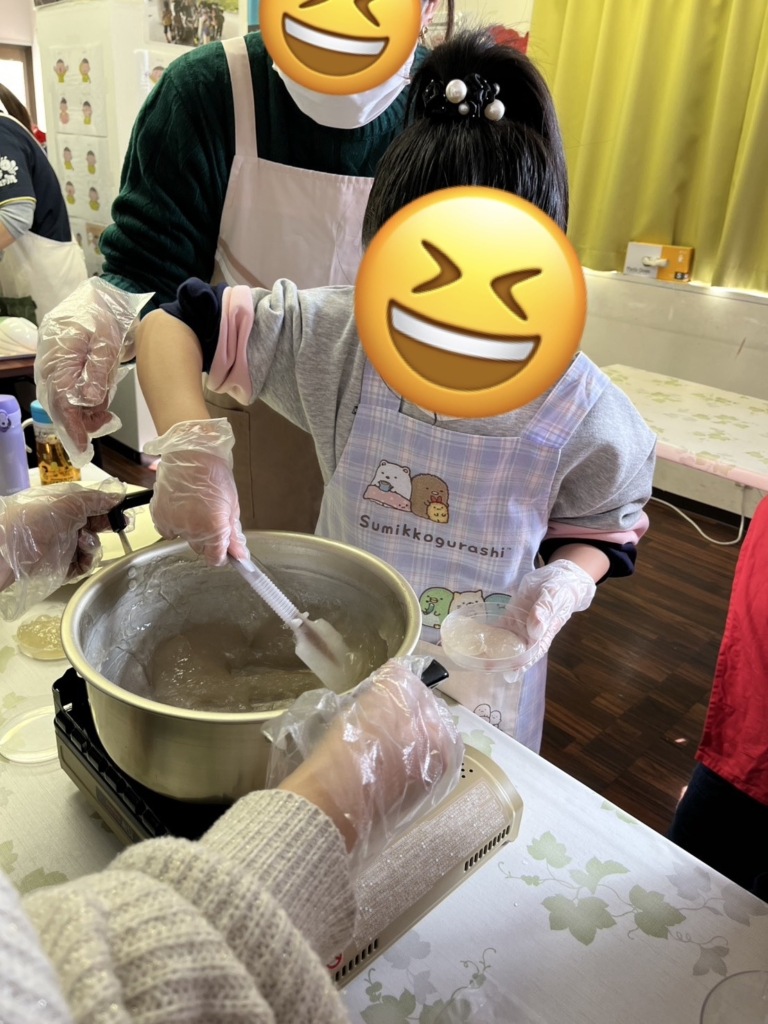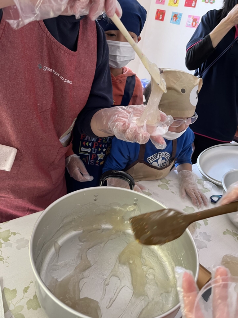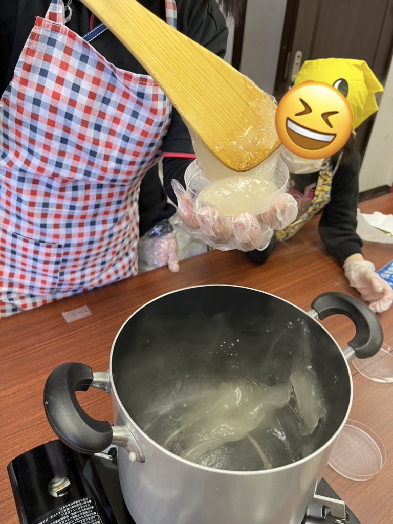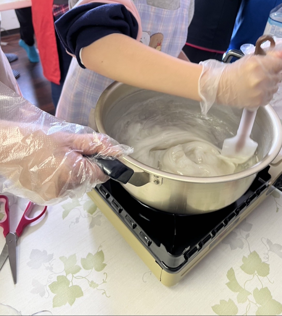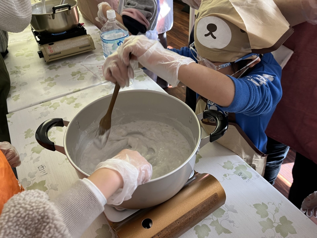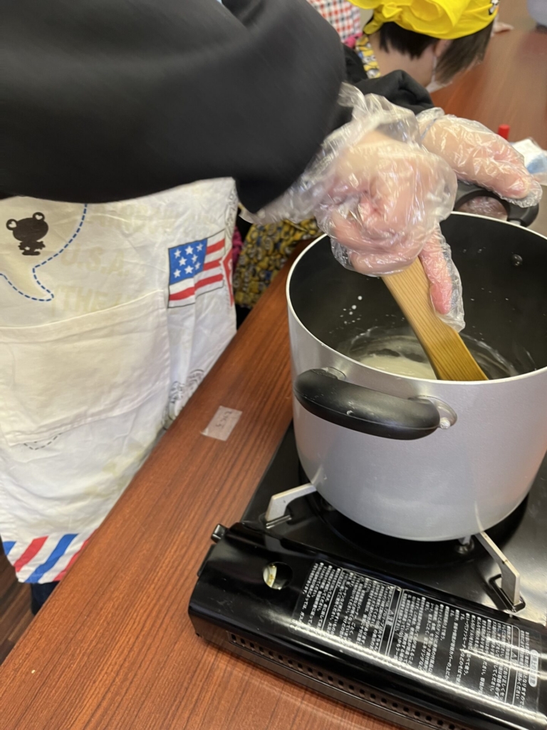 白かった液体が、熱を加えることで徐々に透明へと変わっていく「糊化(こか)」の現象に、みんなの目は釘付けです。ヘラを持つ手にも自然と力が入り、保護者の皆さんのご協力を受けながら、一生懸命に混ぜ続けました。