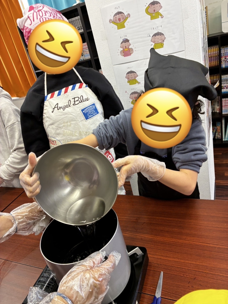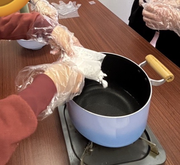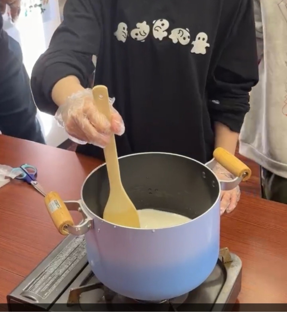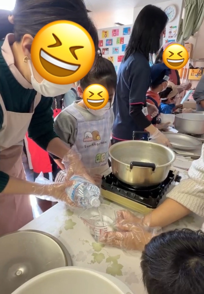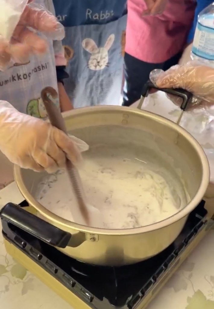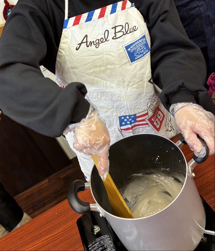 白かった液体が、熱を加えることで徐々に透明へと変わっていく「糊化(こか)」の現象に、みんなの目は釘付けです。ヘラを持つ手にも自然と力が入り、保護者の皆さんのご協力を受けながら、一生懸命に混ぜ続けました。