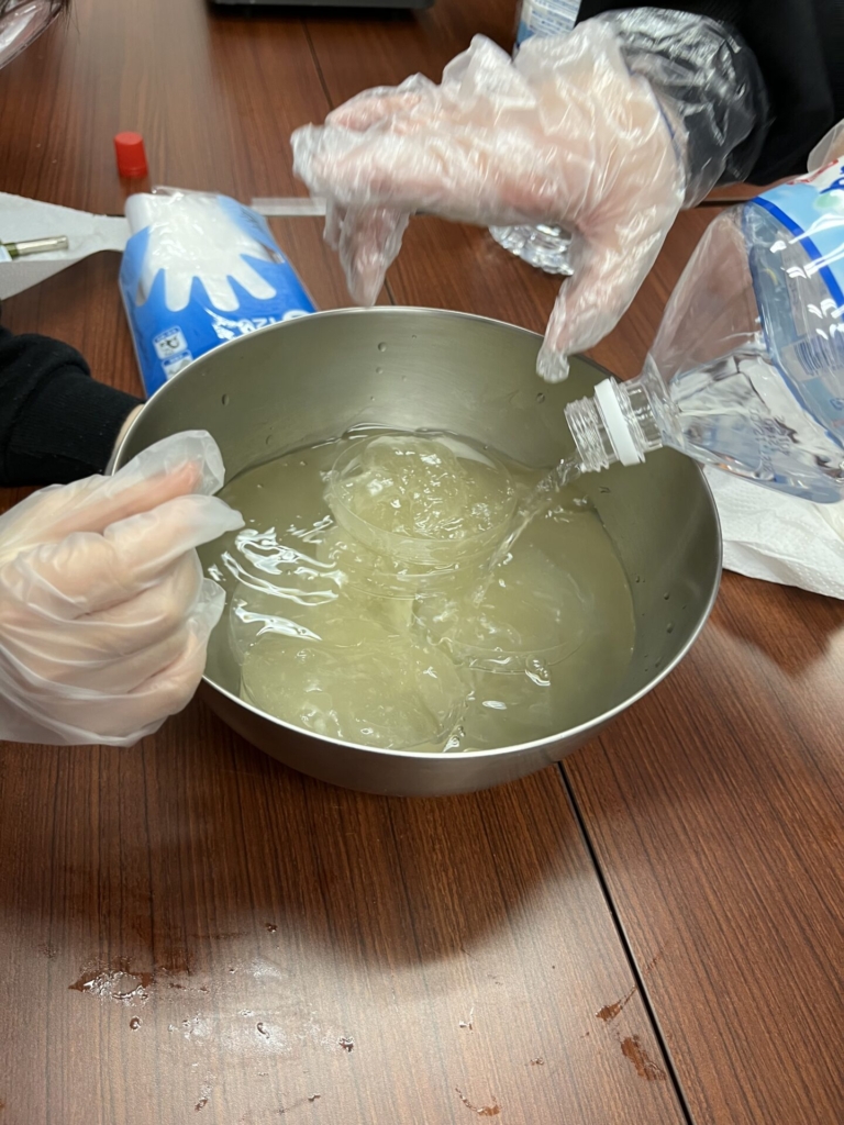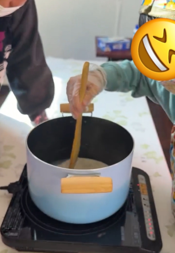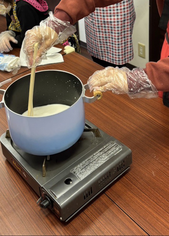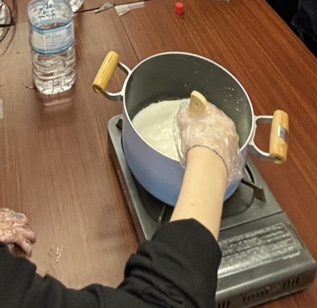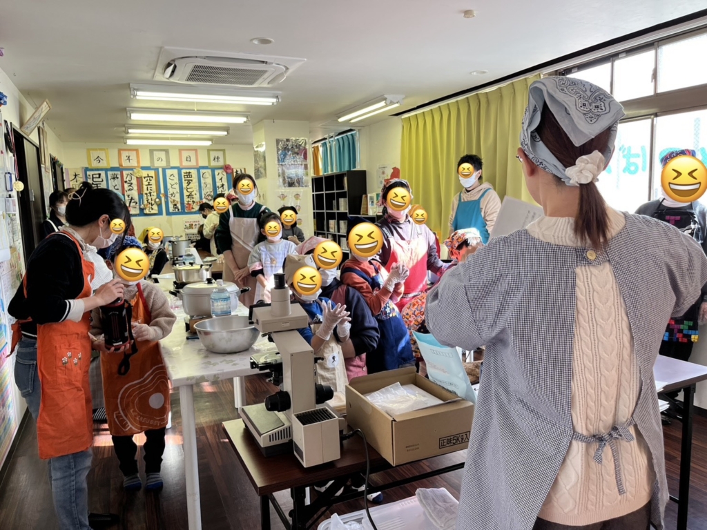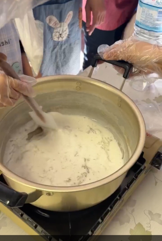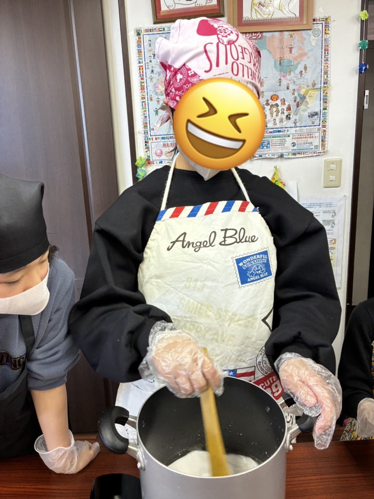 白かった液体が、熱を加えることで徐々に透明へと変わっていく「糊化(こか)」の現象に、みんなの目は釘付けです。ヘラを持つ手にも自然と力が入り、保護者の皆さんのご協力を受けながら、一生懸命に混ぜ続けました。