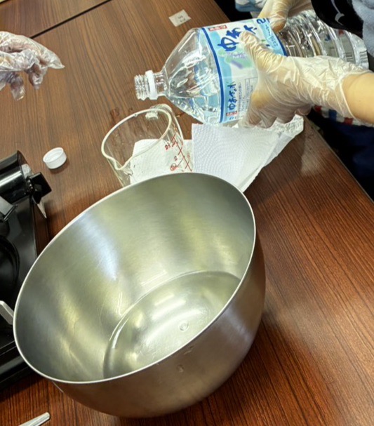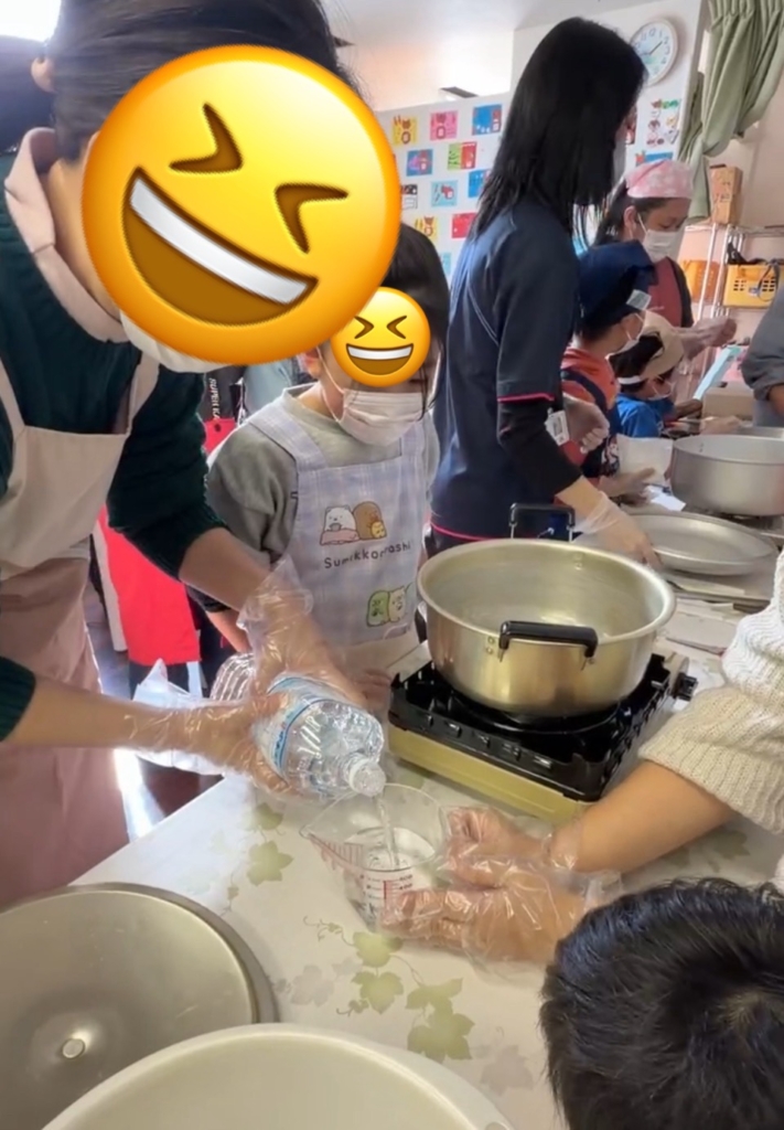 子どもたちは真剣な表情で計量カップを持ち、一人ひとり正確に100ccの水を計って鍋へ。砂糖と葛粉を加え、ダマにならないよう丁寧に混ぜ合わせていきます。