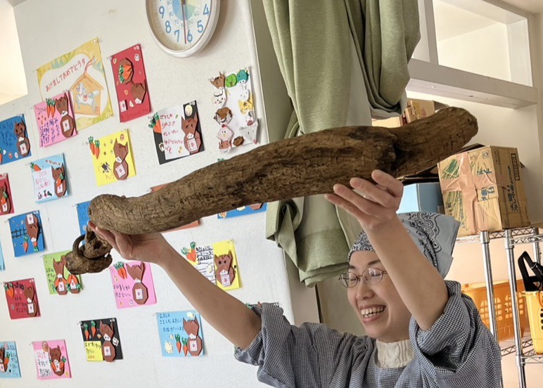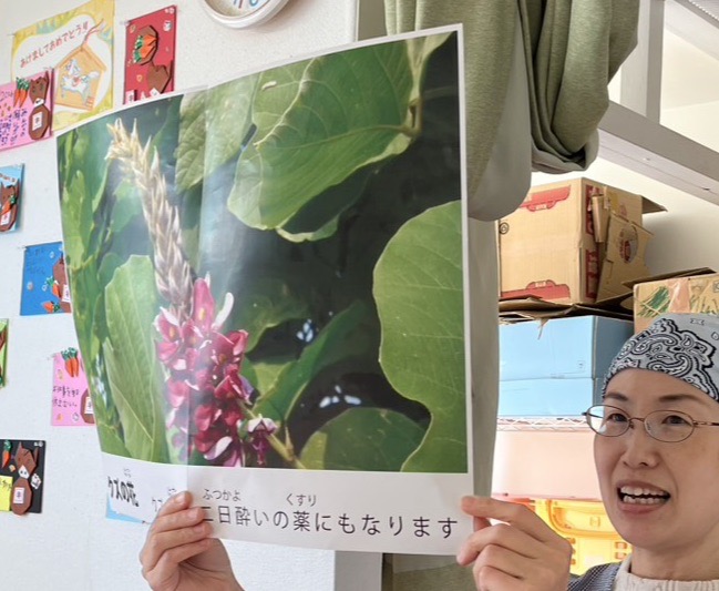 まずは、葛という植物の奥深い世界に触れる時間。秋の七草の一つである葛がどんな花を咲かせるのか、そして私たちが口にするのは、実は土の中にある力強い「根っこ」であること。実際に実物の根っこを目の当たりにすると、子どもたちからも「これが葛もちになるの?!」というの声が聞こえてきました。
