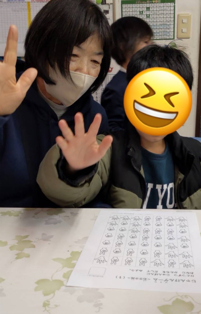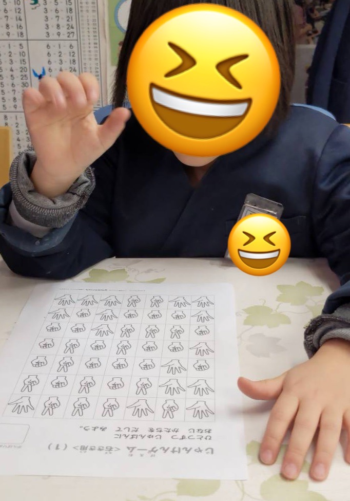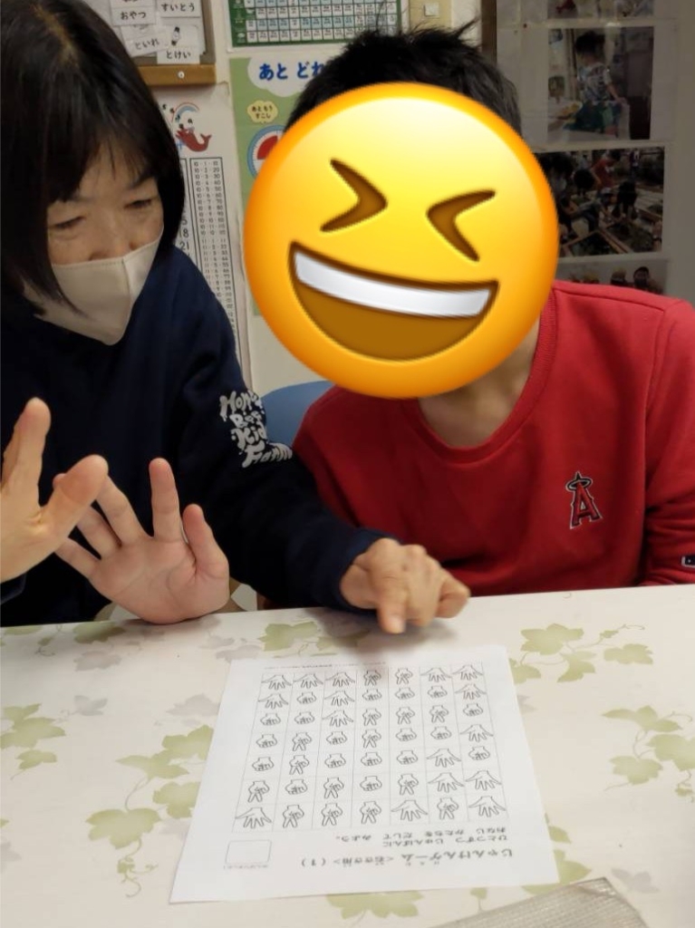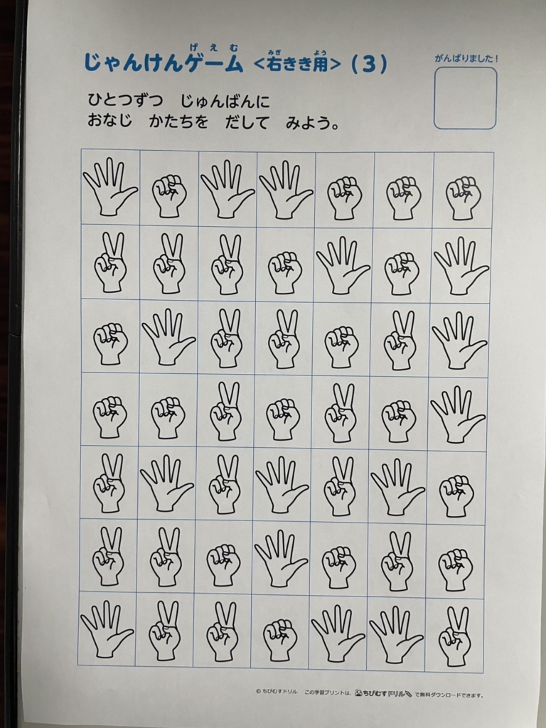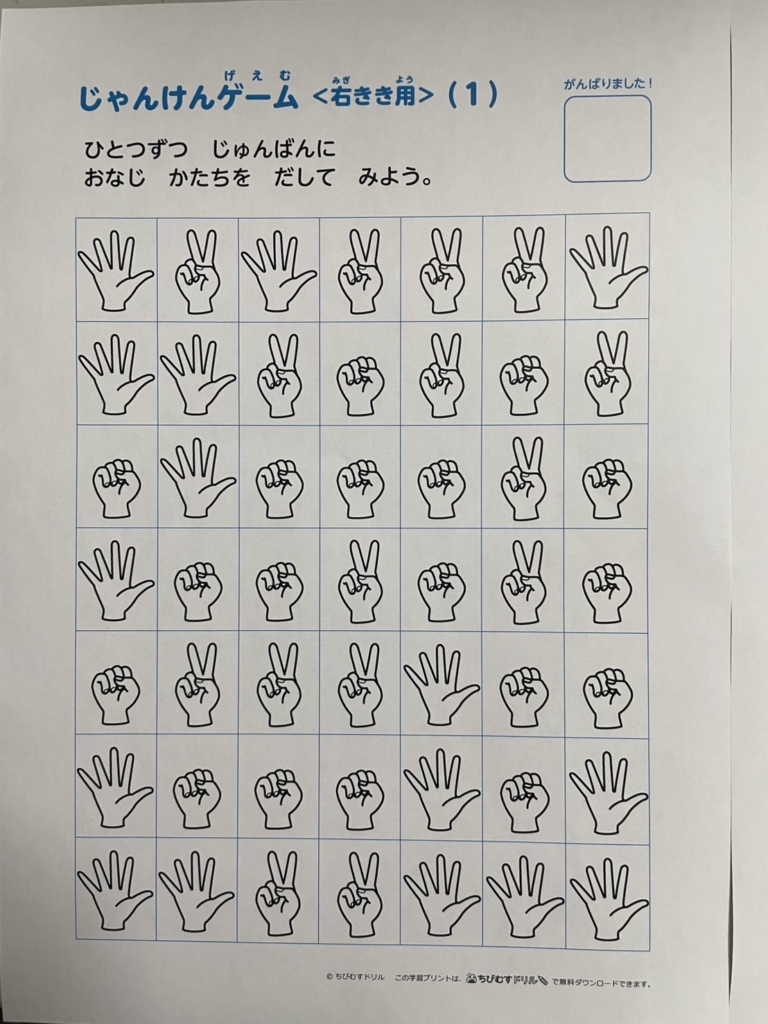 プリントに描かれた「グー・チョキ・パー」のイラストを瞬時に判別し、実際に自分の手で同じ形を作るトレーニングです。指先を細かく動かす力だけでなく、視覚情報を脳で素早く処理する力を養います。