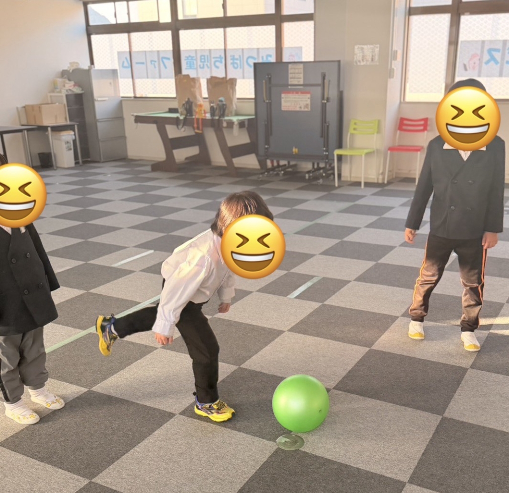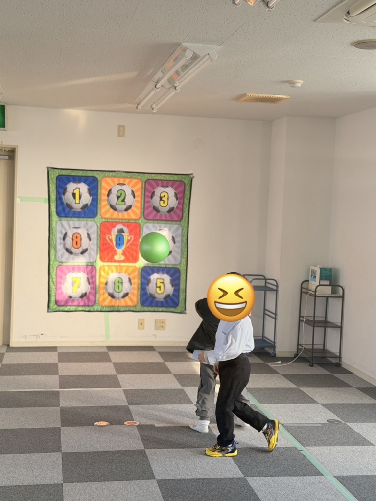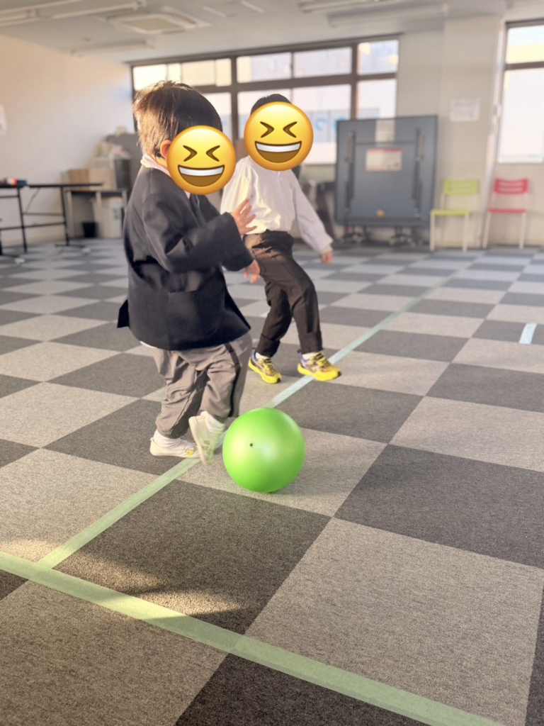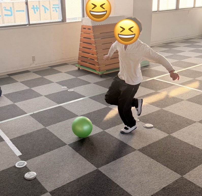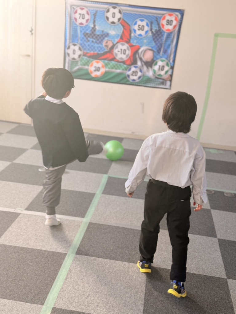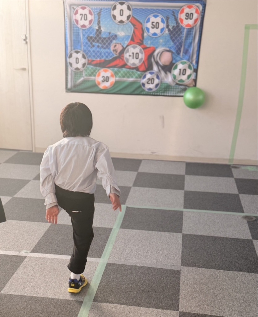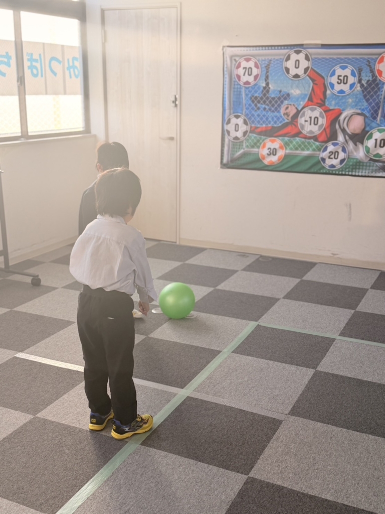 全身運動: ボールを追いかけたり、狙いを定めて足を振り抜いたりと、室内ながらも全身をフルに使ってイキイキと体を動かしました。