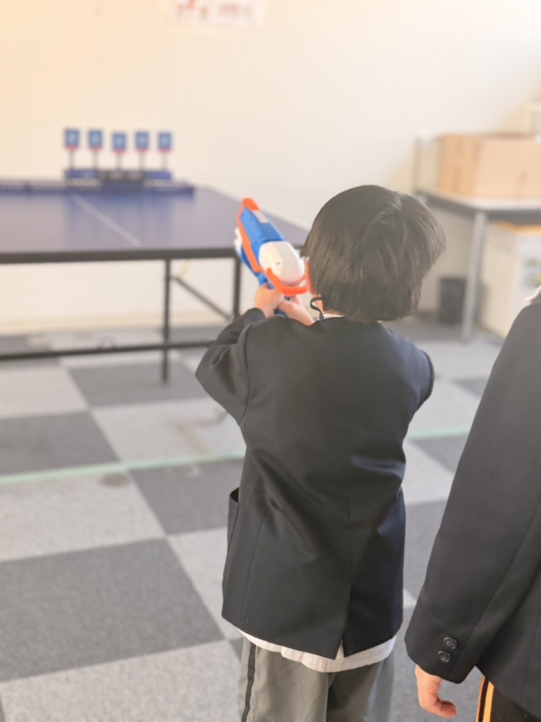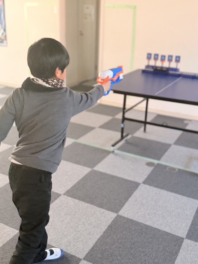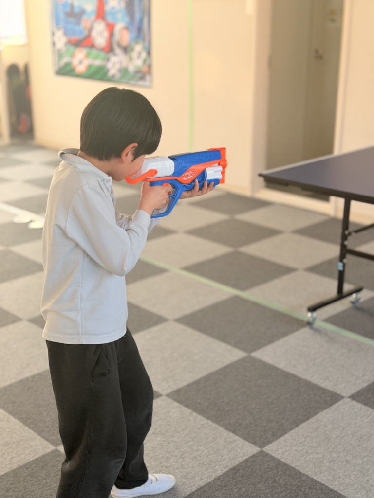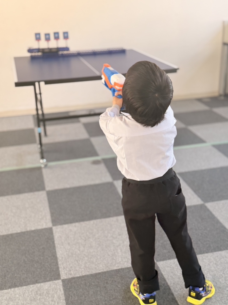 集中力の発揮: おもちゃの銃をしっかりと両手で構え、ピンと背筋を伸ばして的を狙う姿はまさに「小さなスナイパー」。