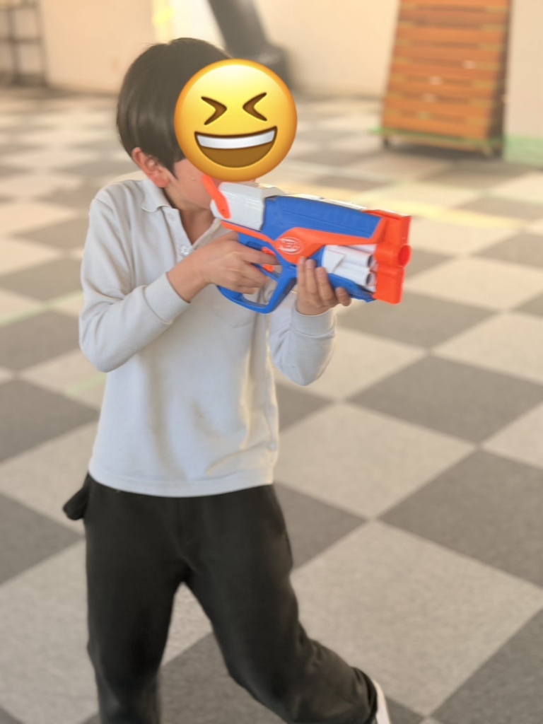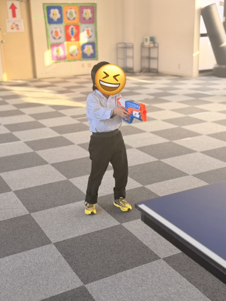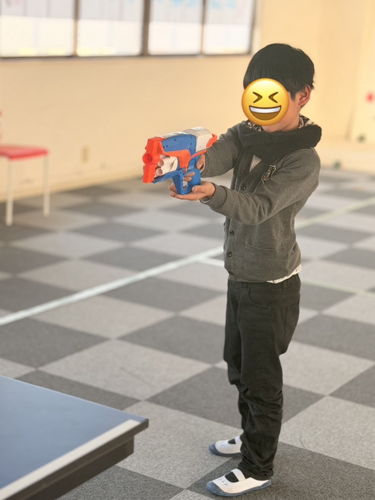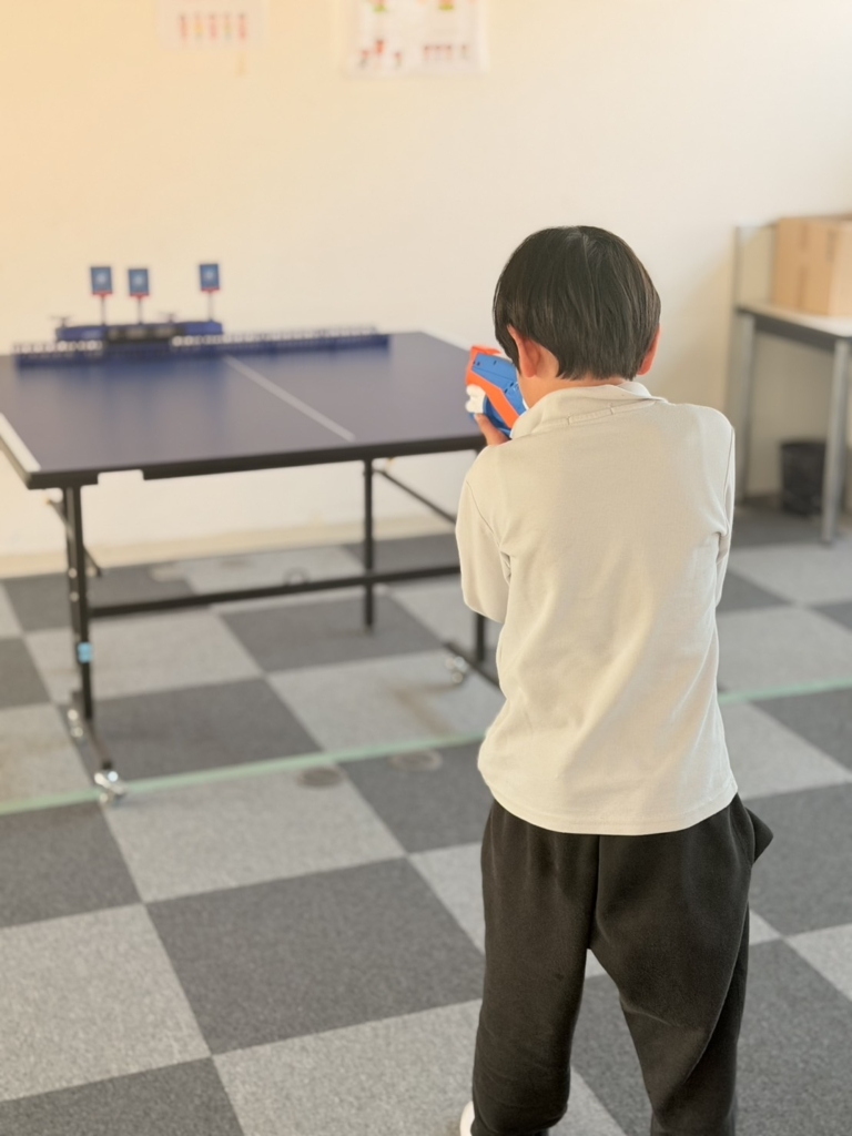 集中力の発揮: おもちゃの銃をしっかりと両手で構え、ピンと背筋を伸ばして的を狙う姿はまさに「小さなスナイパー」。