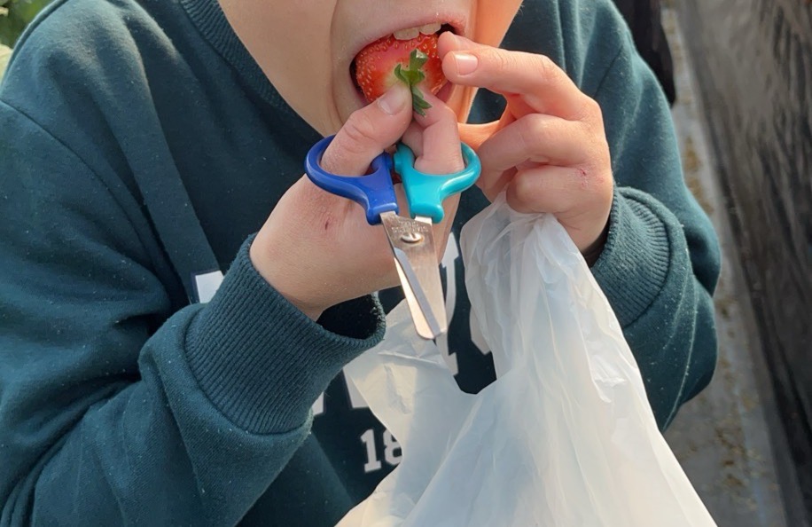 「どれが一番大きいかな?」「これ、真っ赤だよ!」と宝探しをするように、一つひとつ丁寧に茎を切り取っていきます。最初は少し緊張していたハサミの使い方も、すぐにコツを掴んでとってもスムーズに!