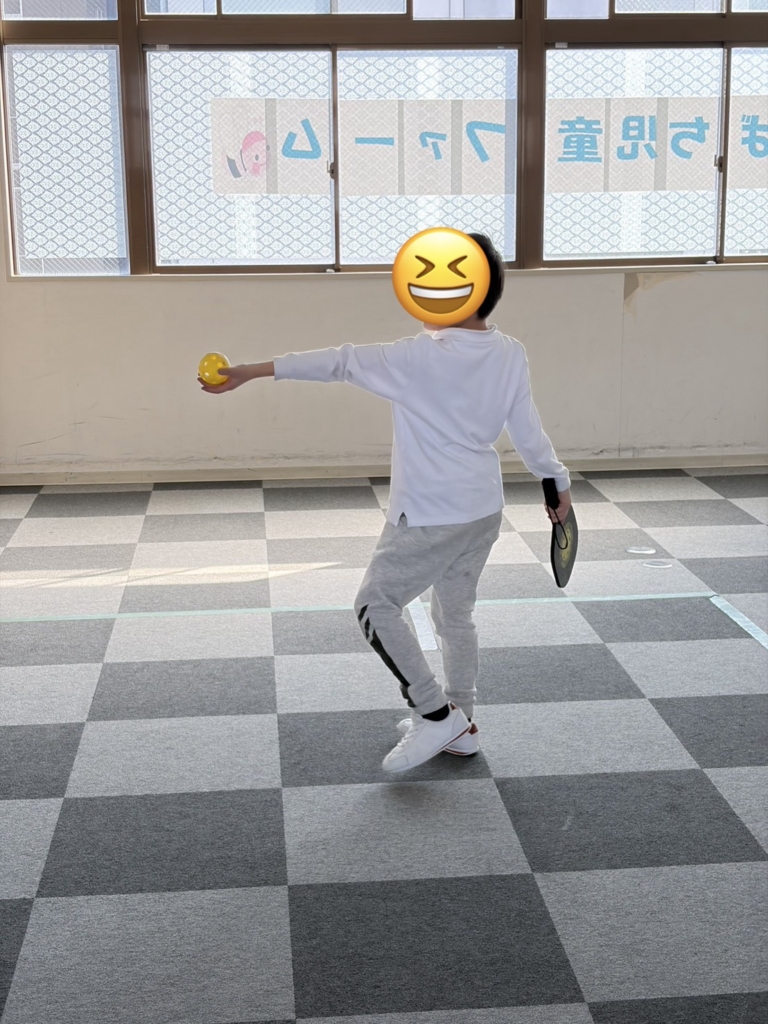テニスのように上から叩きつけるのではなく、**腰より低い位置で、アンダーハンド(下から上へ)**で打ちます。これなら空振りもしにくく、低学年の子でも安心です。