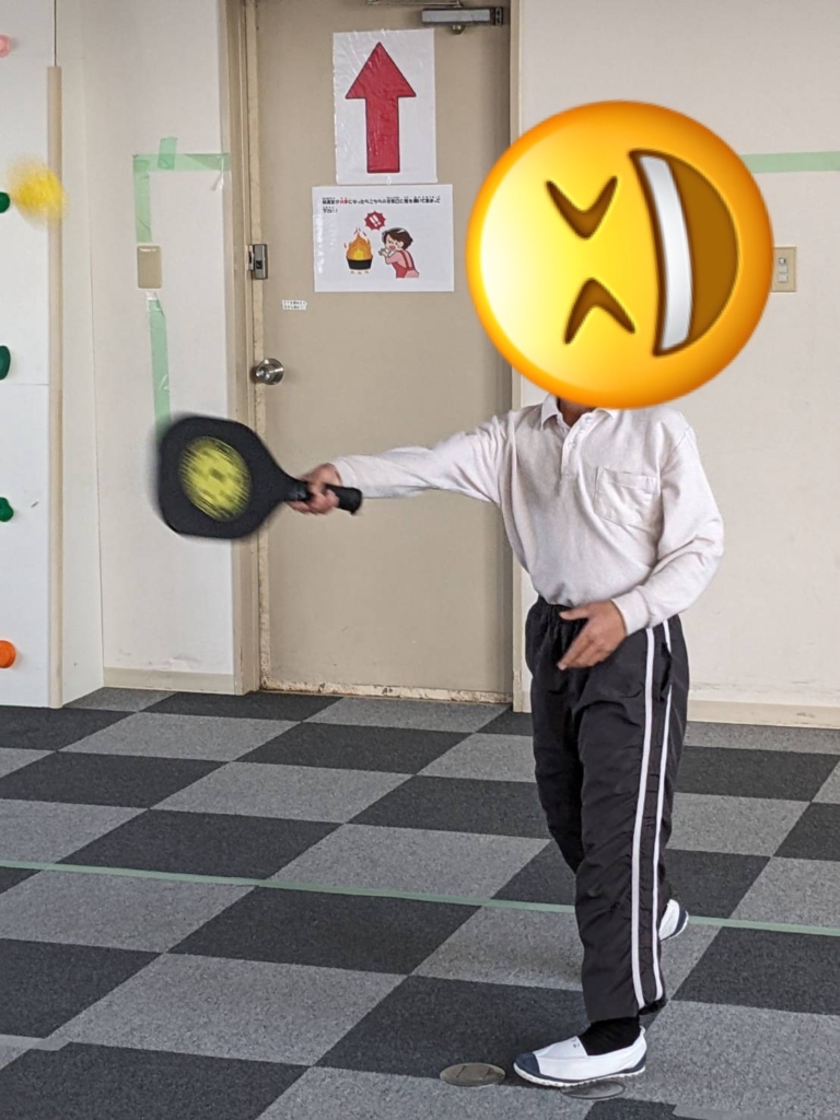 パドルをしっかり握りしめて、黄色いボールを一生懸命に追いかけています。