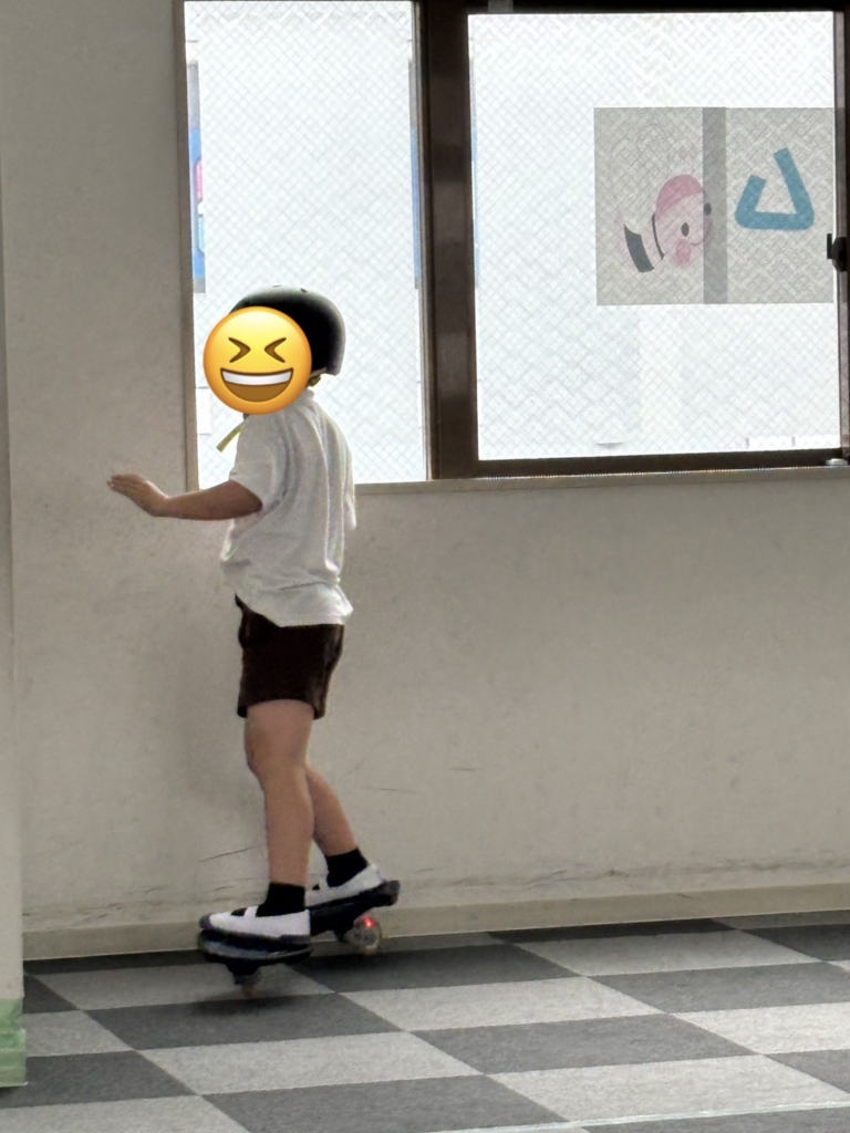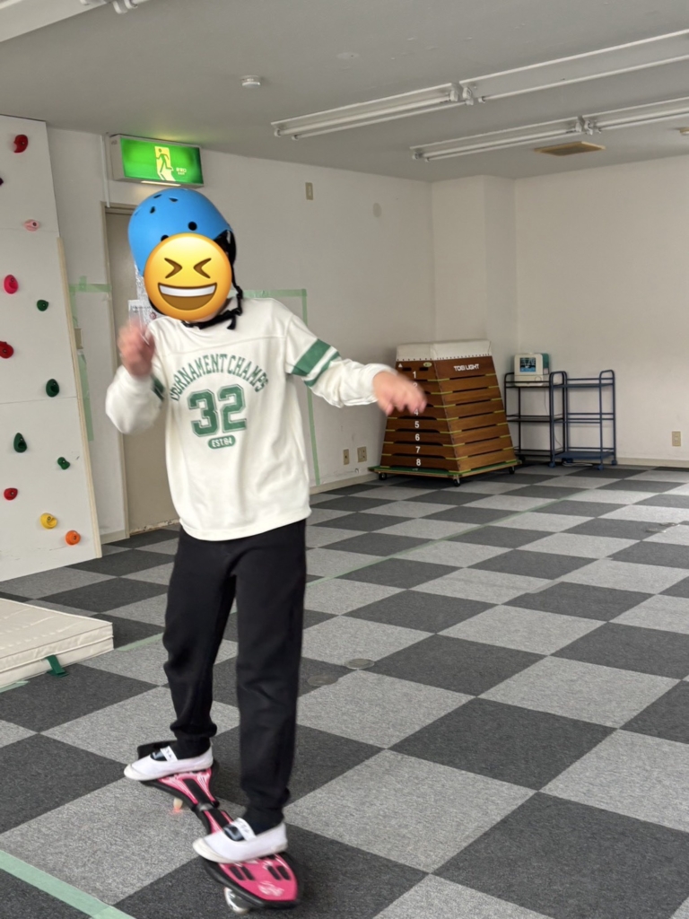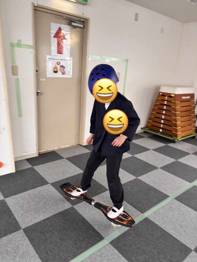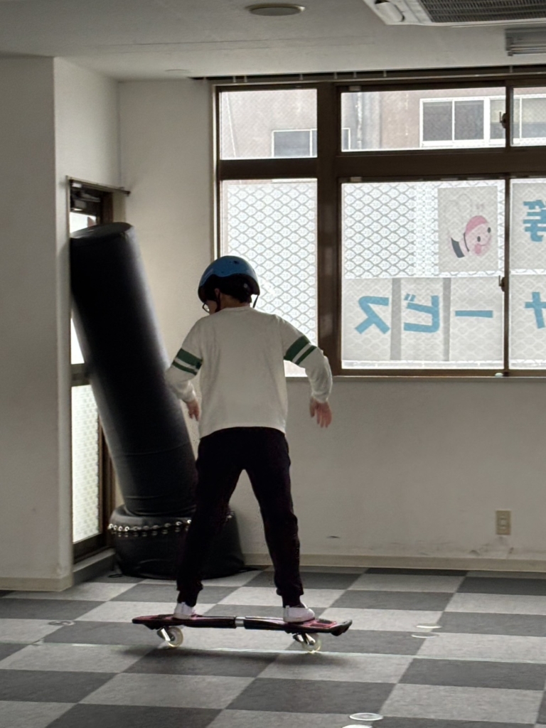 最初は足元がグラグラ動くJボードが怖くて、なかなか乗れなかったお友達もいました。でも、他の子が楽しそうに、スイスイ滑っている様子を見て、「自分も滑れるようになりたい!」「カッコよく決めたい!」と、心に火がついたようです。