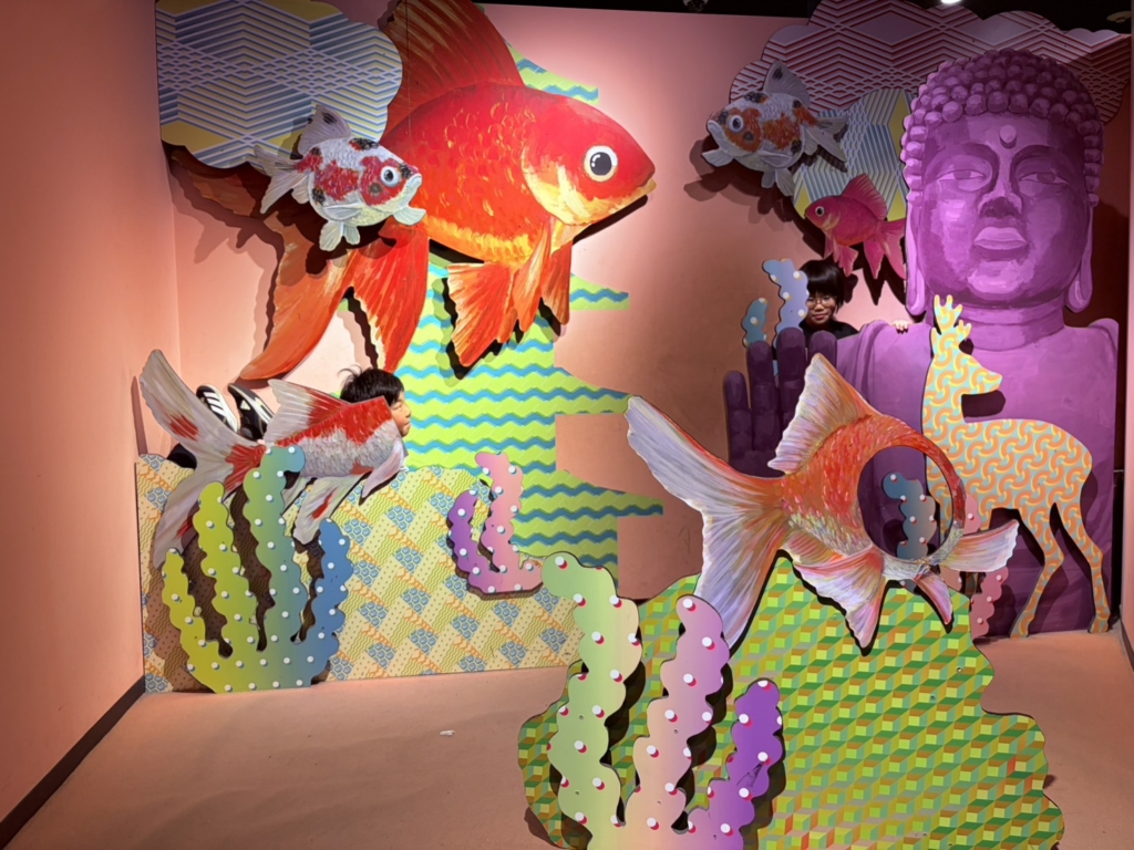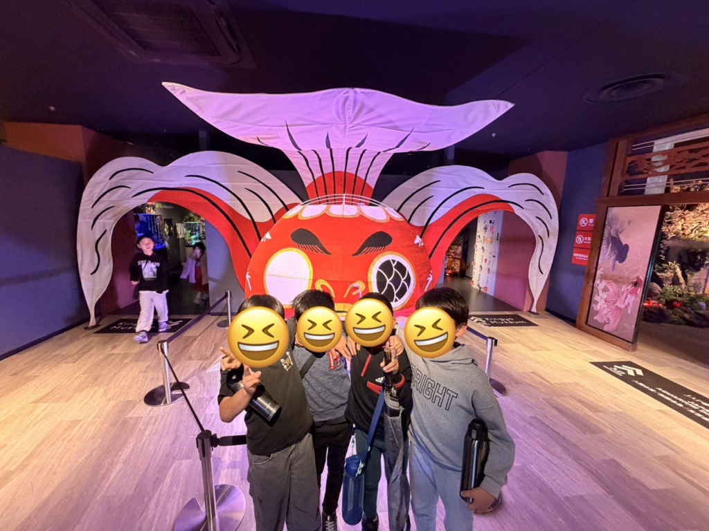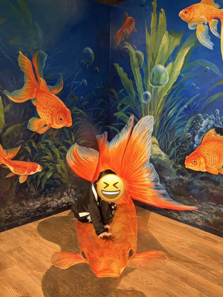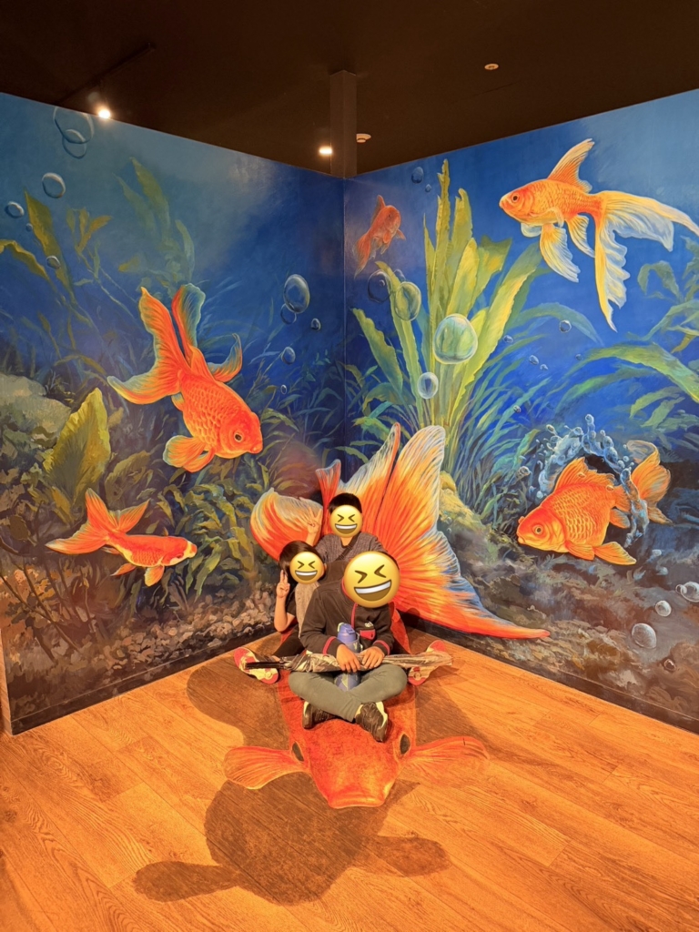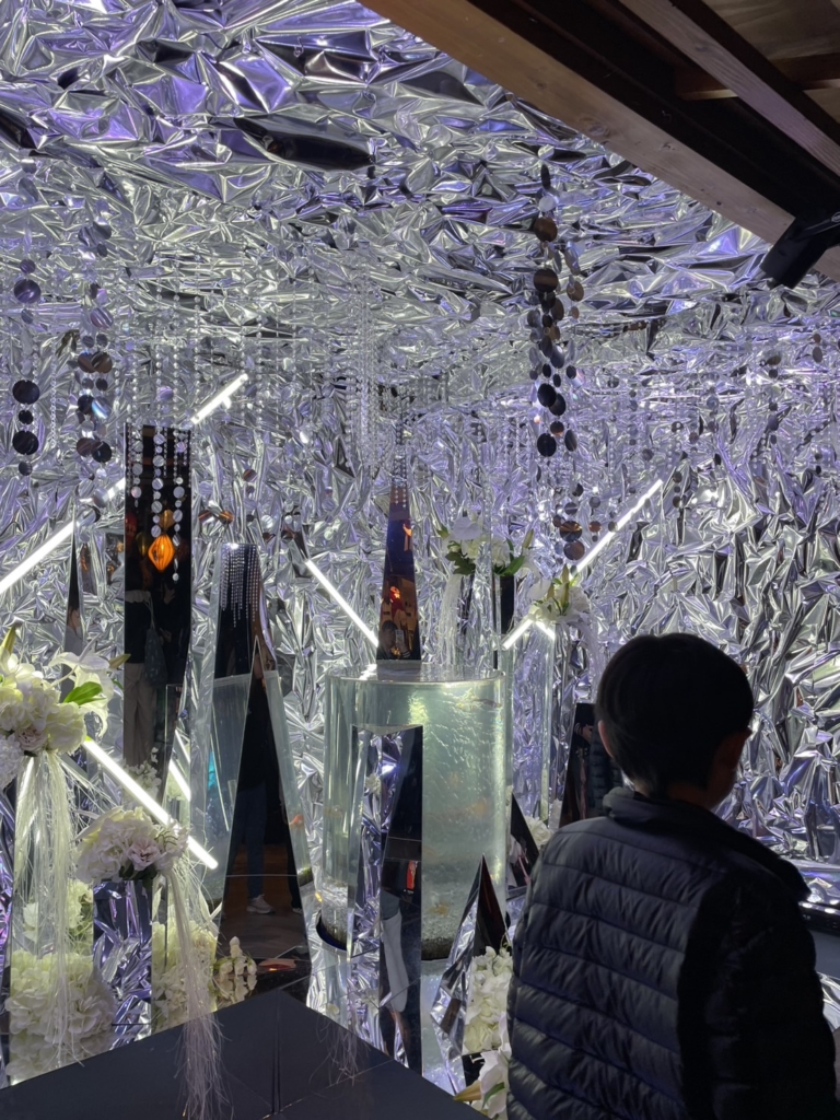 一歩足を踏み入れると、そこには色鮮やかな金魚たちが優雅に泳ぐ、光と鏡の幻想的な空間が広がっていました。伝統的な和の情緒と現代アートが融合した演出に、子どもたちは一瞬で心を奪われたようです。