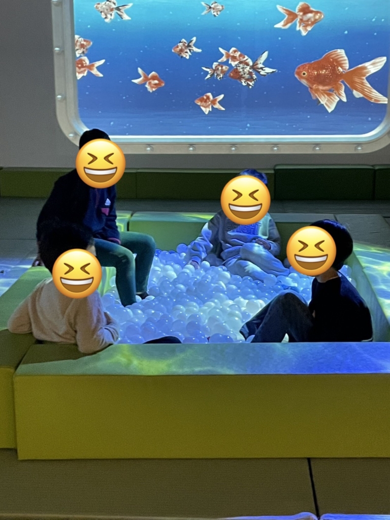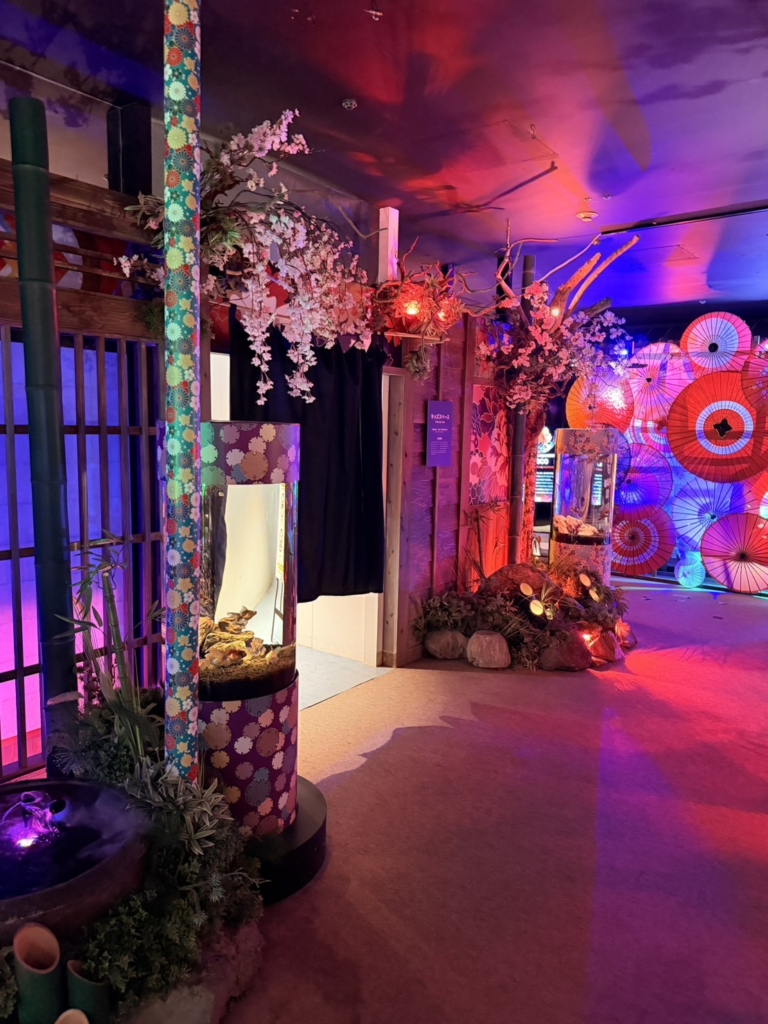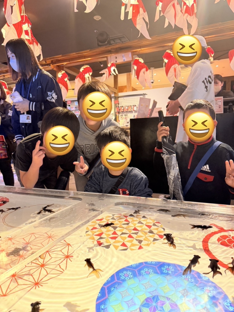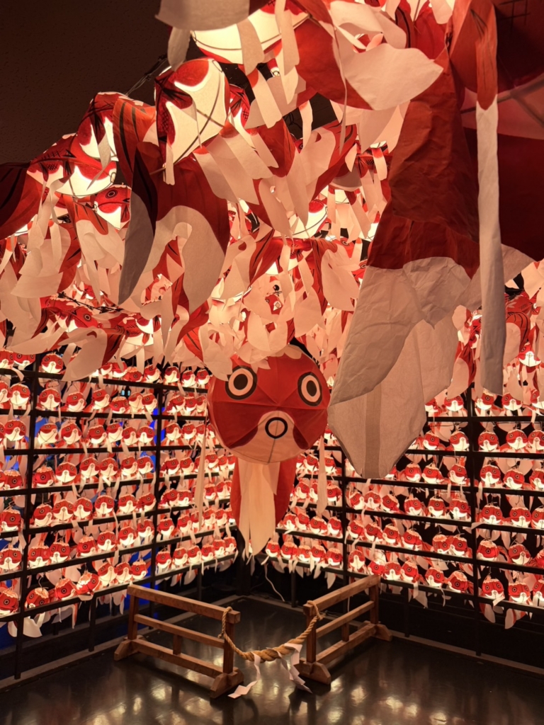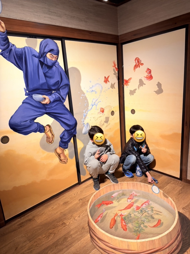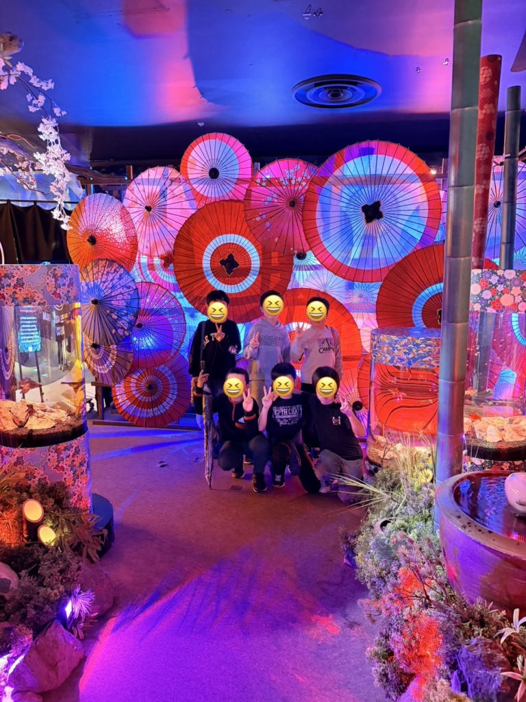 一歩足を踏み入れると、そこには色鮮やかな金魚たちが優雅に泳ぐ、光と鏡の幻想的な空間が広がっていました。伝統的な和の情緒と現代アートが融合した演出に、子どもたちは一瞬で心を奪われたようです。
