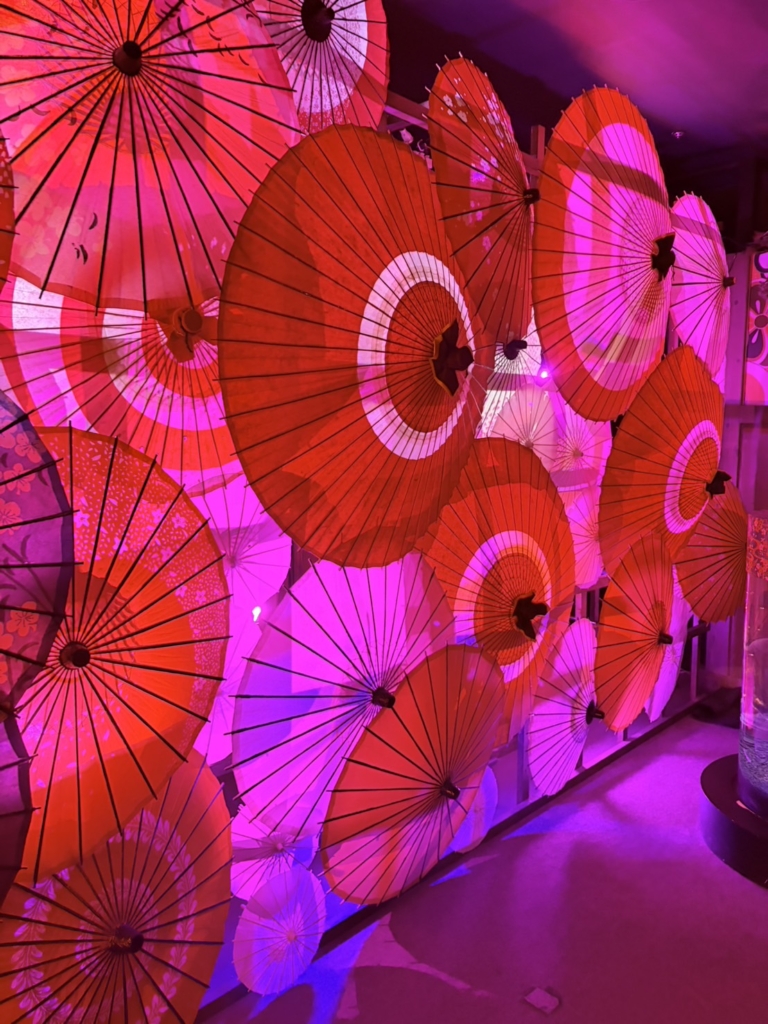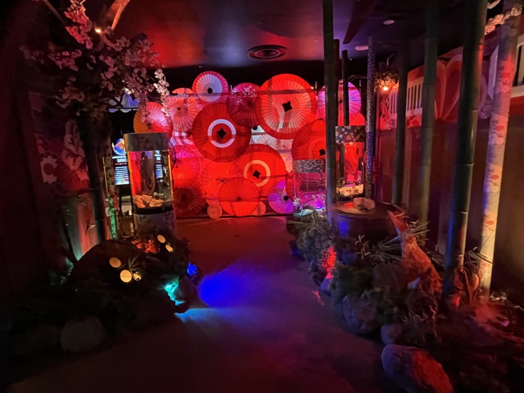 空間演出: プロジェクションマッピング、光、鏡、花などを駆使したアート空間。