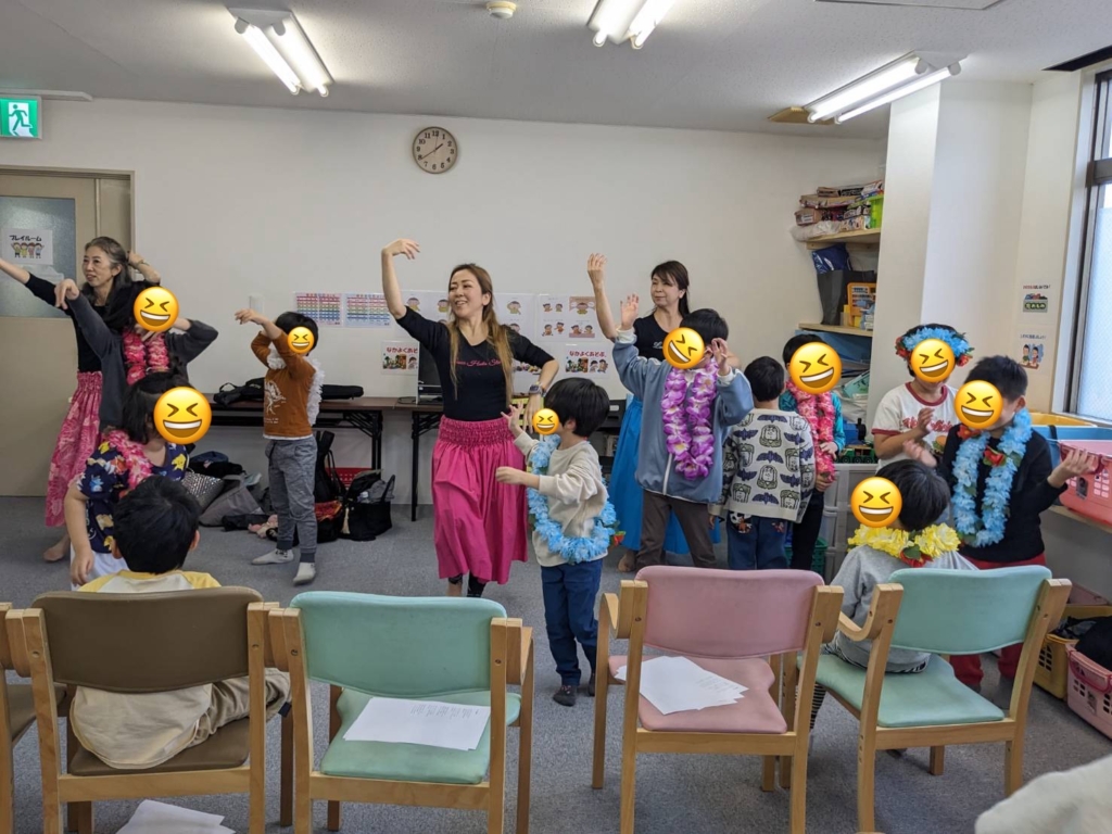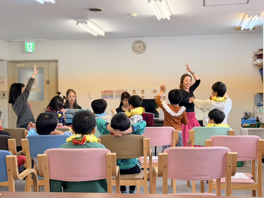 色鮮やかな衣装を身にまとった先生方の優雅な動きに、お子さんたちの目は釘付け。「やってみたい!」と、みんなで一緒にフラダンスに挑戦しました。