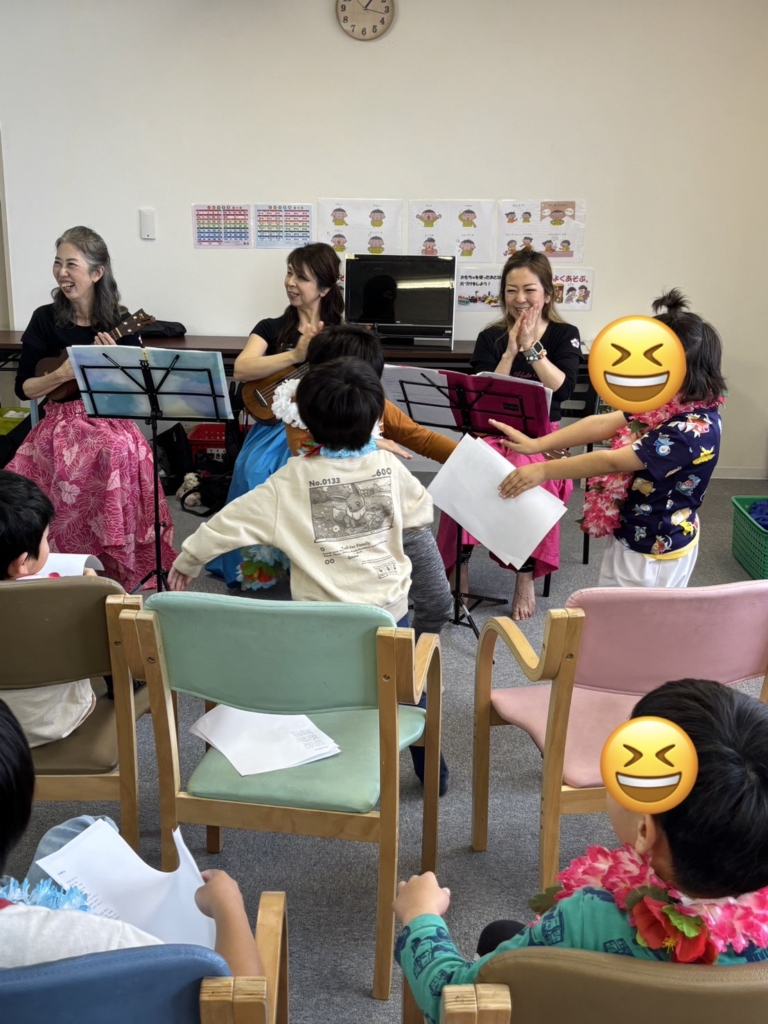 お子さんたちにとっては初めて聴く曲もありましたが、先生方の圧倒的なパフォーマンスと明るいリードで、会場のボルテージは一気に最高潮へ!ウクレレの軽快で優しい音色に、みんな自然と体が動き出し、一生懸命に歌を口ずさむ姿がとっても印象的でした。