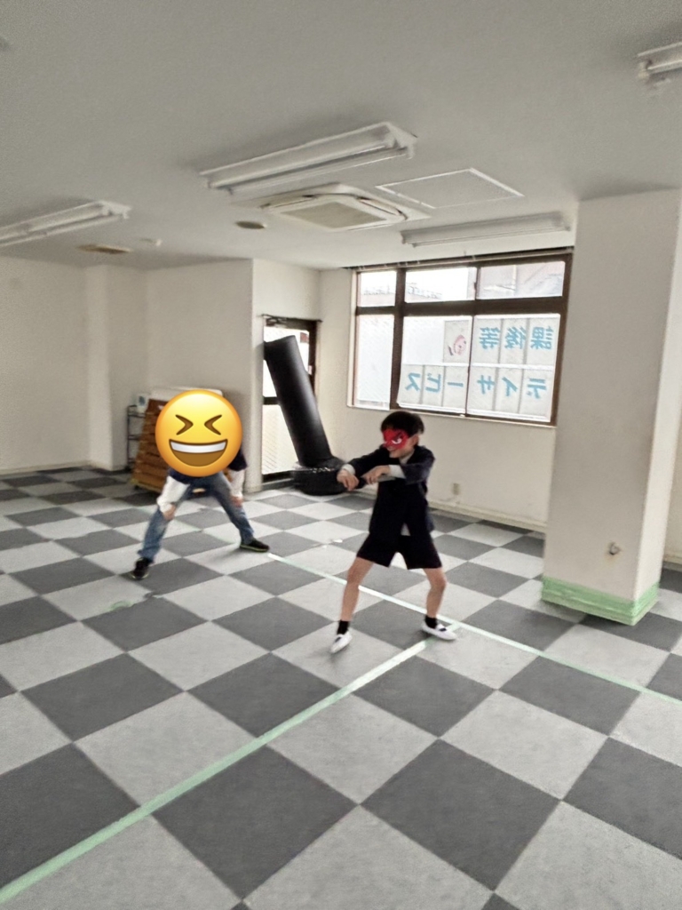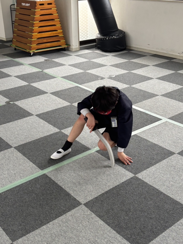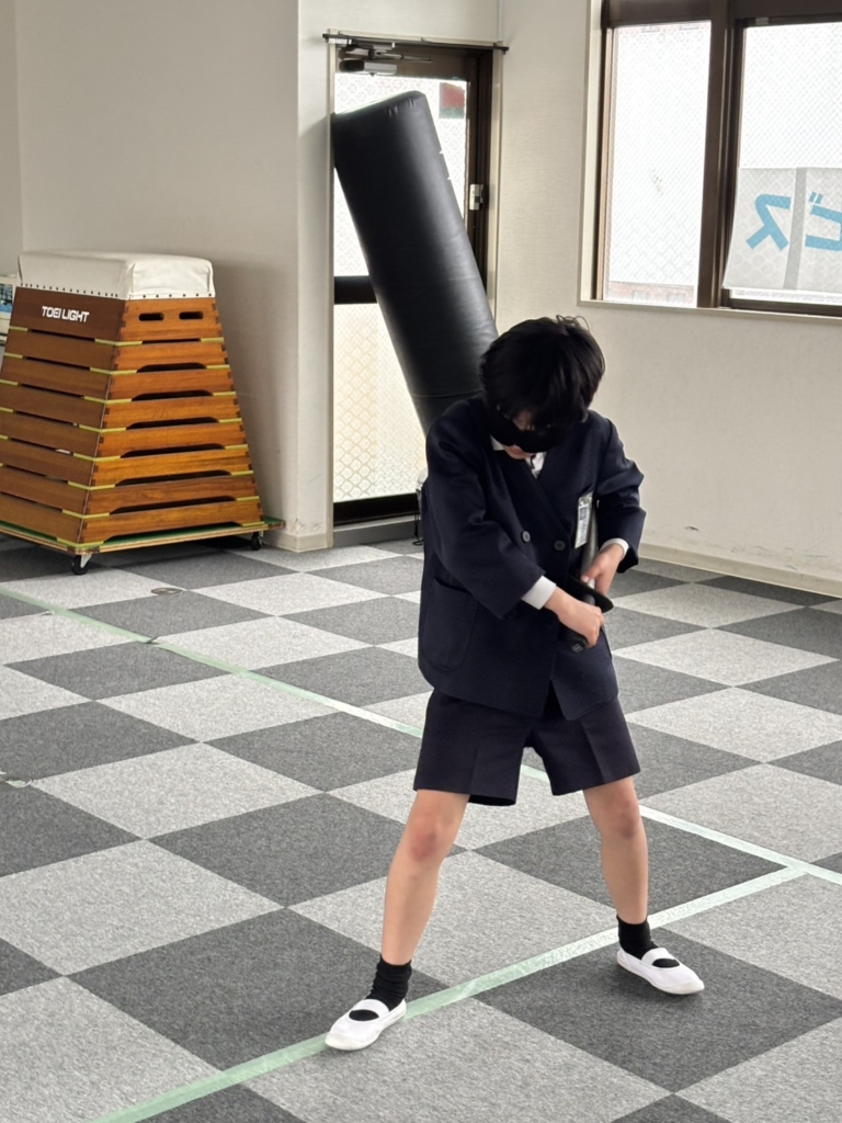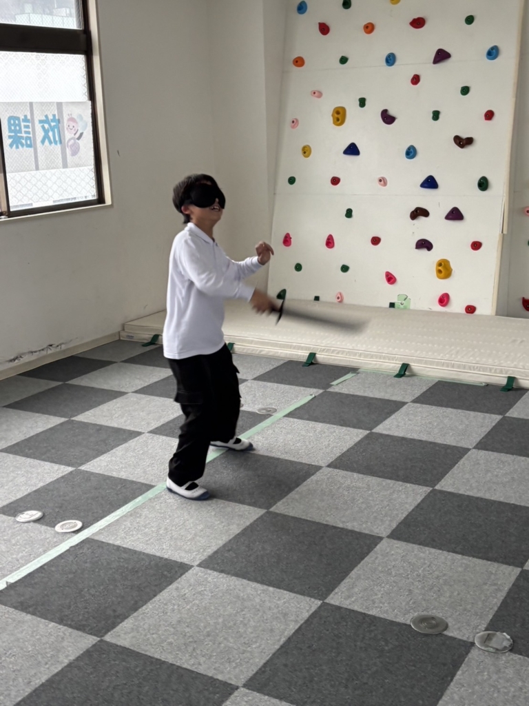 スポンジの刀を手に、そっと足音を忍ばせながら、見えない相手との距離をじりじりと詰めていきます。「あっちかな?」「いや、こっちだ!」と探る表情は真剣そのもの。視覚に頼れない分、感覚を研ぎ澄ませていく姿がとても印象的です。