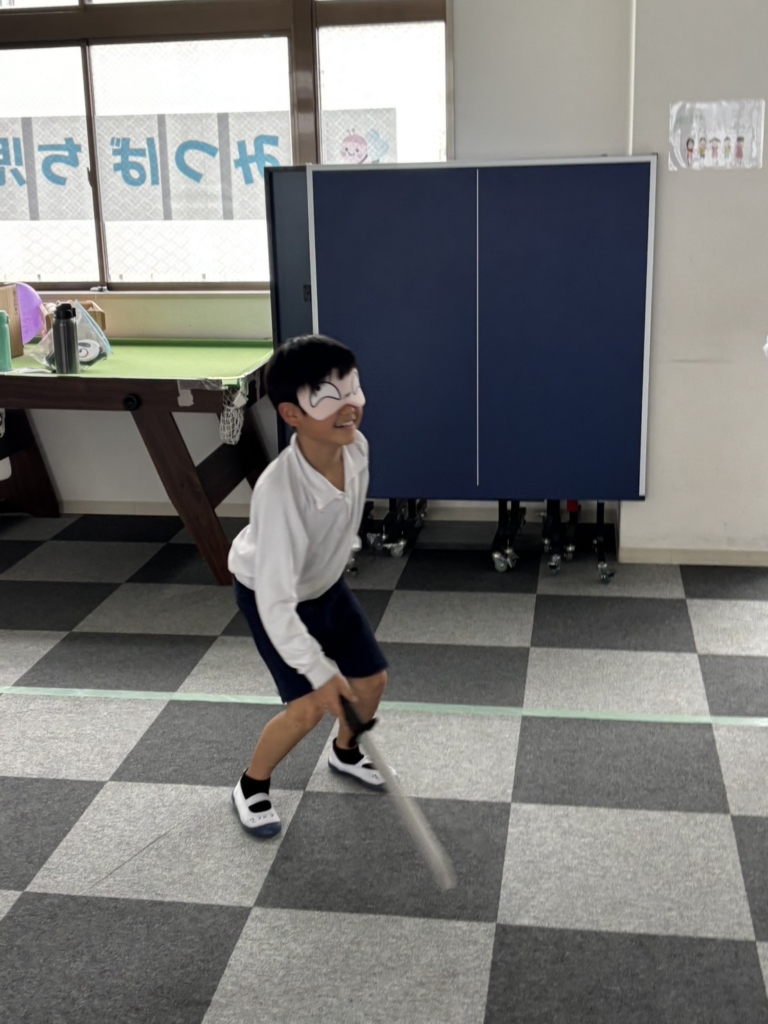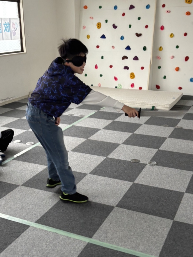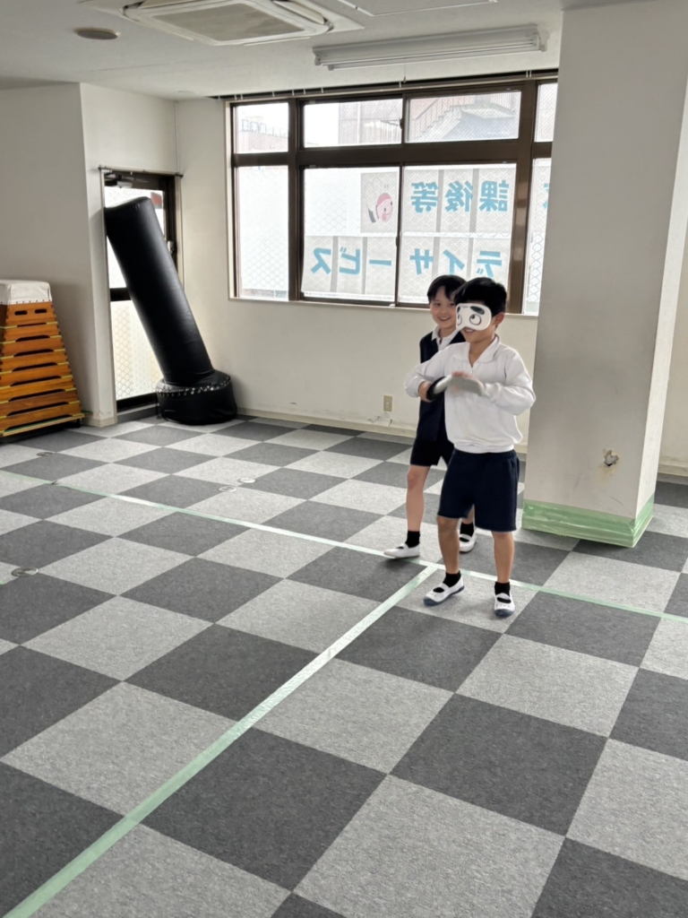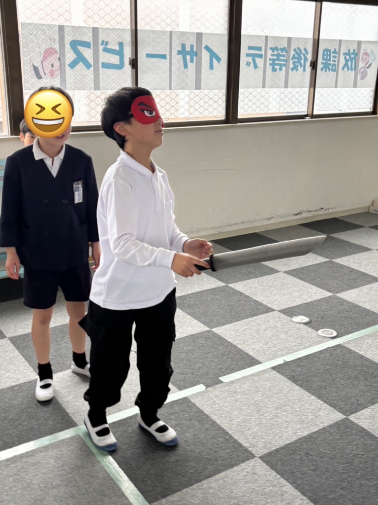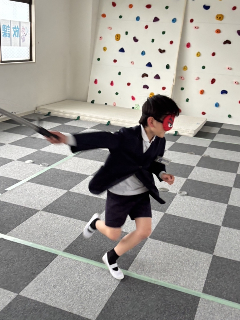広々とした運動施設には、子どもたちの楽しげな笑い声と、「しーっ!」という緊張の合図が交互に響きます。ユニークなアイマスクで目隠しをした子どもたちは、まるで小さな侍。笑