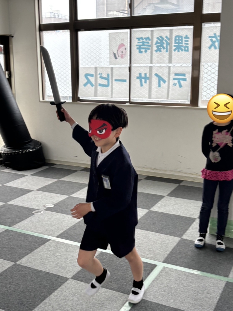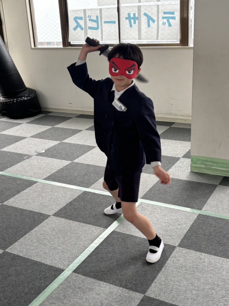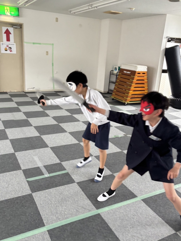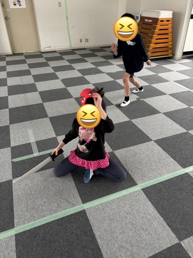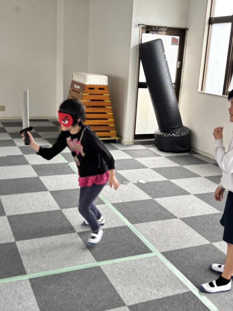広々とした運動施設には、子どもたちの楽しげな笑い声と、「しーっ!」という緊張の合図が交互に響きます。ユニークなアイマスクで目隠しをした子どもたちは、まるで小さな侍。笑