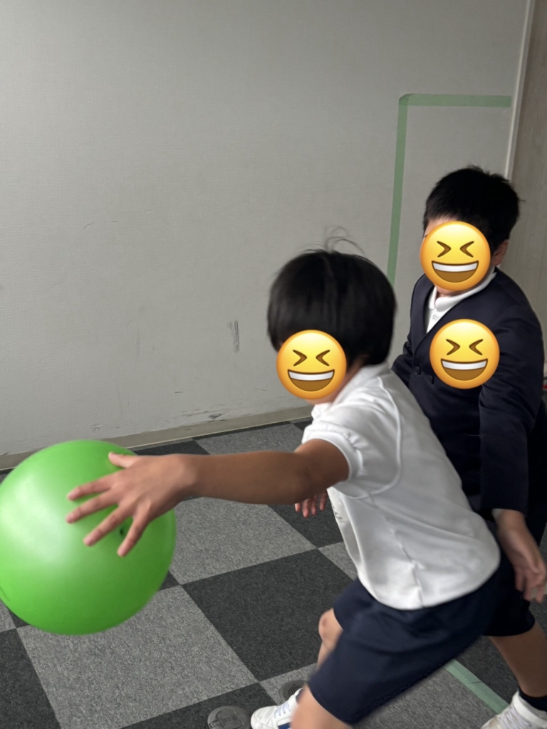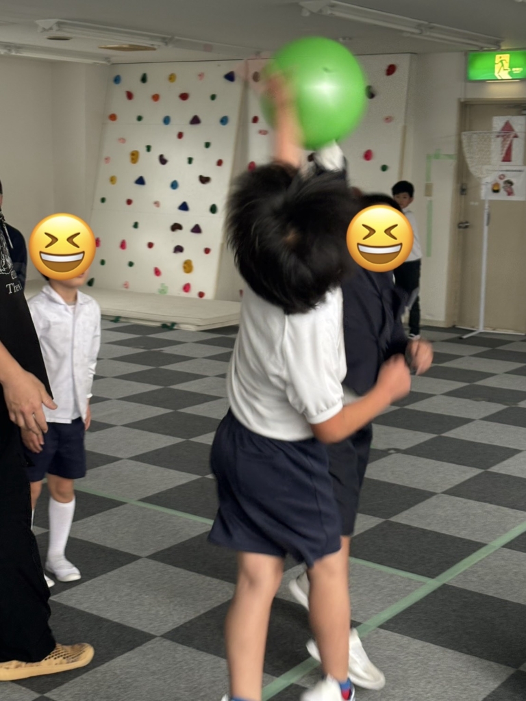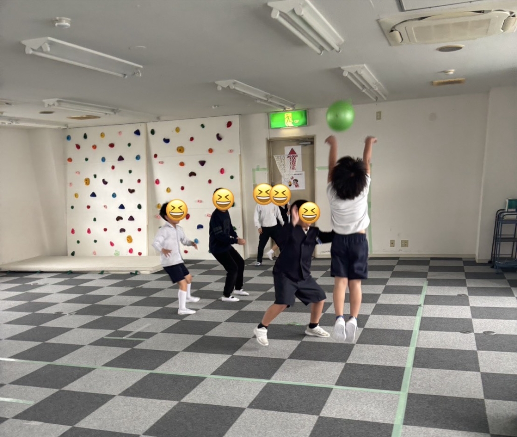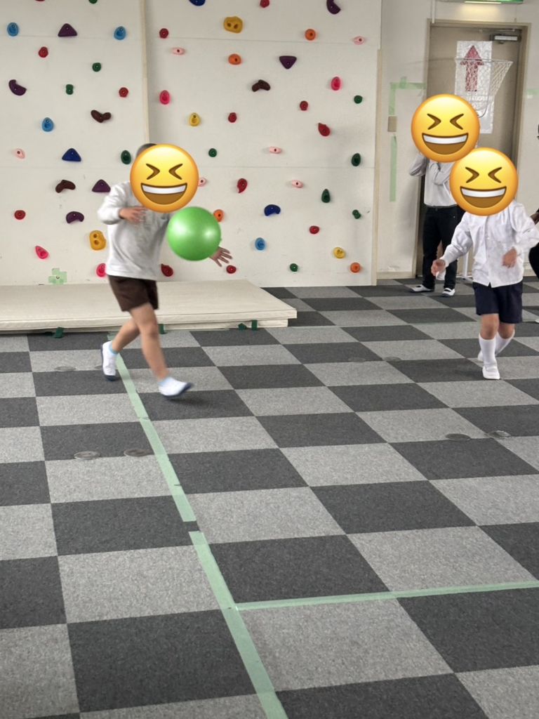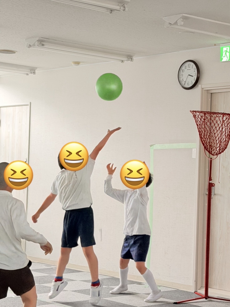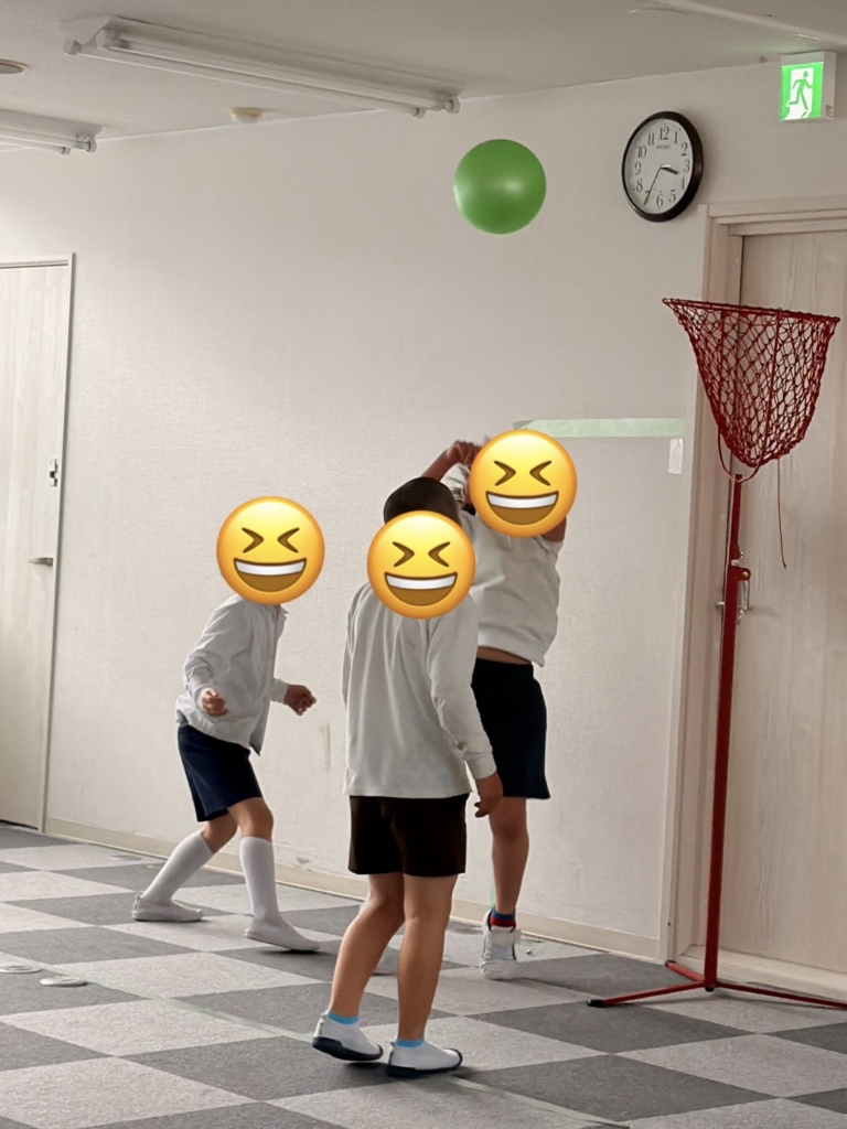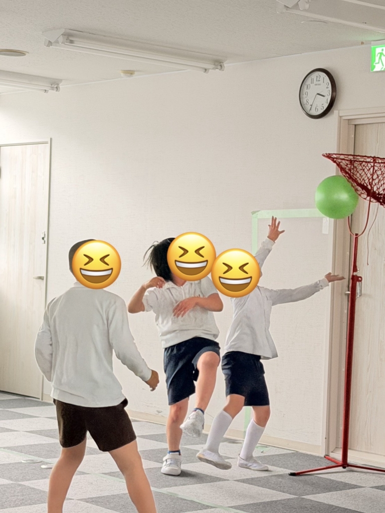運動施設では、初めてバスケットボールに挑戦しました。一生懸命にボールを追いかけ、汗だくになっています。