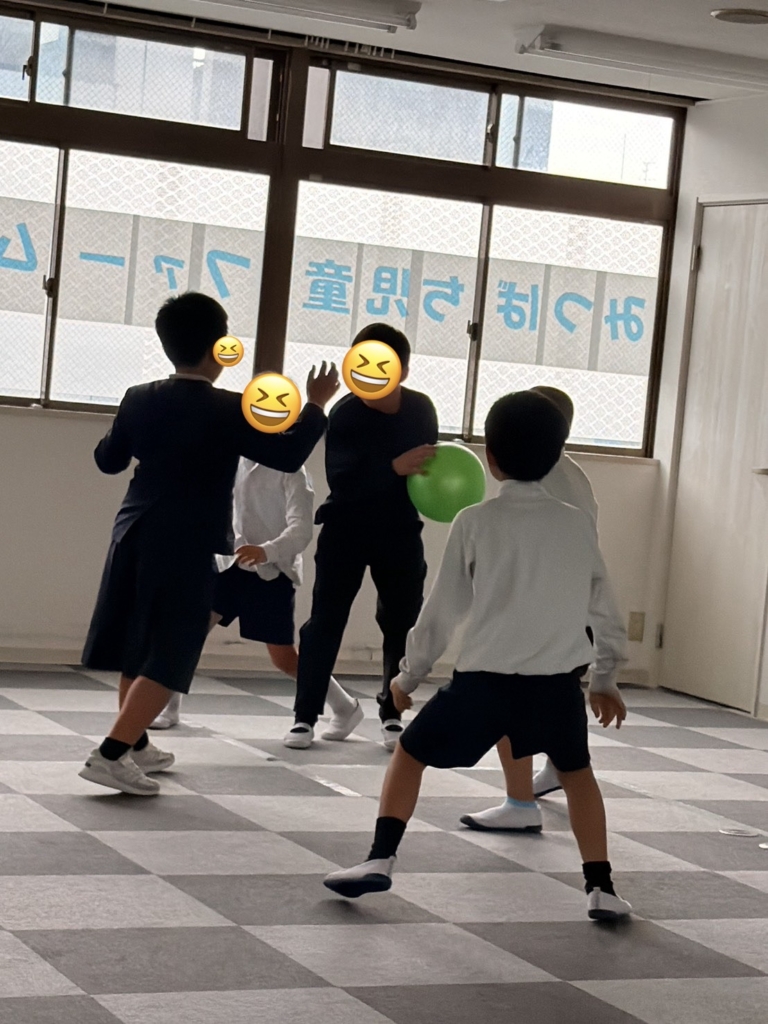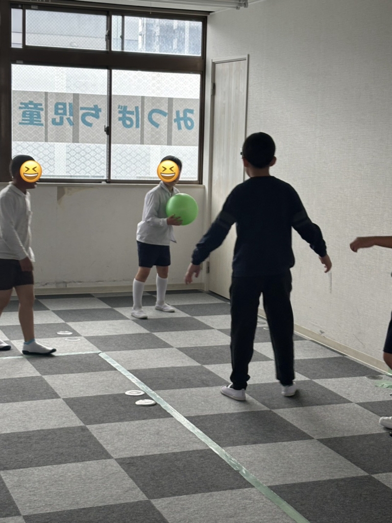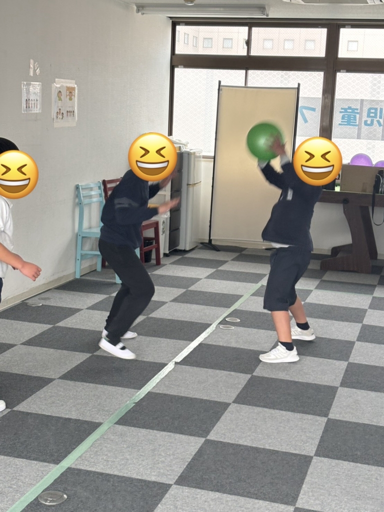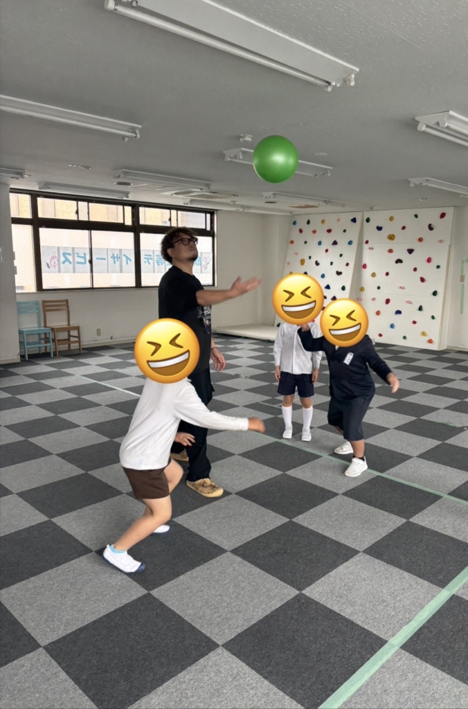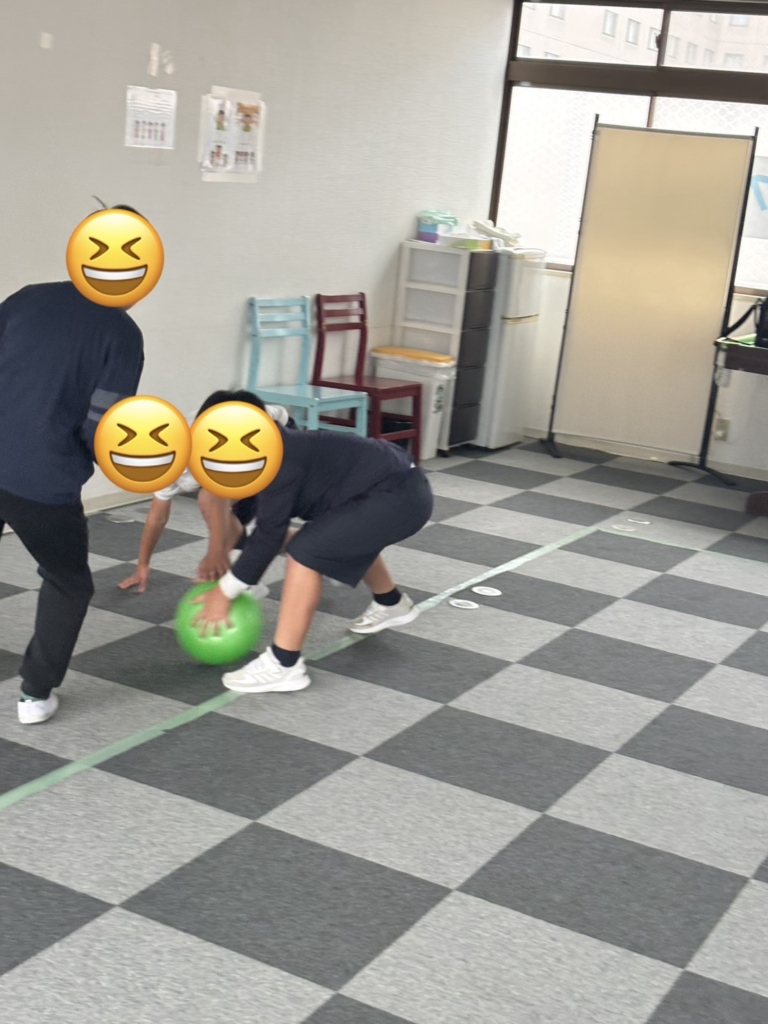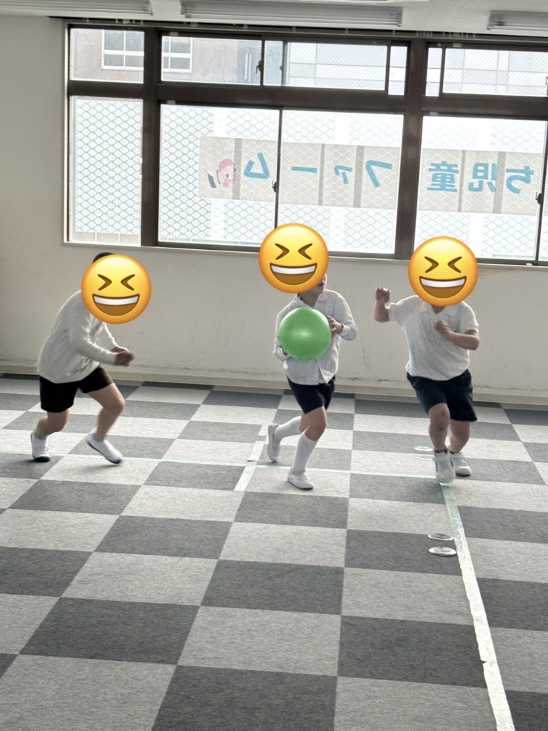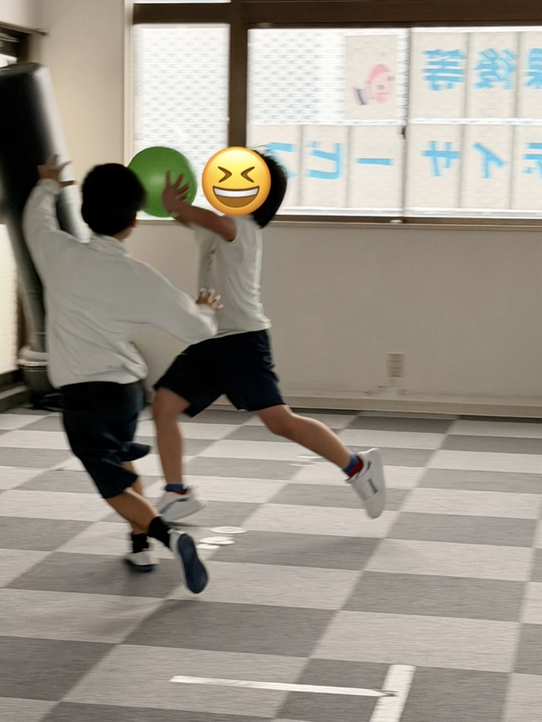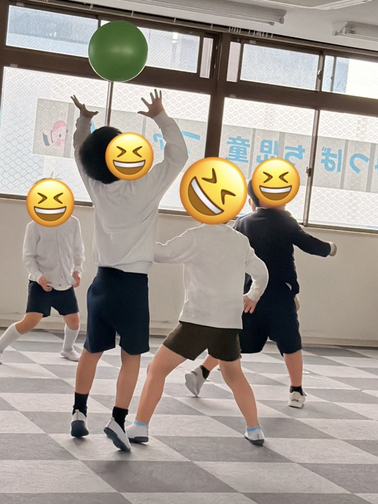 運動施設では、初めてバスケットボールに挑戦しました。一生懸命にボールを追いかけ、汗だくになっています。