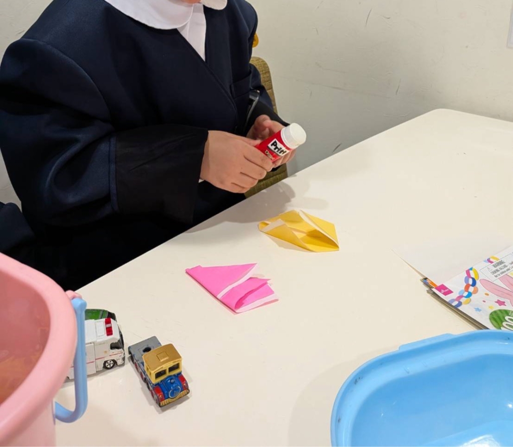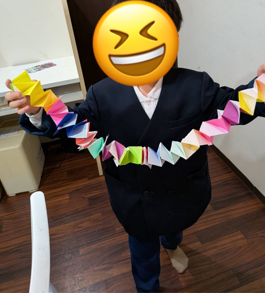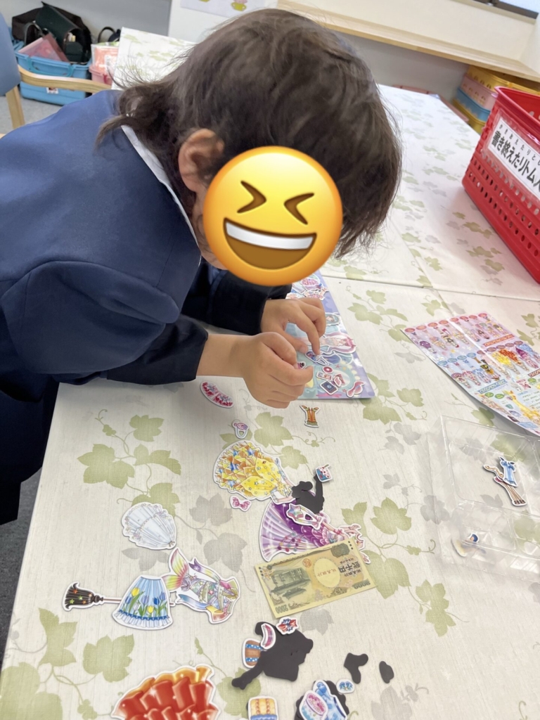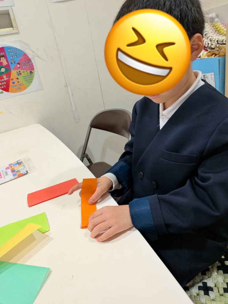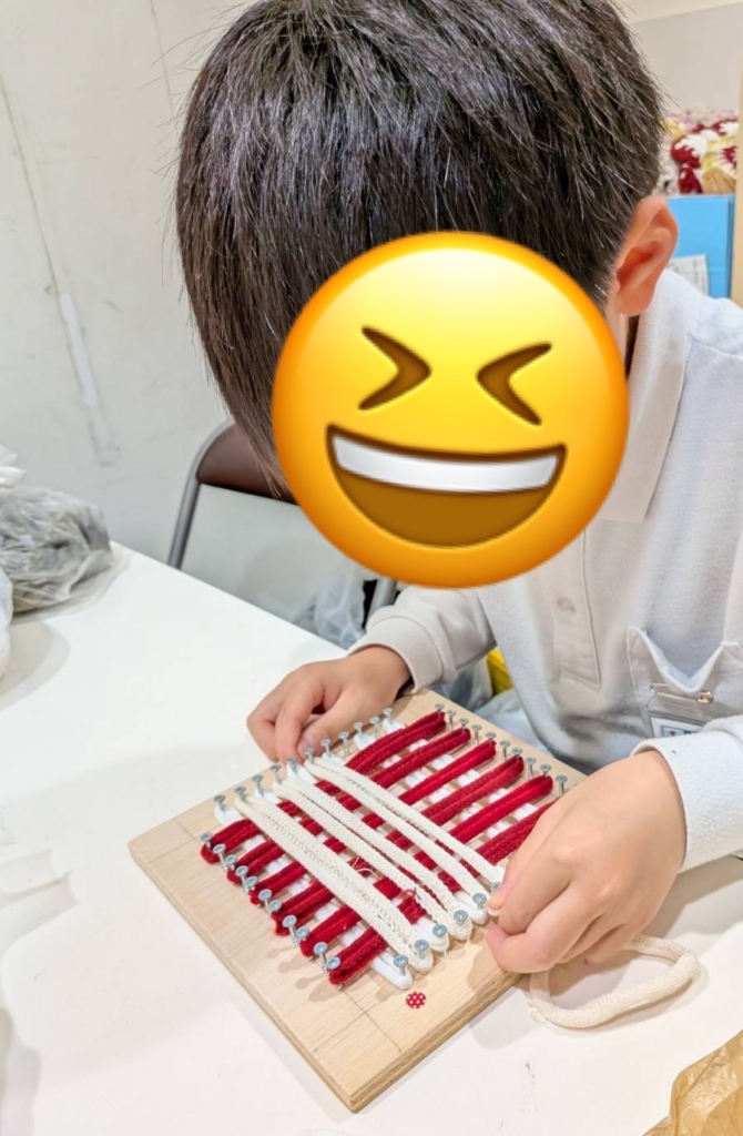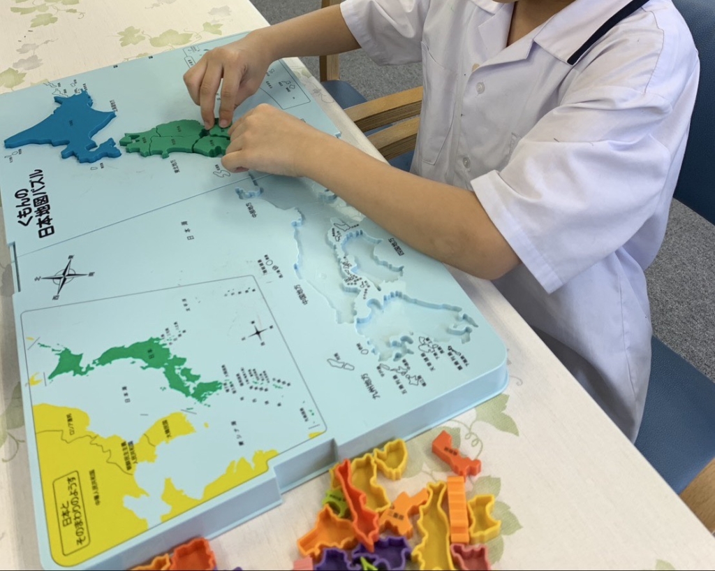 日本地図のパズルでは、複雑な形のピースを一つひとつ丁寧に組み合わせて完成させ、折り紙靴下の輪っかで作るコースター作りといった創作活動でも、自分なりのこだわりを持って熱心に手を動かしていました。
