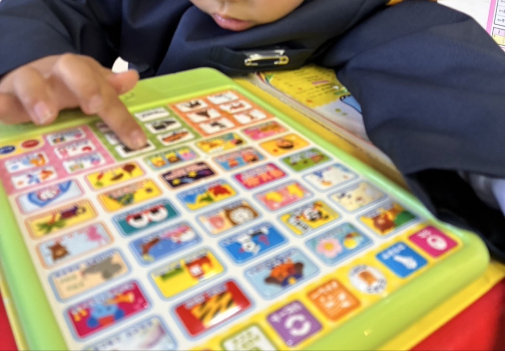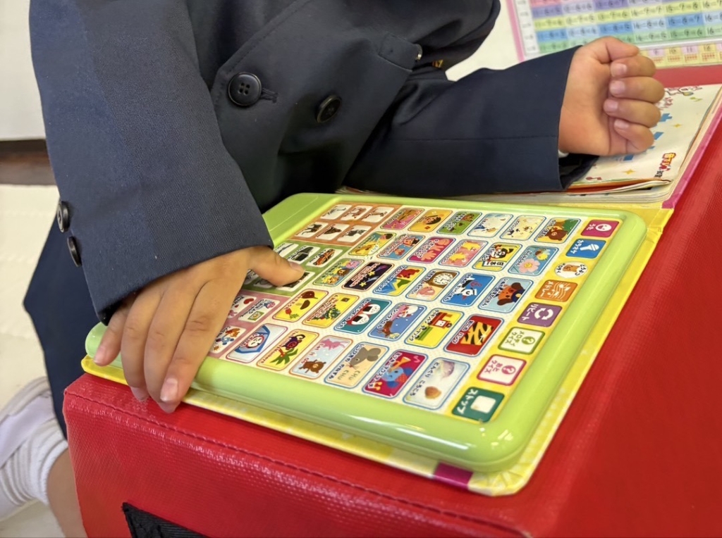 机に向かう時間では、あいうえおタブレット音カルタを使い、指先と耳を研ぎ澄ませて集中していました。
