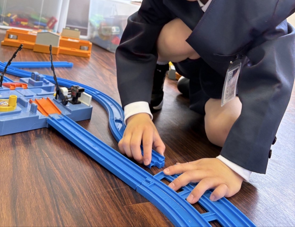 広いスペースでは、プラレールのレールを自由自在に繋げて壮大なコースを作り上げ、電車が走る様子をキラキラした目で見つめていました。