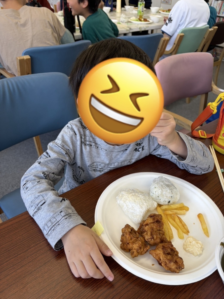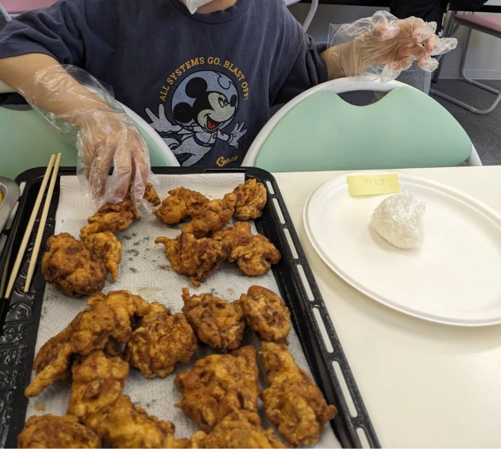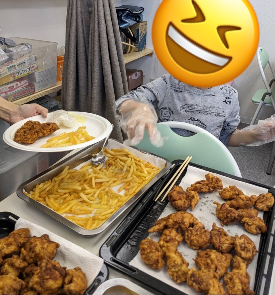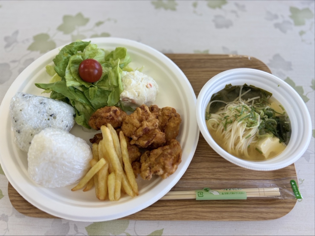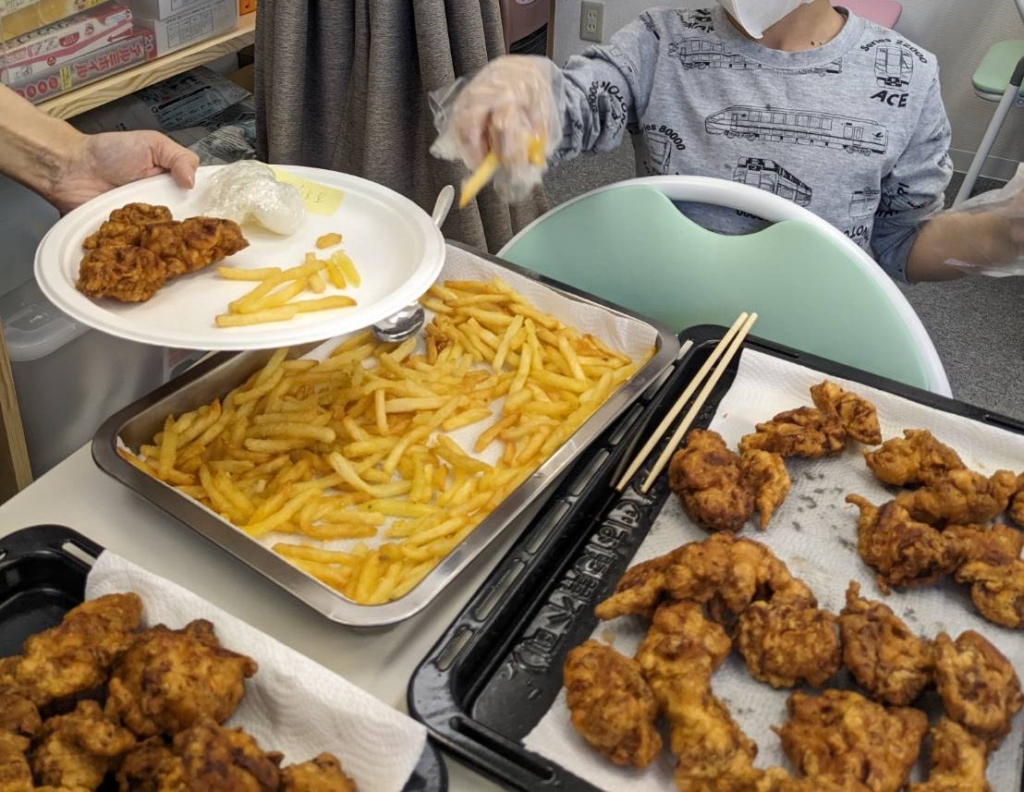 昼食には、みんなで協力して作る「お祝いランチ」メインは子どもたちに大人気の唐揚げとポテト、そして栄養たっぷりのポテトサラダとお豆腐・ワカメ・素麺の入ったお味噌汁です。