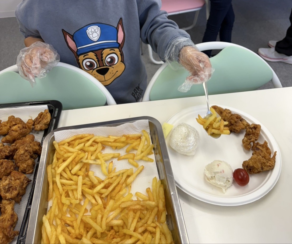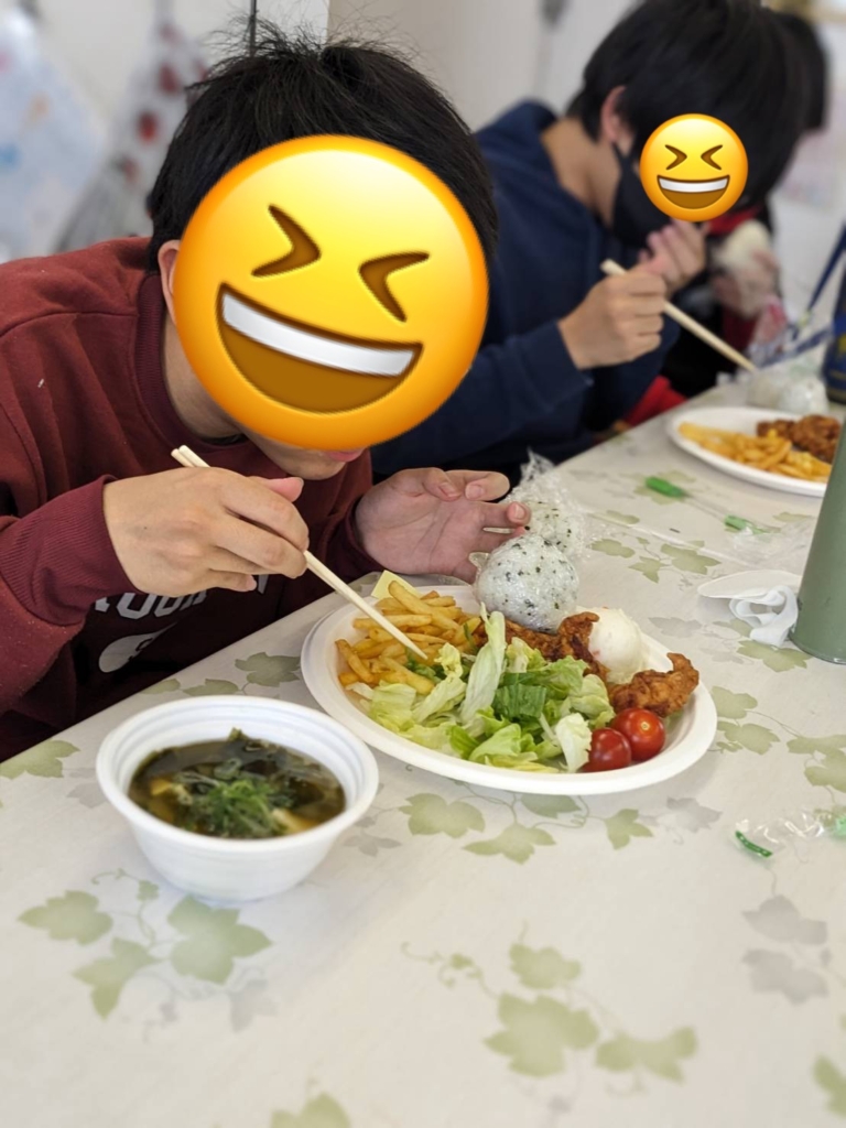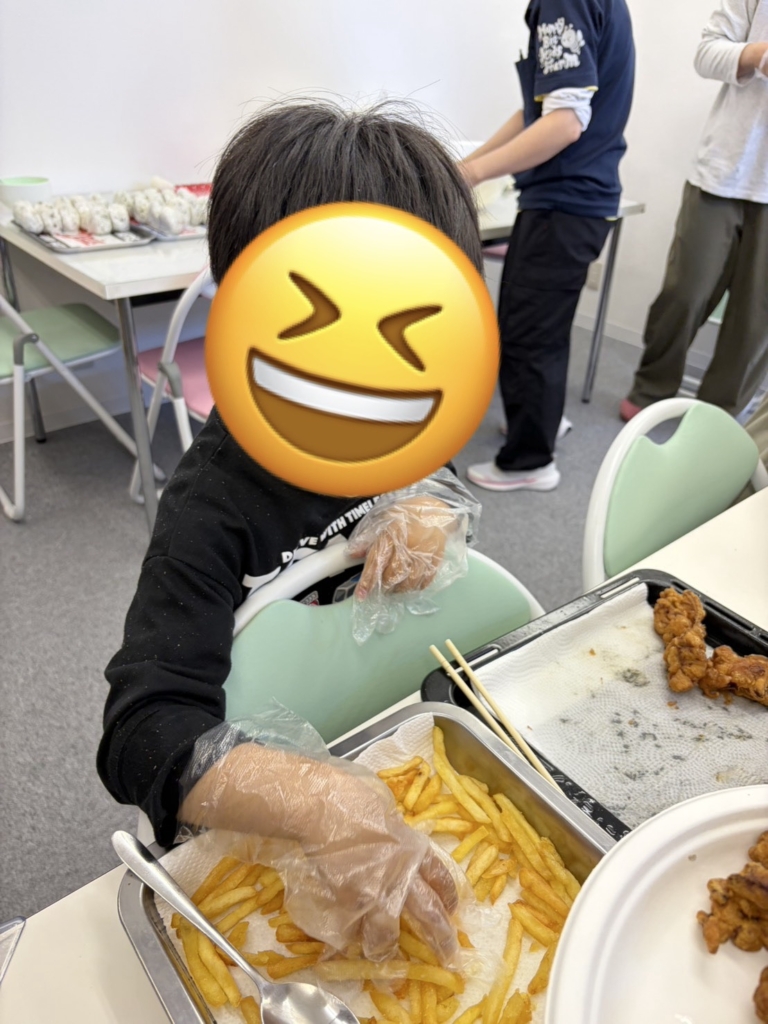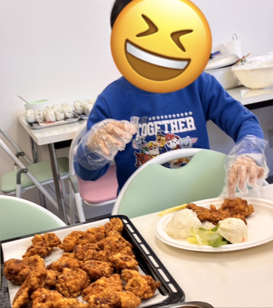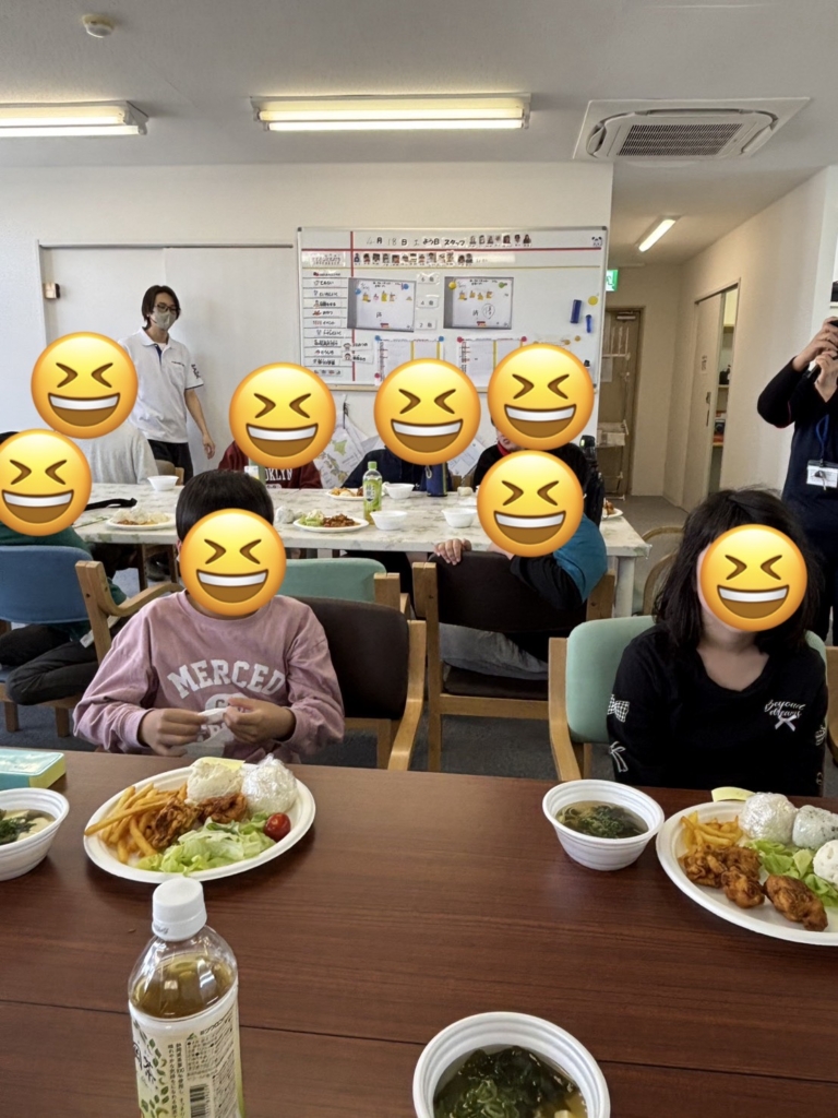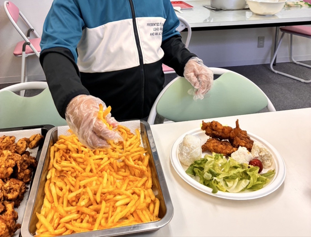 昼食には、みんなで協力して作る「お祝いランチ」メインは子どもたちに大人気の唐揚げとポテト、そして栄養たっぷりのポテトサラダとお豆腐・ワカメ・素麺の入ったお味噌汁です。