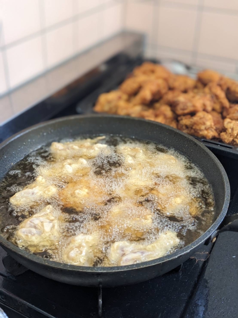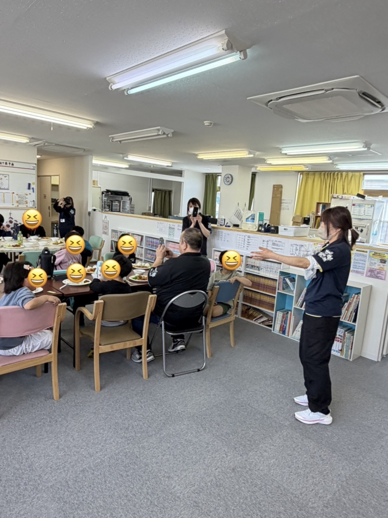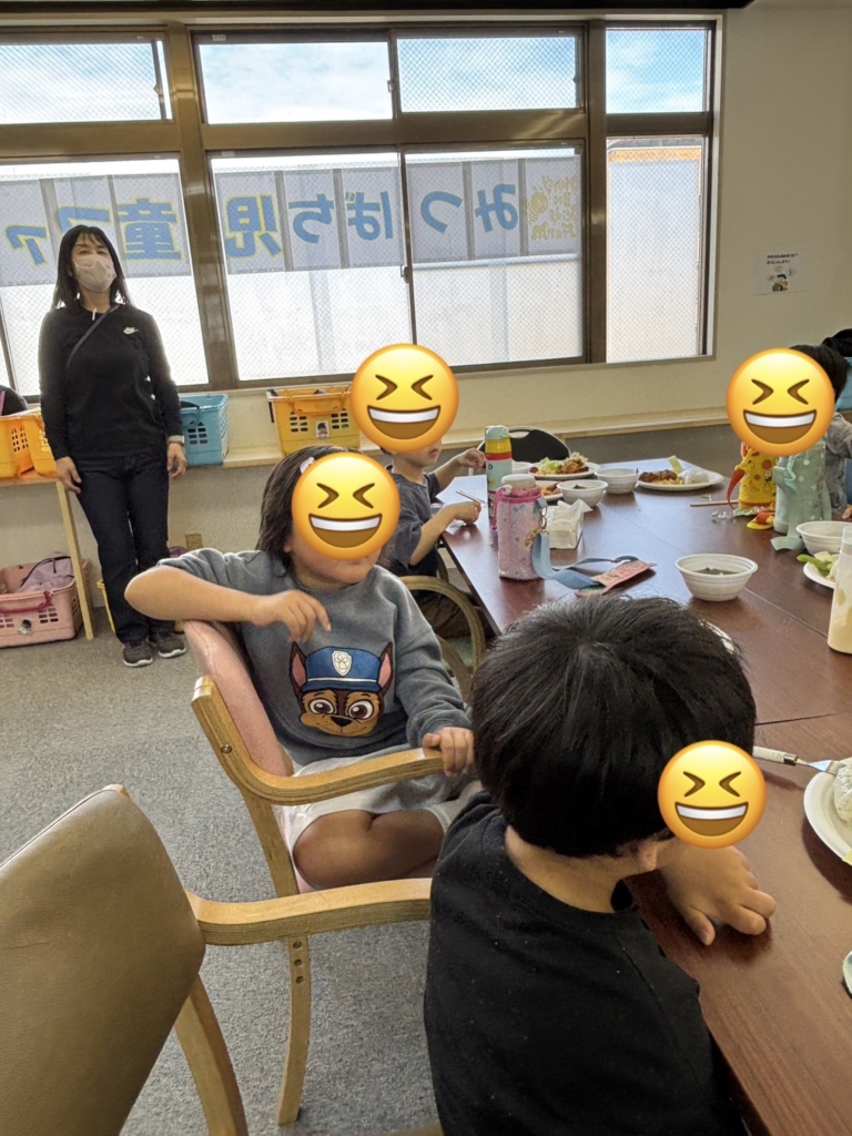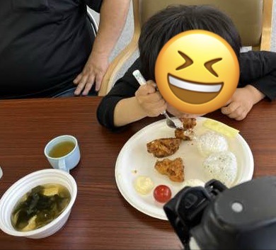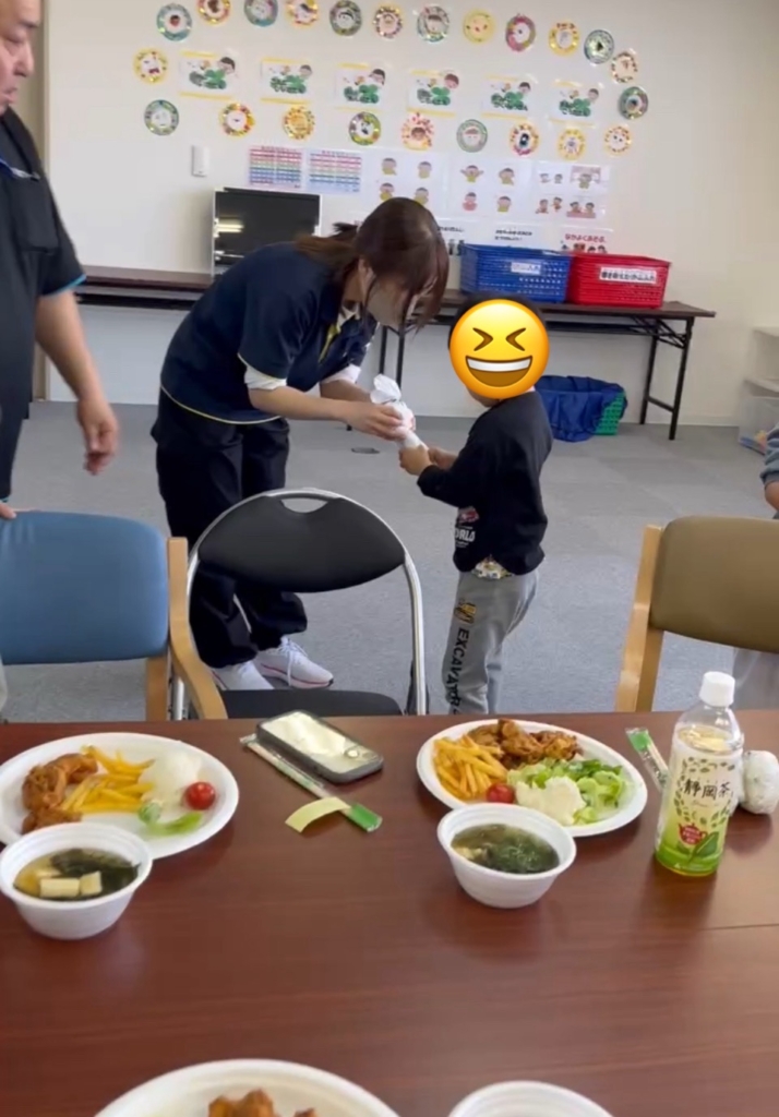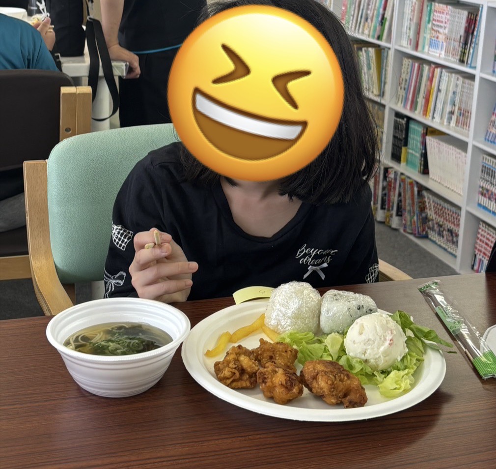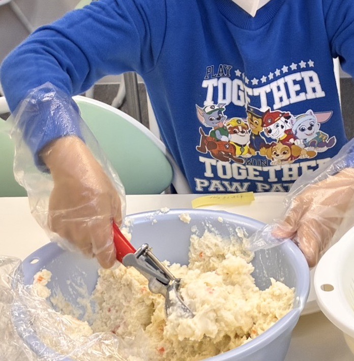 昼食には、みんなで協力して作る「お祝いランチ」メインは子どもたちに大人気の唐揚げとポテト、そして栄養たっぷりのポテトサラダとお豆腐・ワカメ・素麺の入ったお味噌汁です。