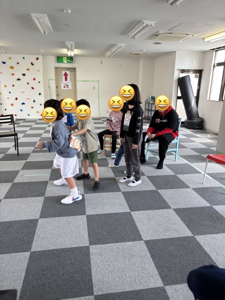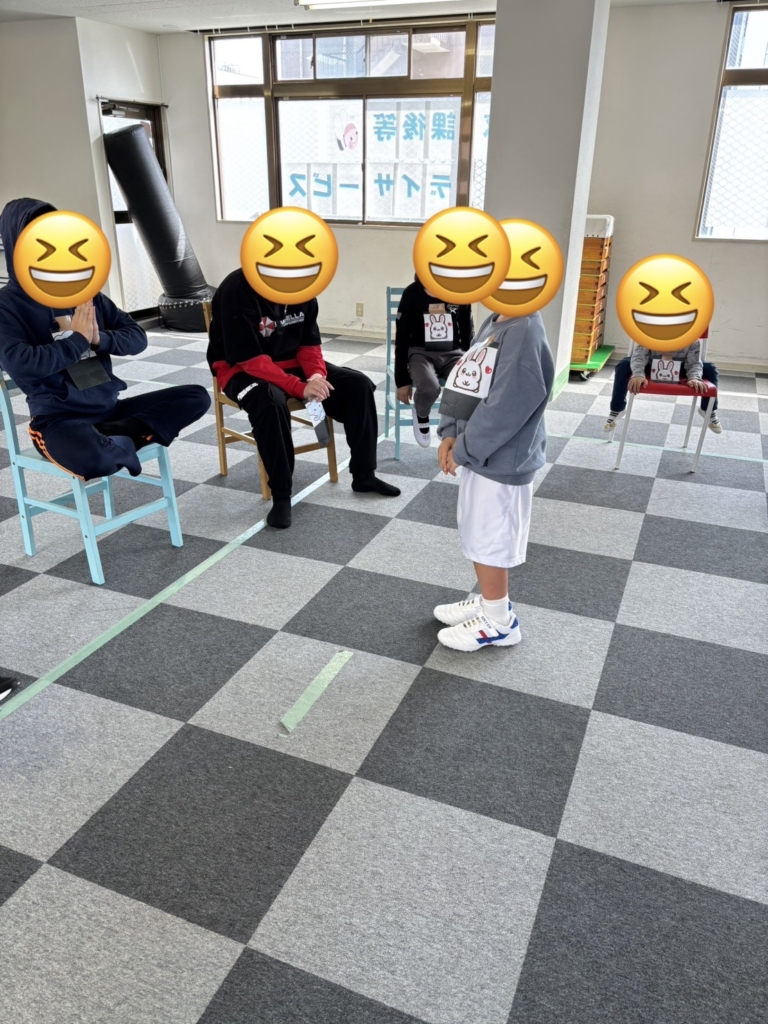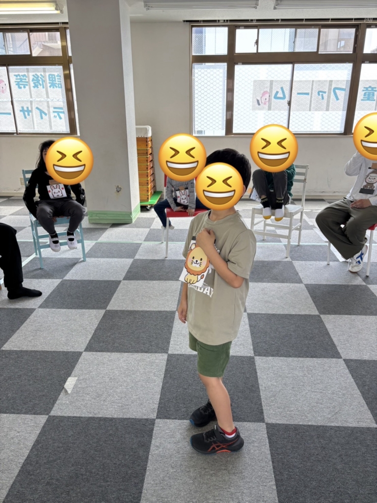 🦍・🐰・🦁・🐘の動物が描かれた紙を体に貼り、自分の動物の名前が呼ばれたり、「全員!」と言われたら全員が別の椅子に座るルールで行いました。