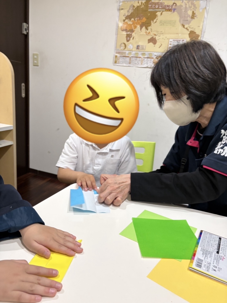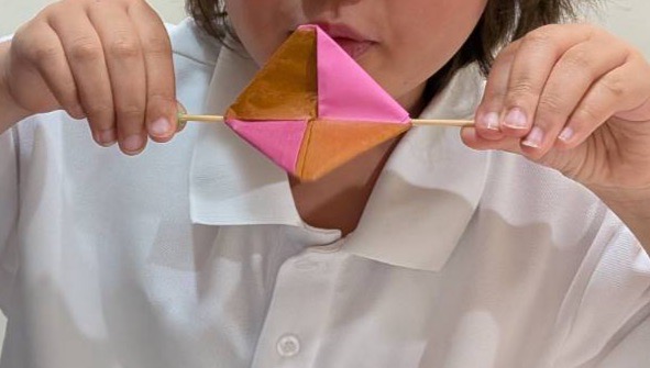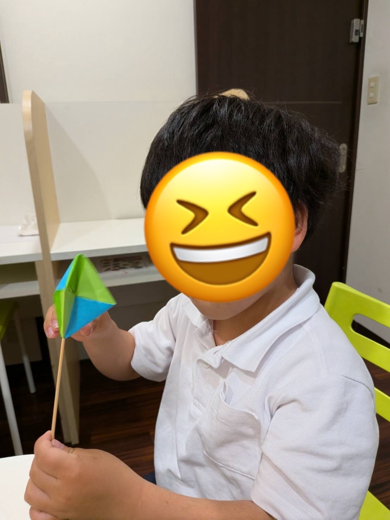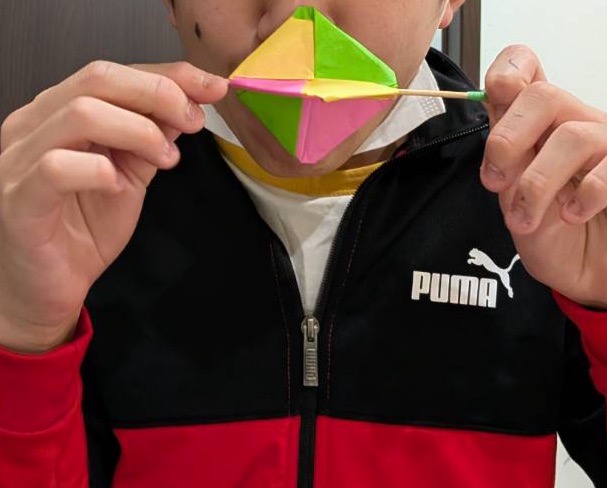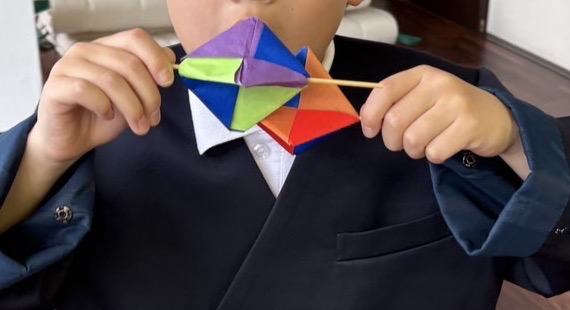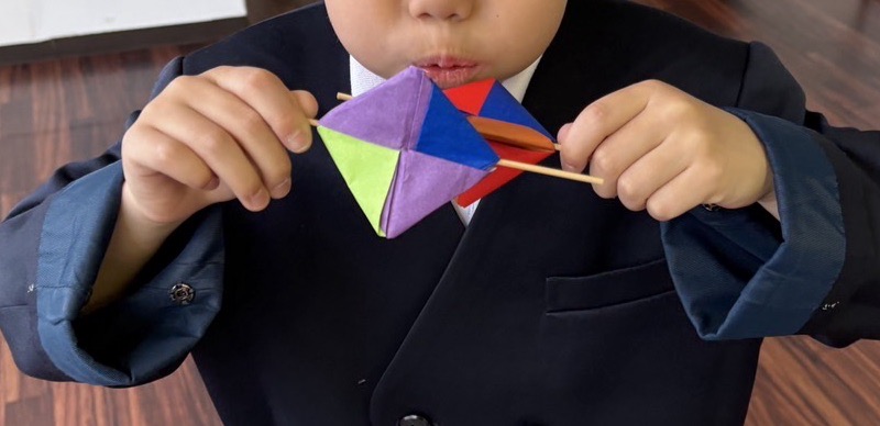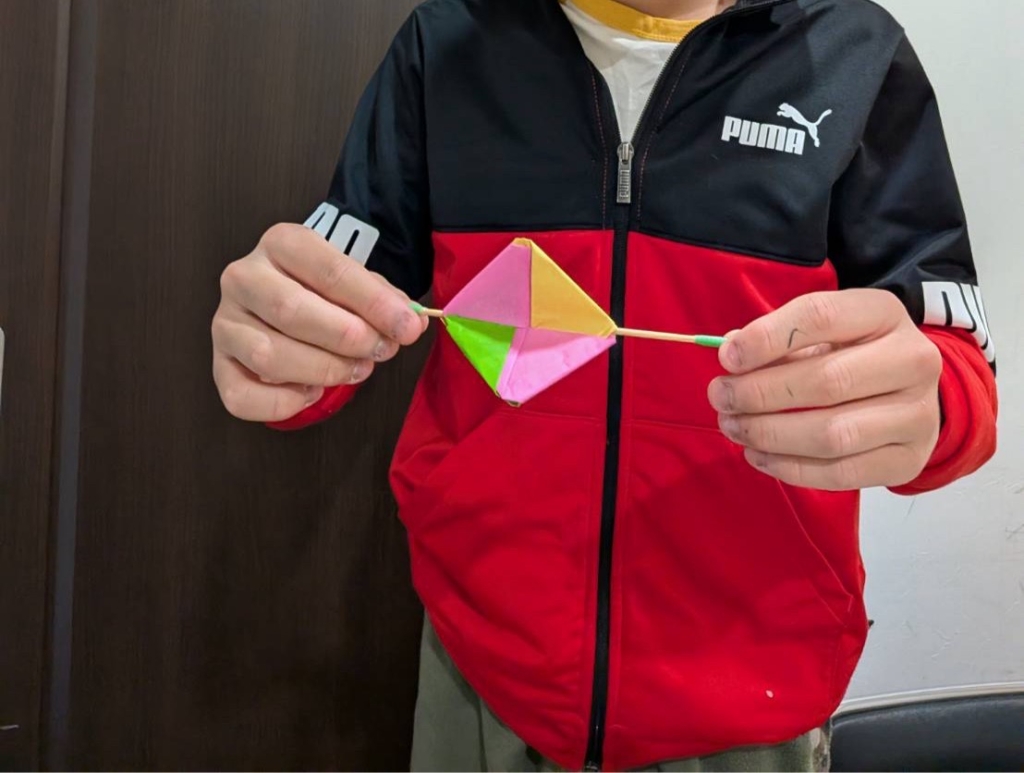 折り紙では「角と角を合わせる」「アイロン(折り目)をピシッとかける」といった繊細な作業に挑戦。仕上げに串を刺して、自分だけの風車が完成!